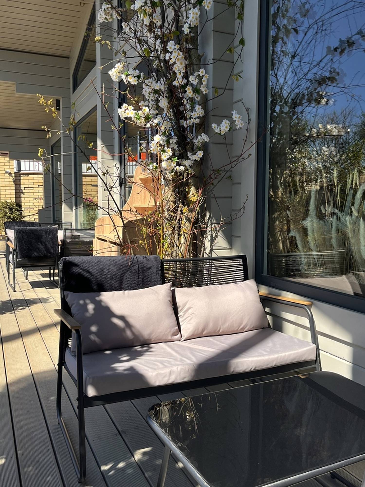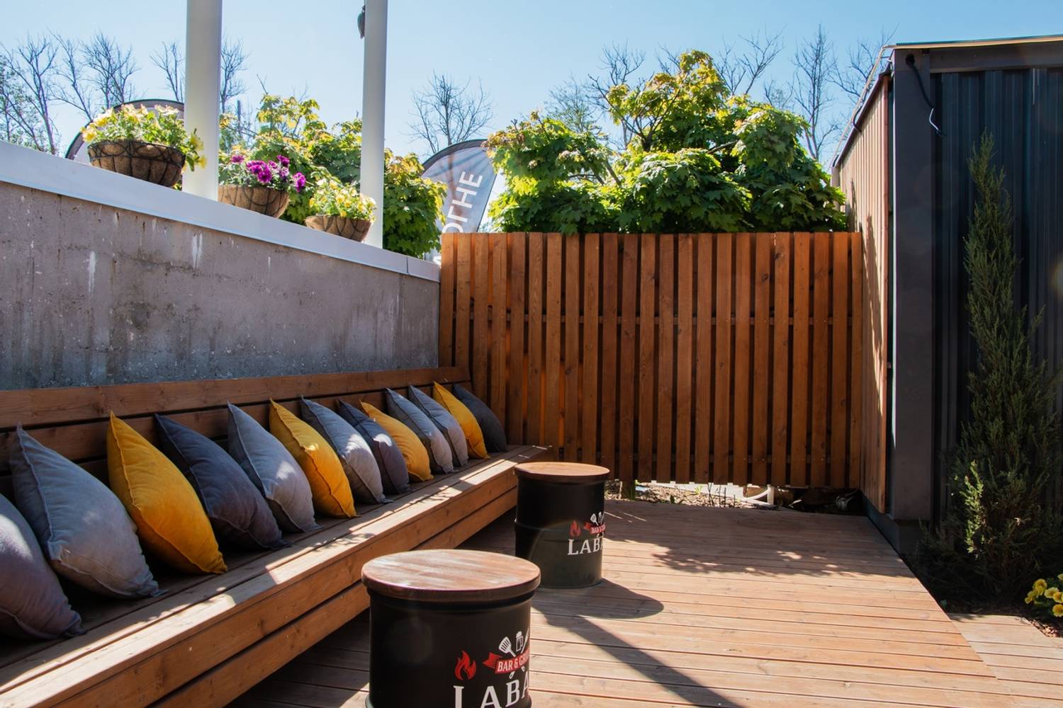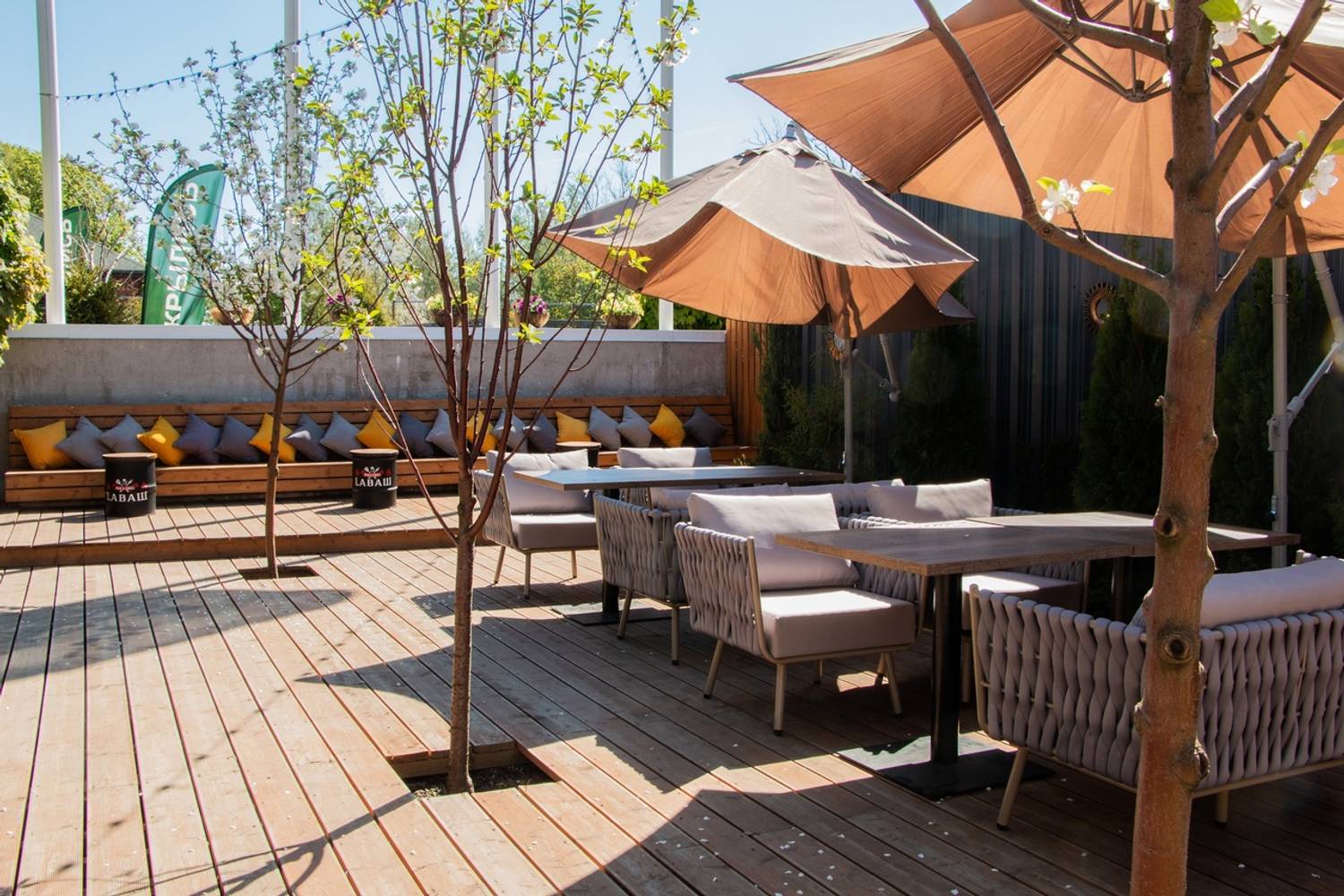 Атмосфера. Вы словно оказались на даче: пространство в стиле загородного дома со светлой деревянной отделкой, камином, дизайнерскими светильниками и живыми растениями. Также на территории расположен открытый бассейн, зеленые зоны и детская игровая площадка.