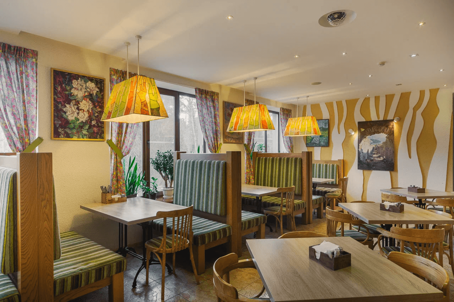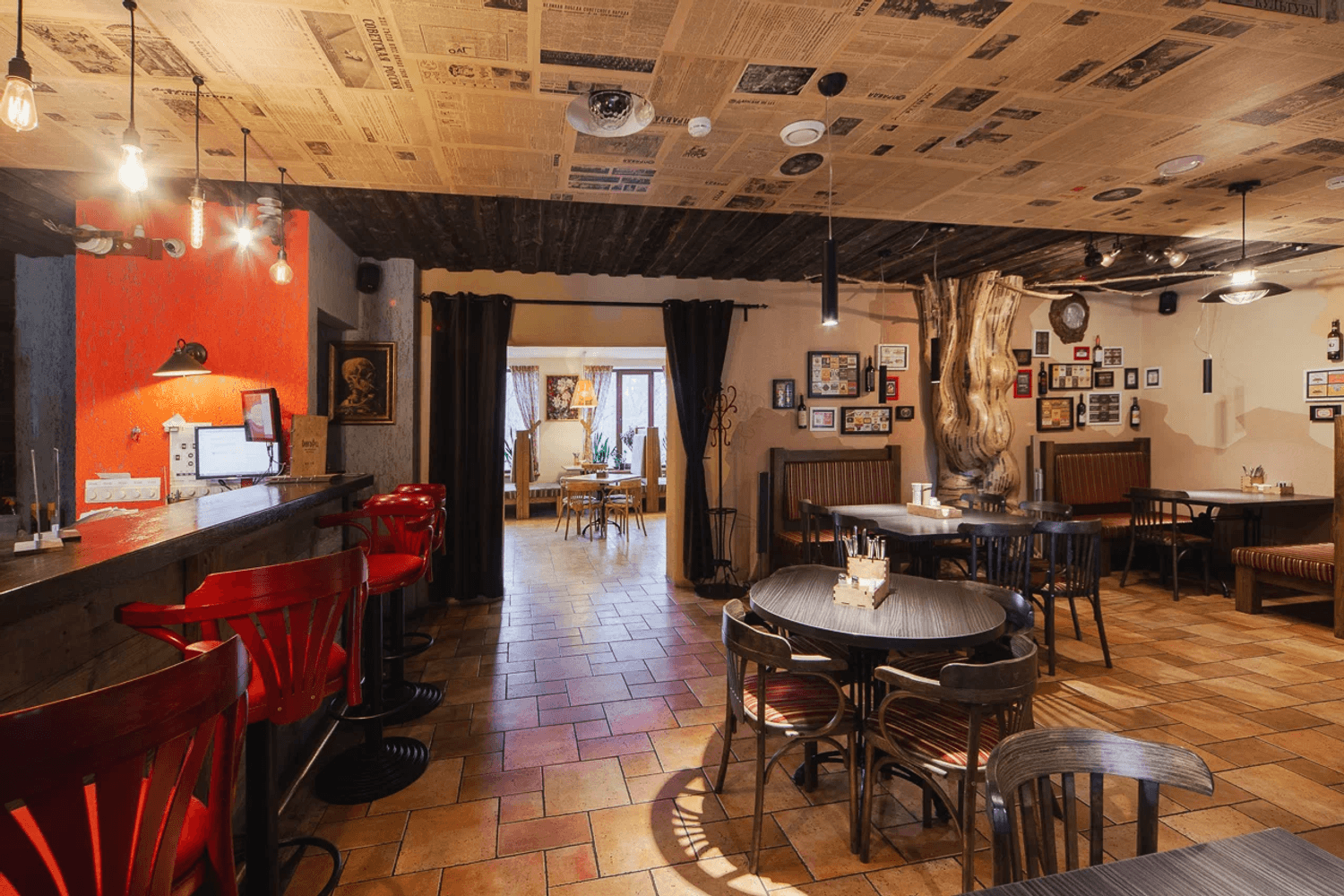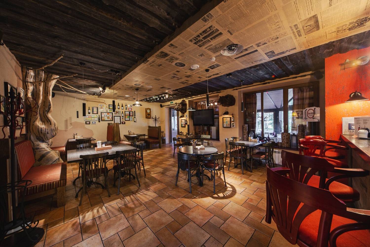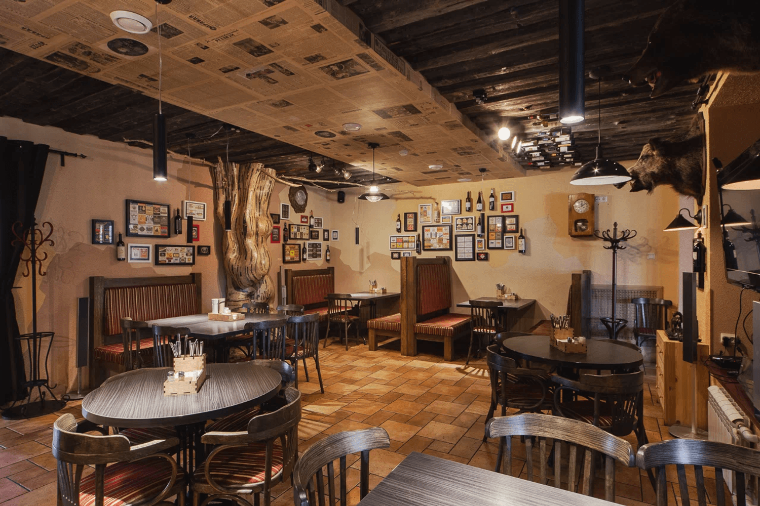 Атмосфера. Два зала в стиле усадьбы с темной деревянной мебелью, зелеными акцентами и естественным освещением. Детали вроде часов в деревянном обрамлении и головы медведя на стене усиливают ощущение загородного охотничьего дома. Летом гости могут разместиться на террасе или в парковом шатре.