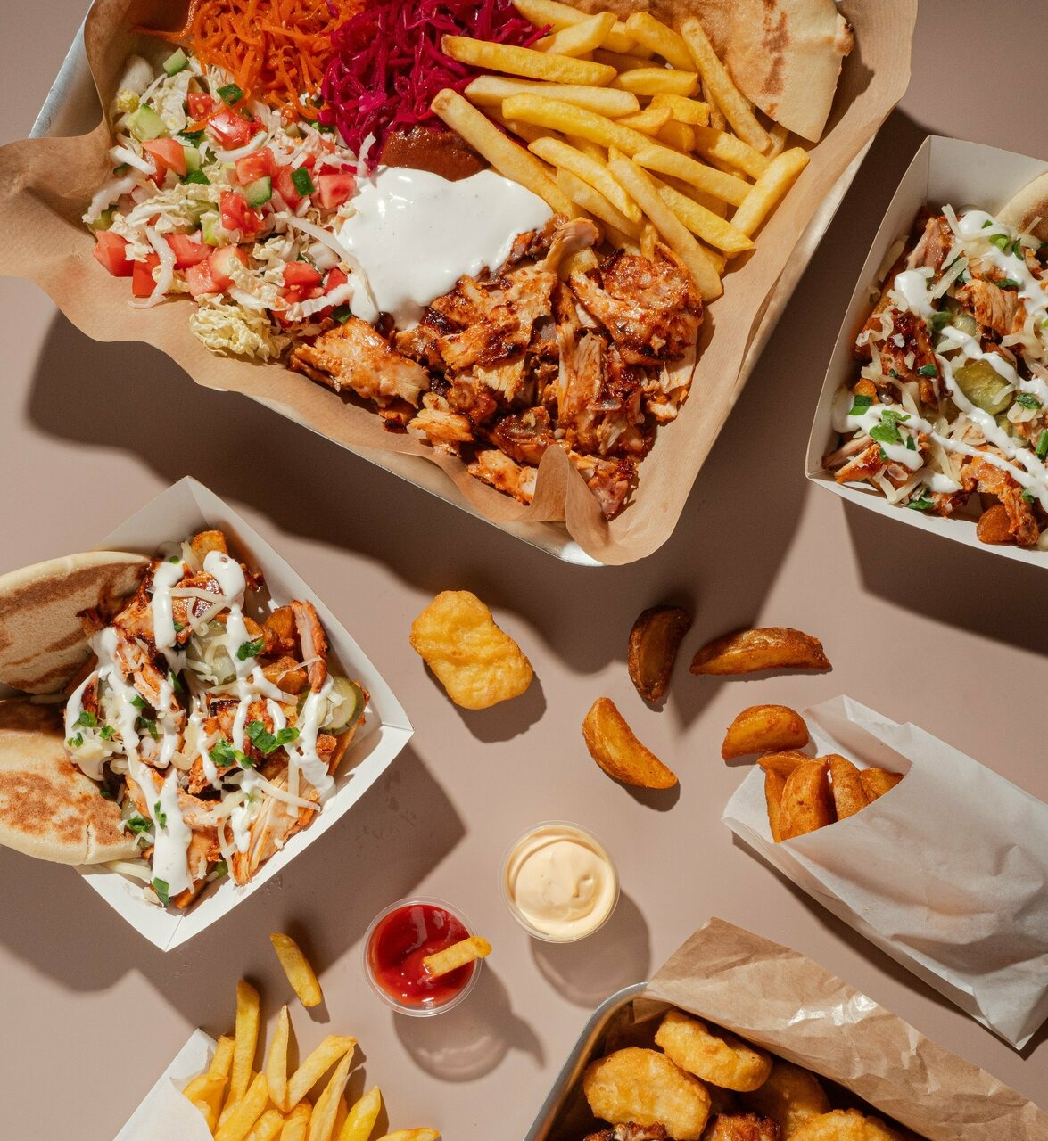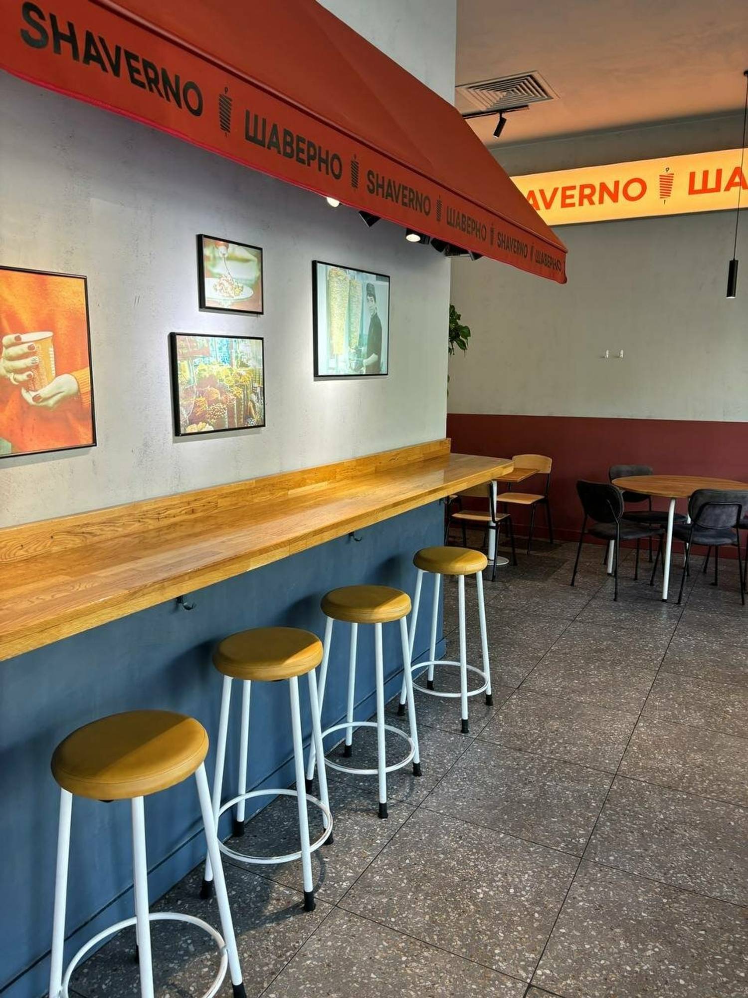 Еда и напитки. В меню — шаверма в двух размерах с начинками на выбор: грибная, сырная, с колбасками, брискетом или креветками. Формат подачи — в лаваше, пите или на тарелке. Дополняют ассортимент донеры, салаты, комбо-наборы и напитки.