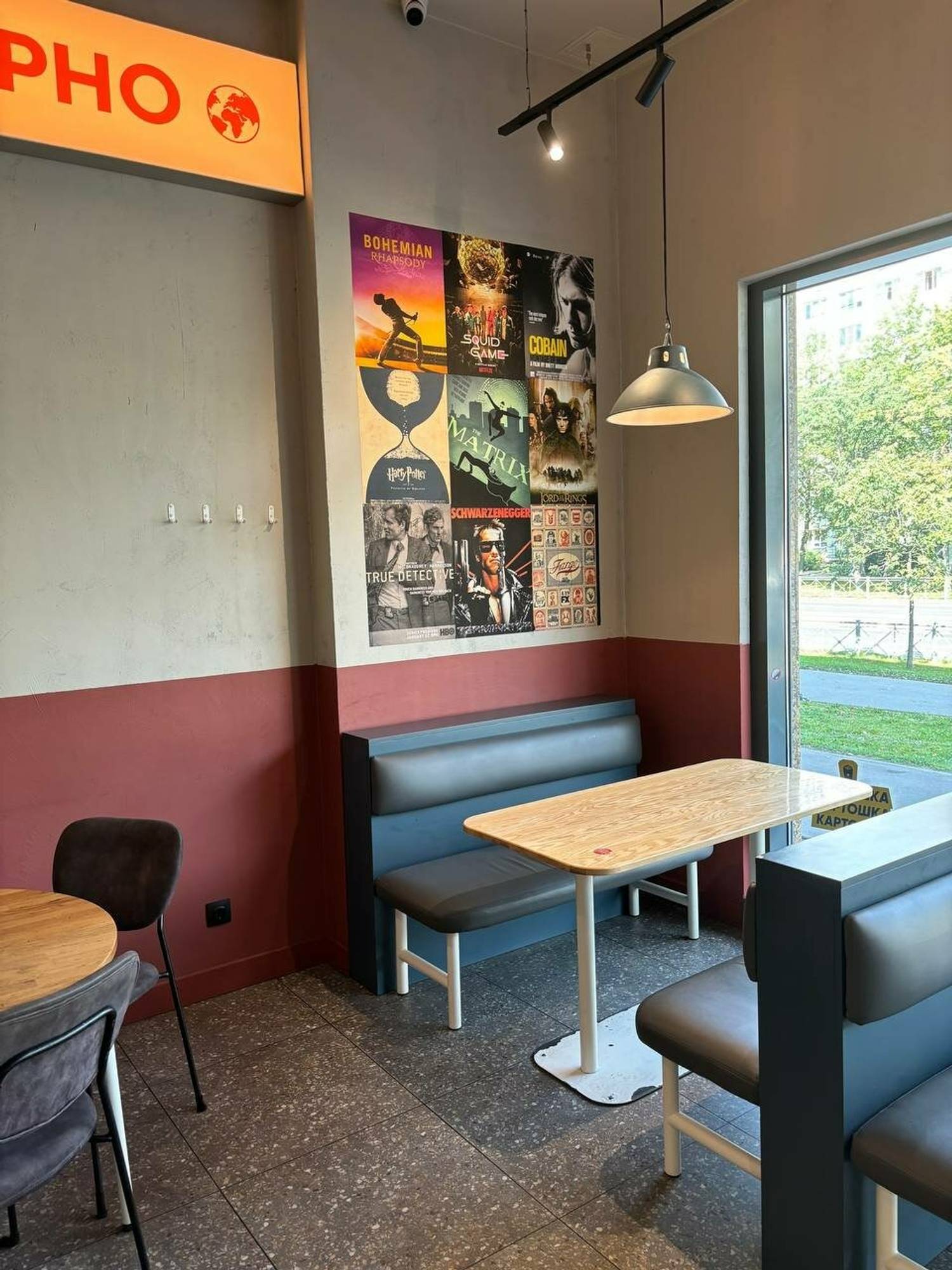 Атмосфера. Лаконичный интерьер с высоким столом у стены с фотографиями в деревянных рамах. Также есть привычная посадка за деревянными столами и мягкими стульями.