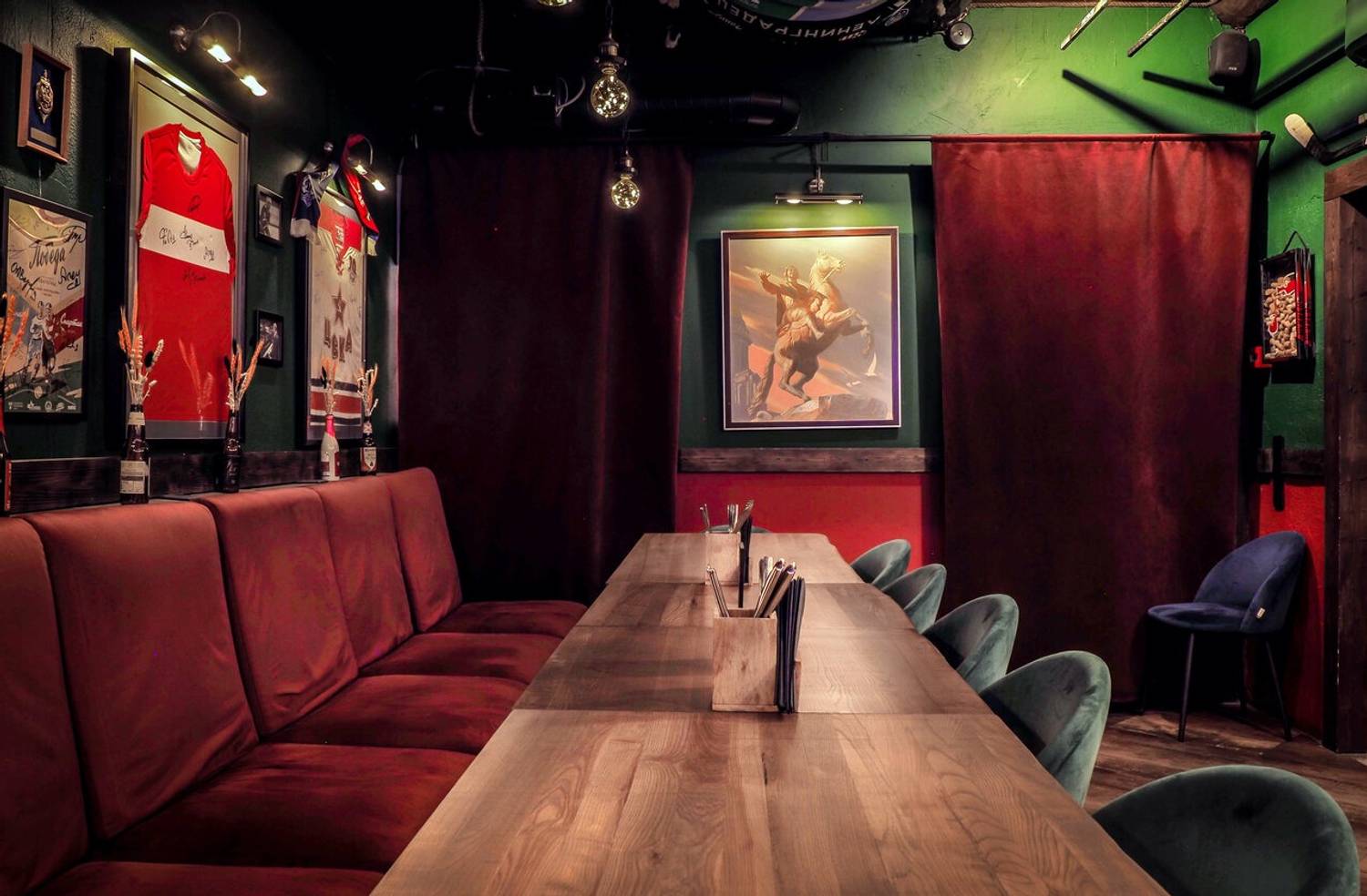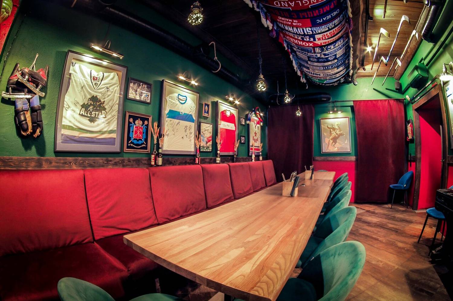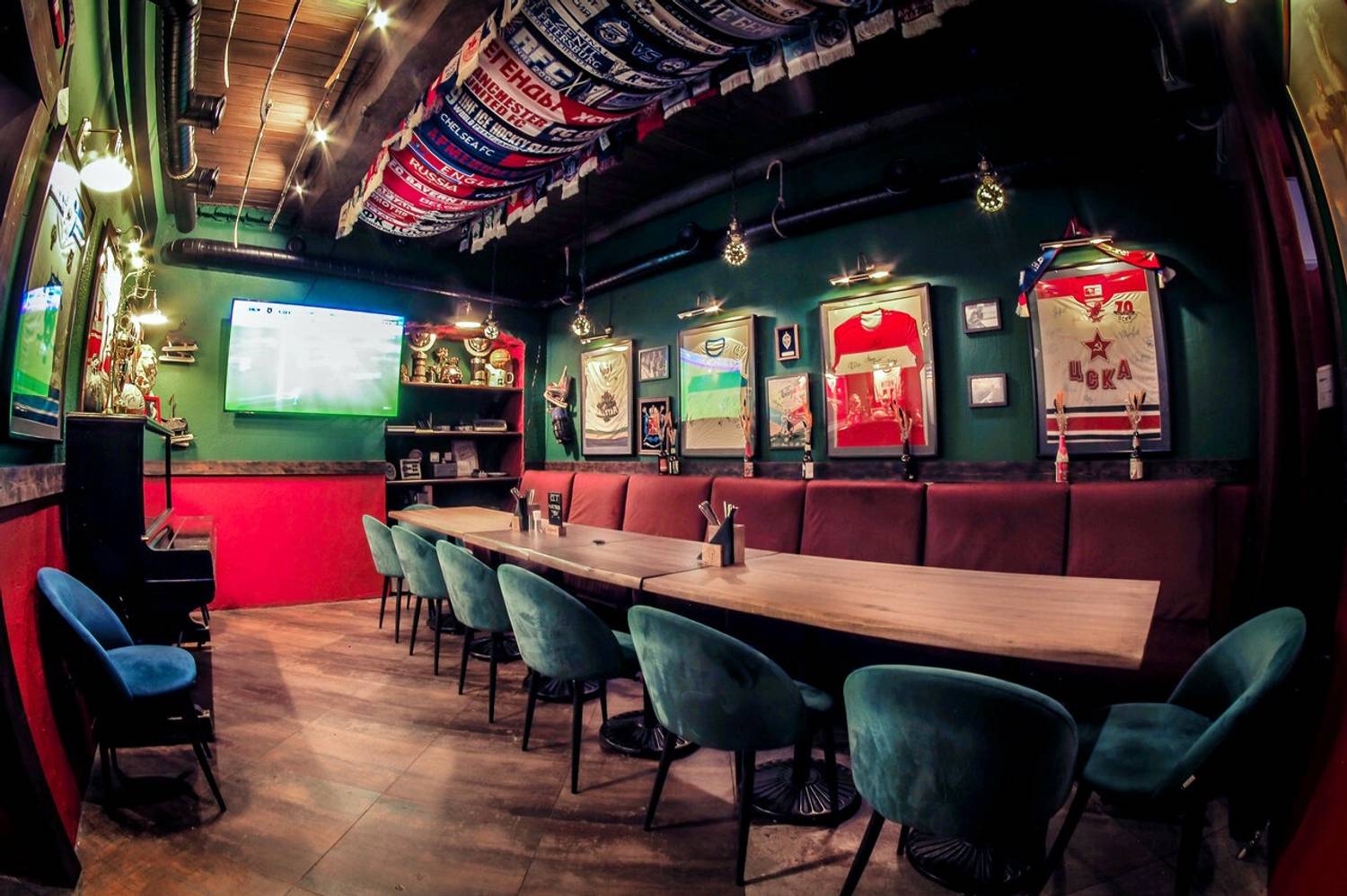 Атмосфера. Дизайн похож на коллаж из разных десятилетий: венские стулья из темного дерева соседствуют, советские плакаты и фотографиями известных футболистов. Центром пространства стала барная стойка с неоновой вывеской «Здесь мечта». Сюда приходят смотреть трансляции, а летом еще и слушать живую музыку.