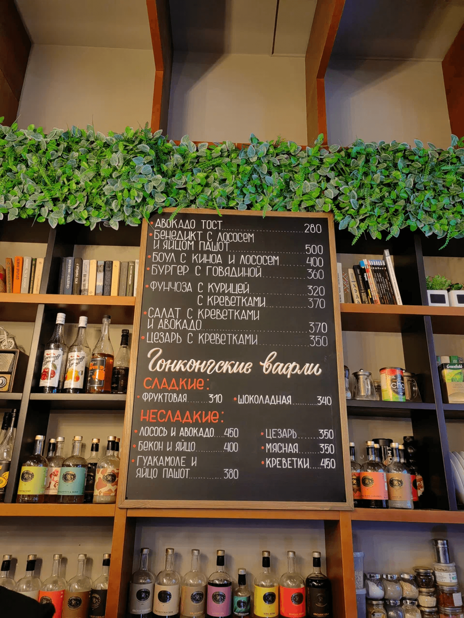 Еда и напитки. В меню — сэндвичи, паста и фирменные гонконгские вафли с фруктами, шоколадом или лососем. Из напитков стоит попробовать крафтовый чай: облепиховый, смородиновый или латте с матчей, а также авторский кофе и молочные коктейли.