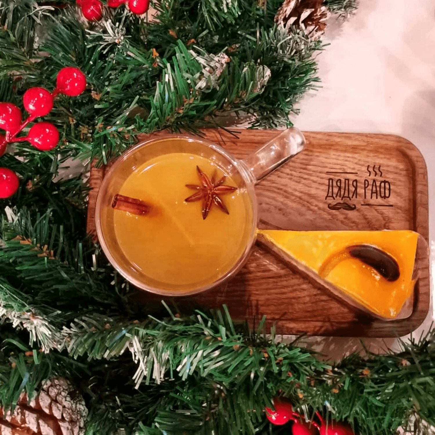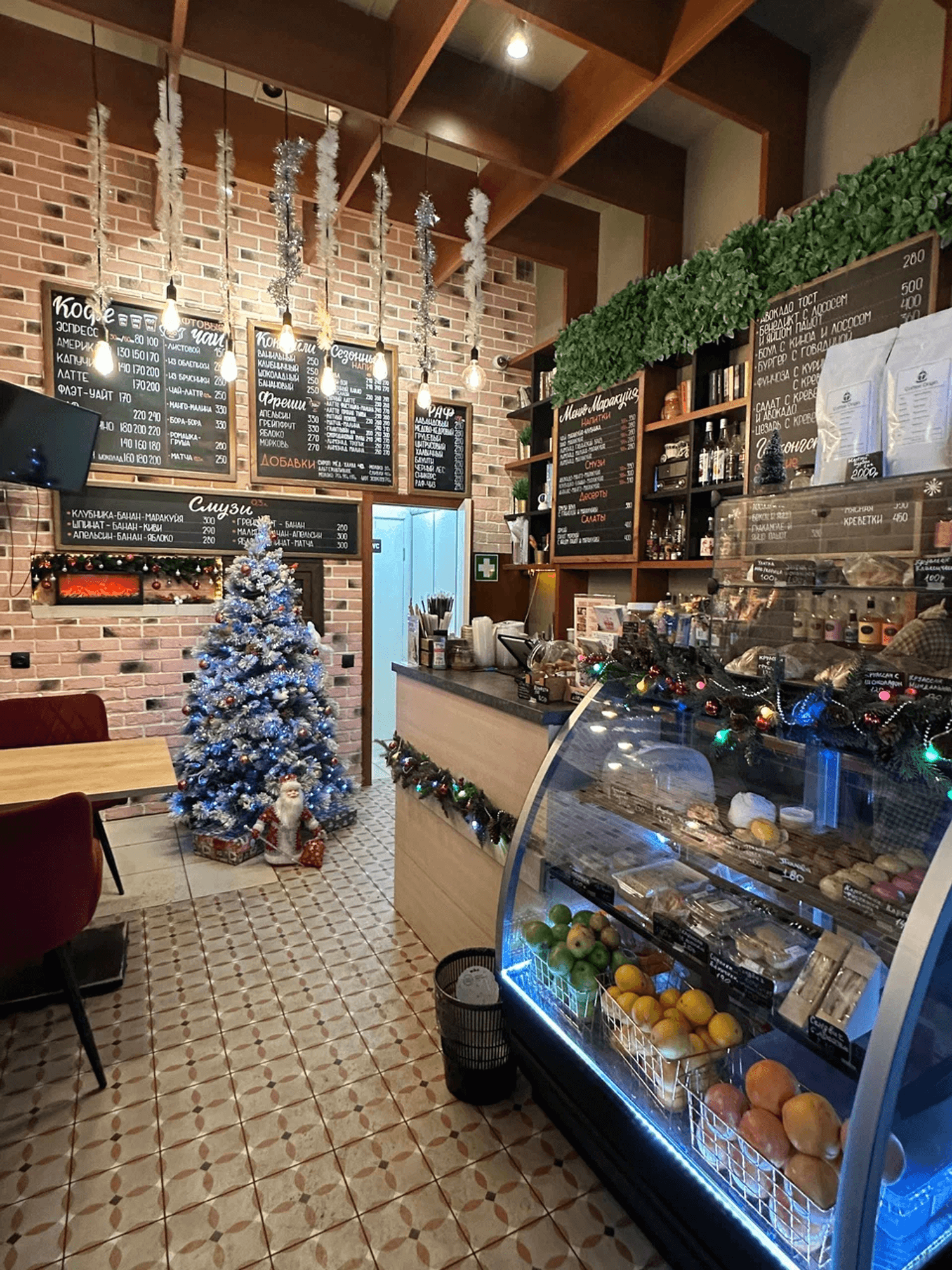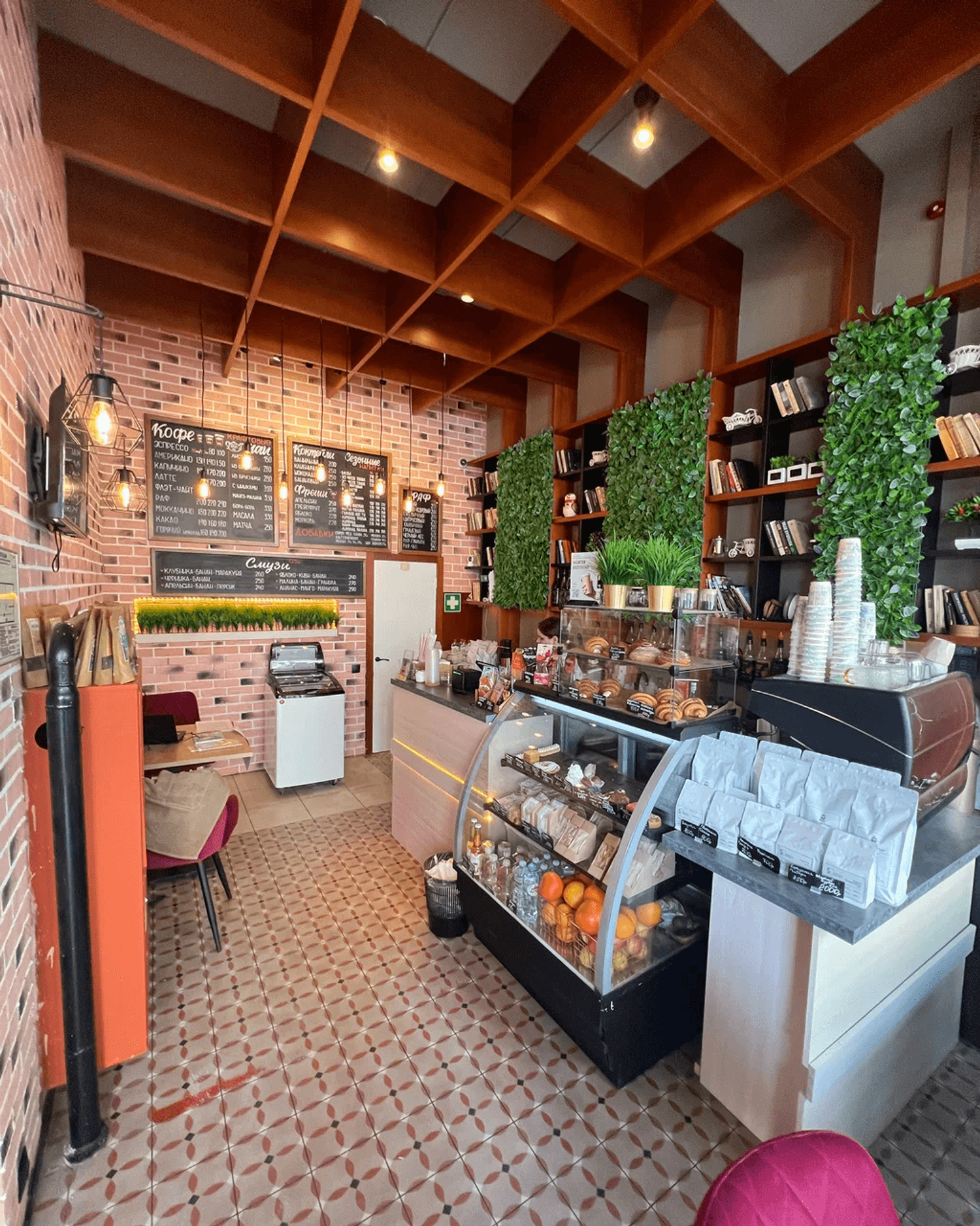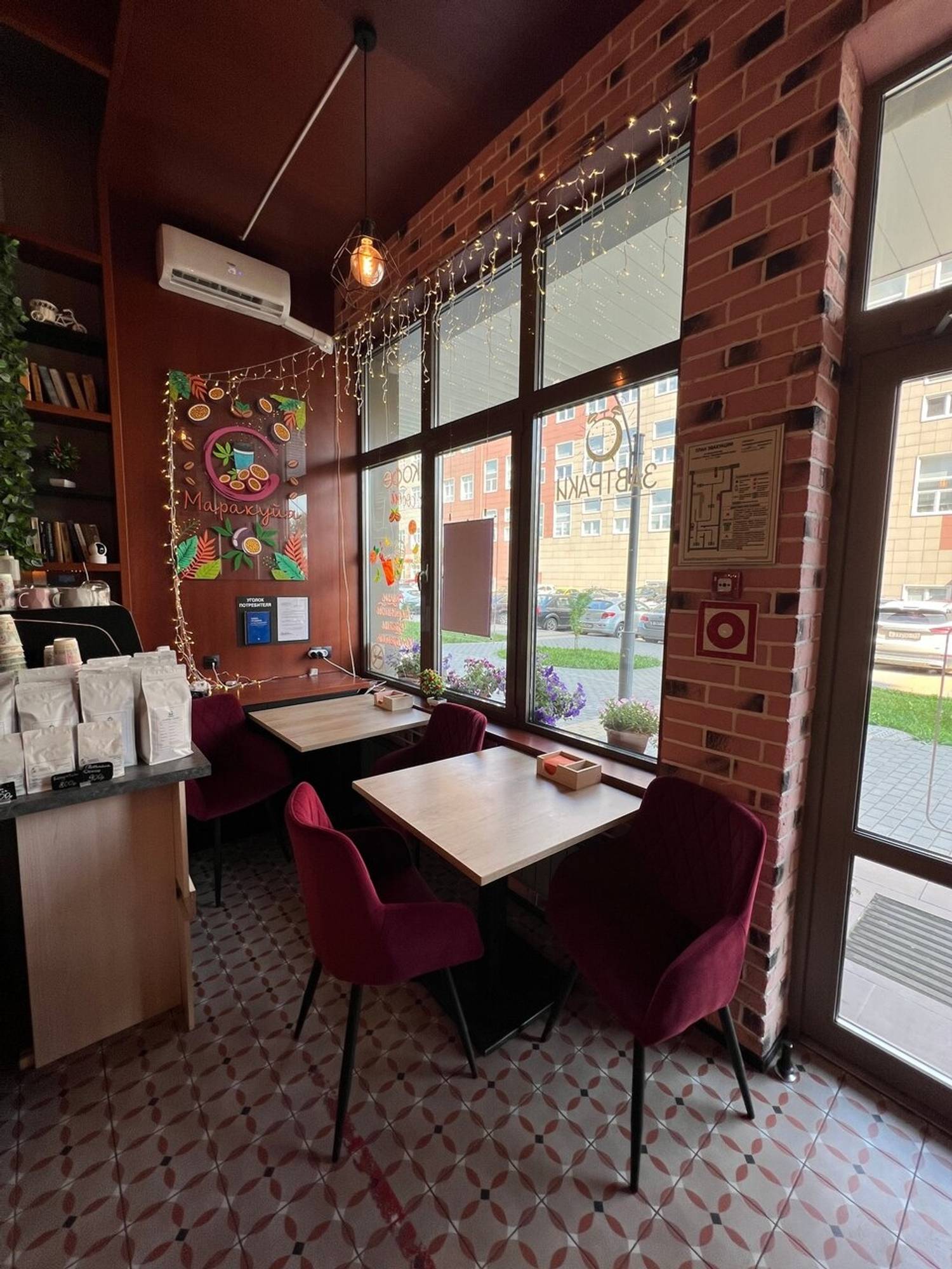 Атмосфера. Небольшое камерное пространство с мягкими стульями, книжными полками и живыми растениями напоминает гостиную у друзей. Естественное освещение и гирлянды создают ощущение тепла и уюта, располагая к неспешному общению.
