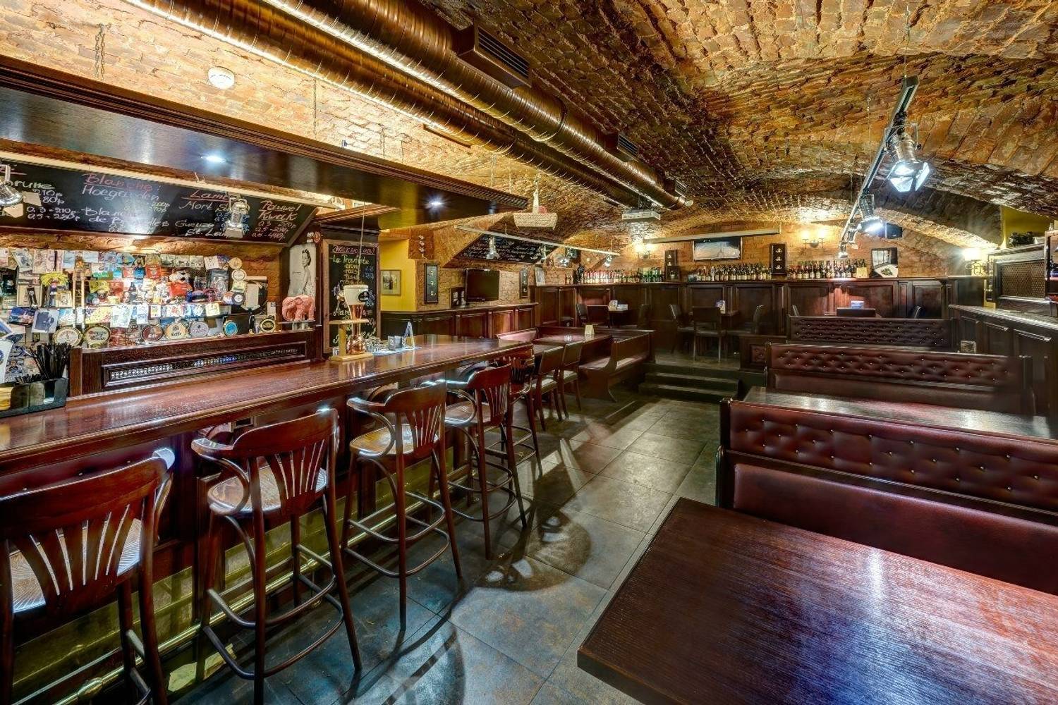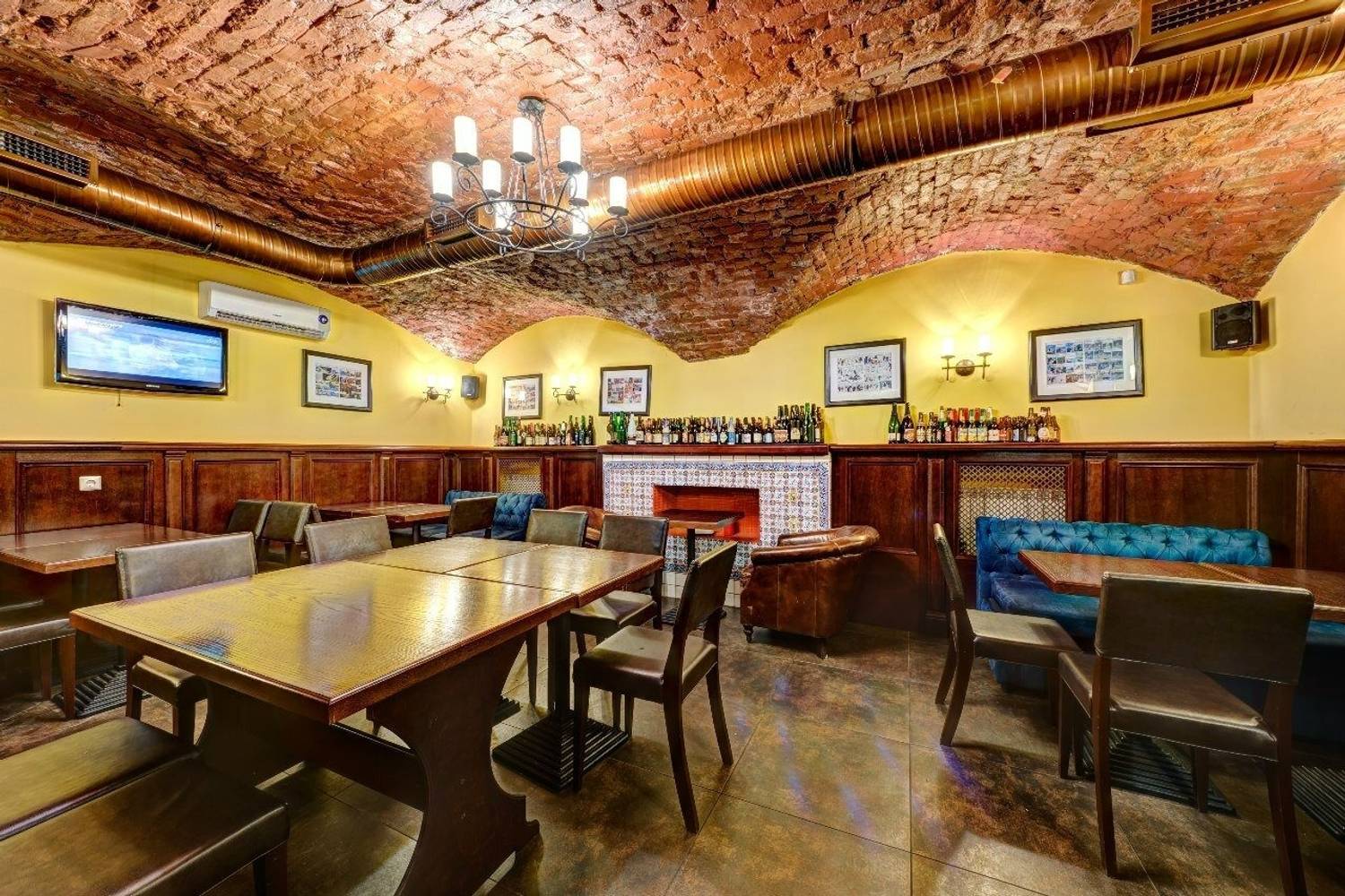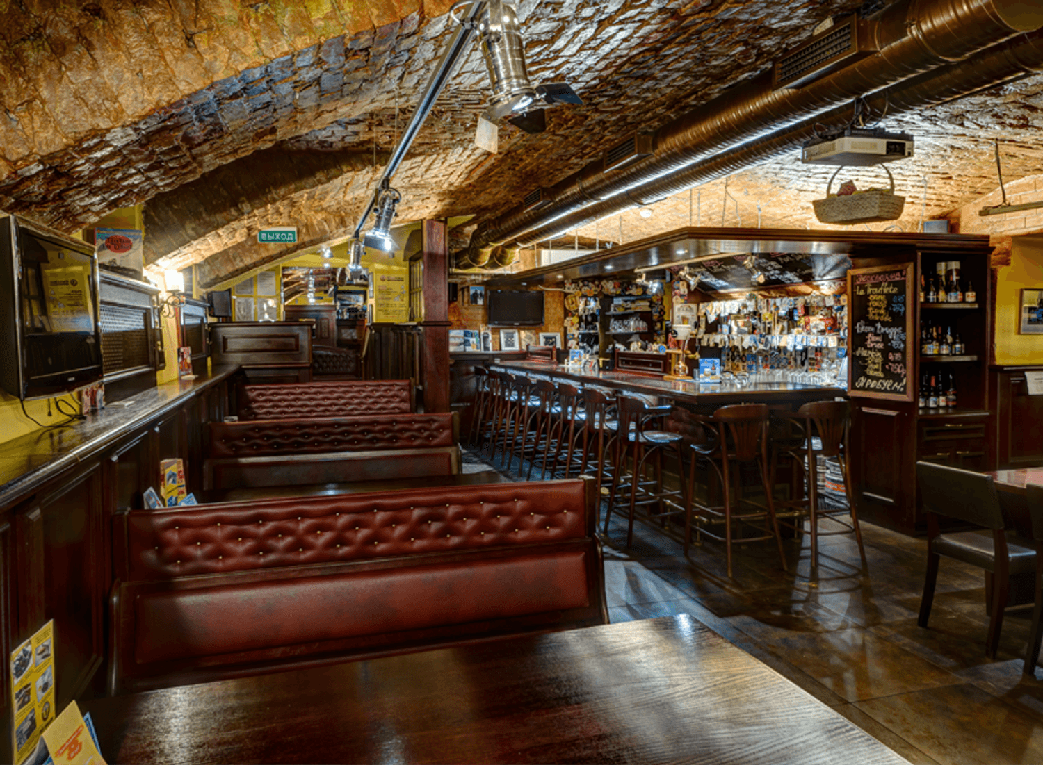 Атмосфера. Интерьер воспроизводит атмосферу брюссельского пивного заведения: массивные деревянные столы для компаний, кирпичная кладка и плазменные панели для спортивных трансляций.