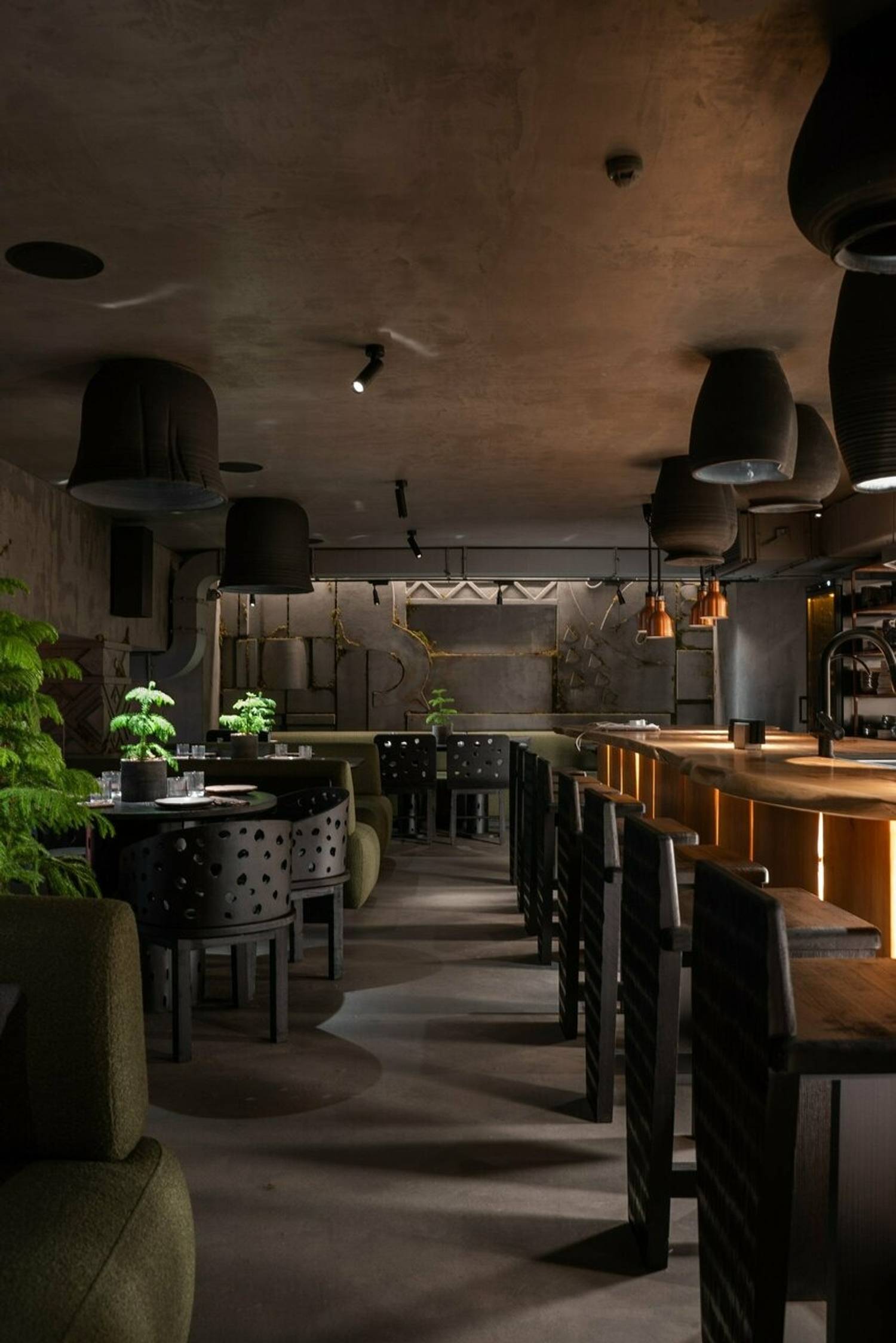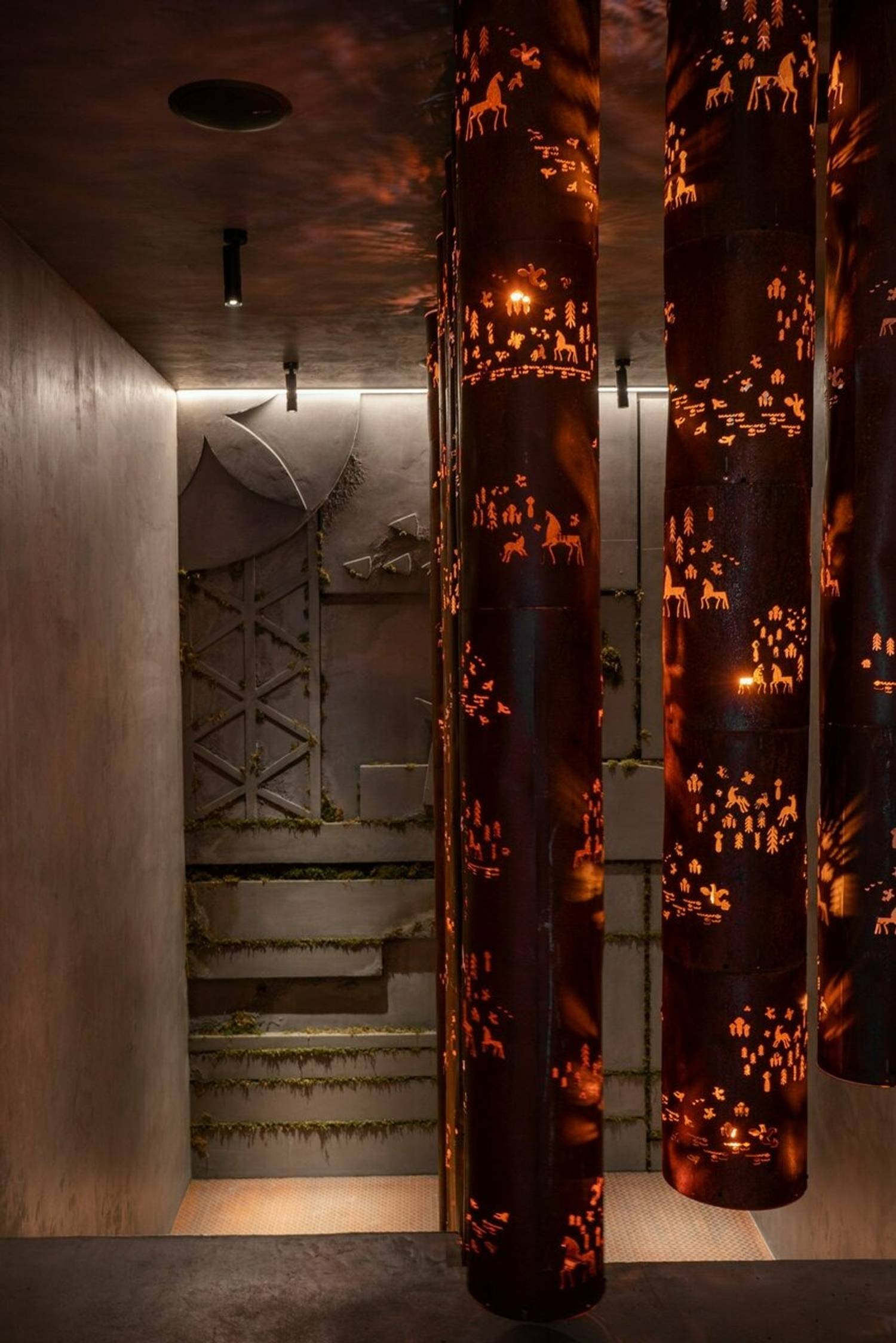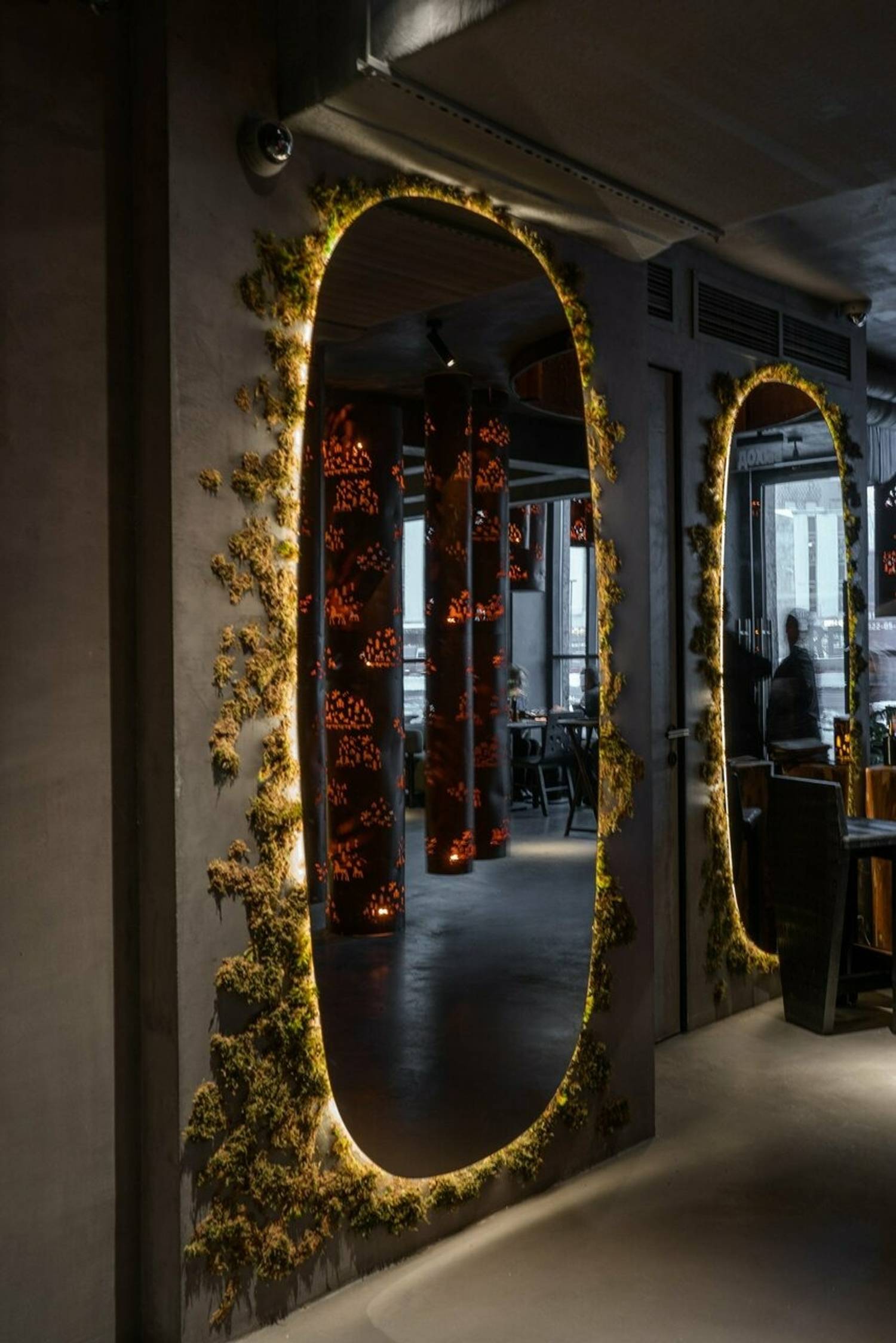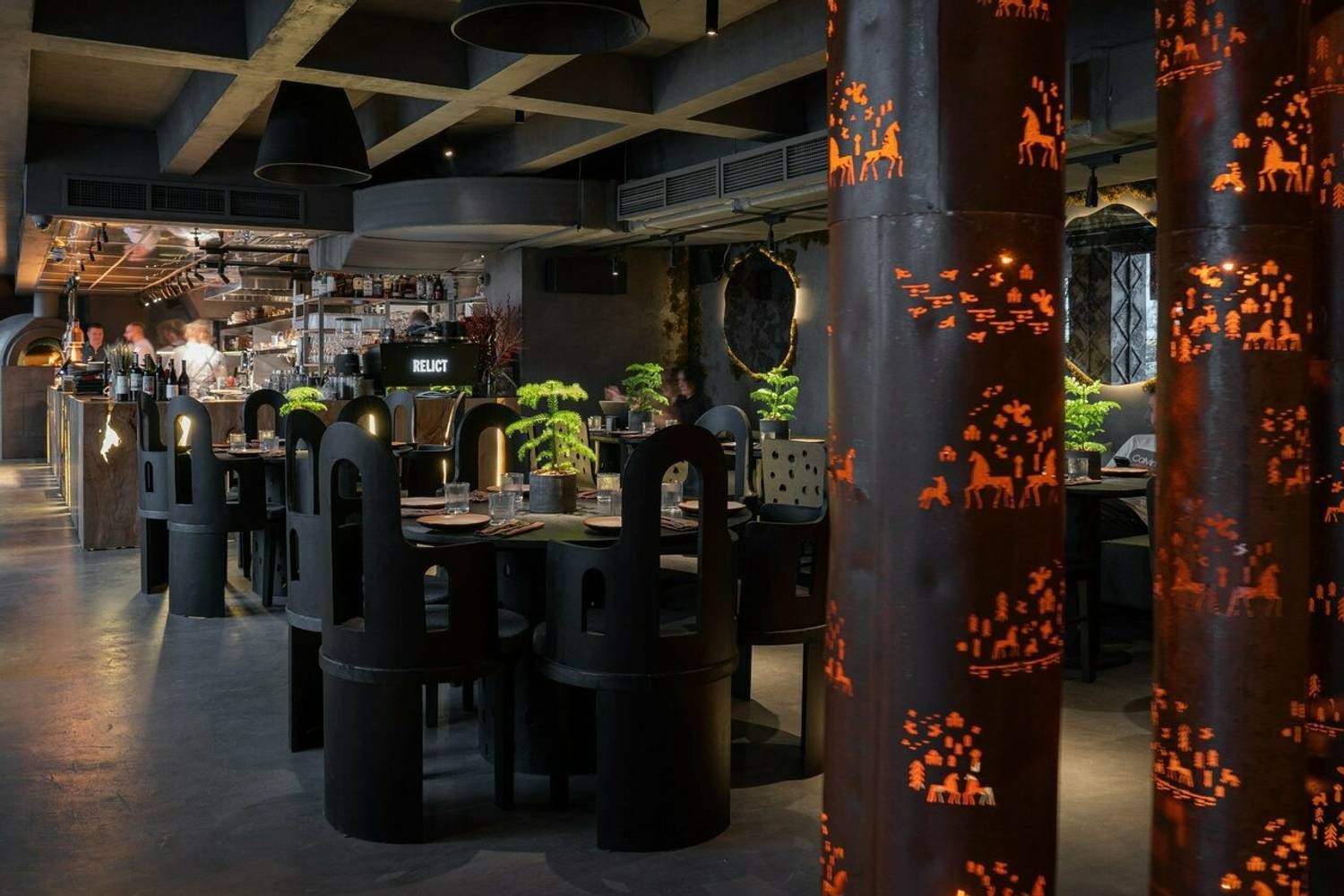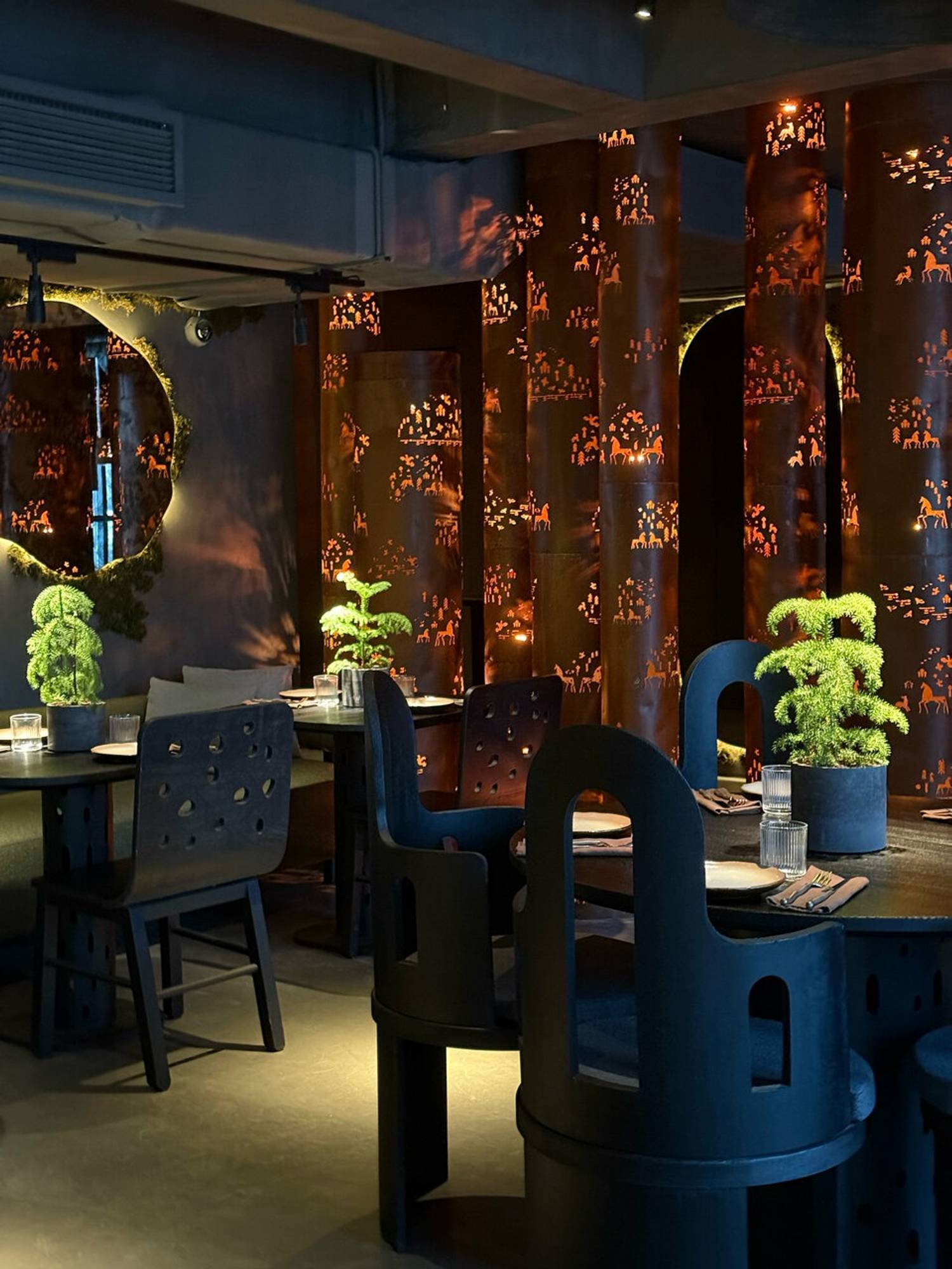 Атмосфера. В интерьере классические элементы получают неожиданное прочтение: дубовая мебель, зеркала в обрамлении искусственной травы, а вместо традиционных люстр над столами свисают багровые трубы с резными лошадьми — современная интерпретация народных мотивов. Ручная посуда местных мастеров и светильники с мезенской росписью создают связь с исконными ремеслами, но в новом, почти театральном контексте.