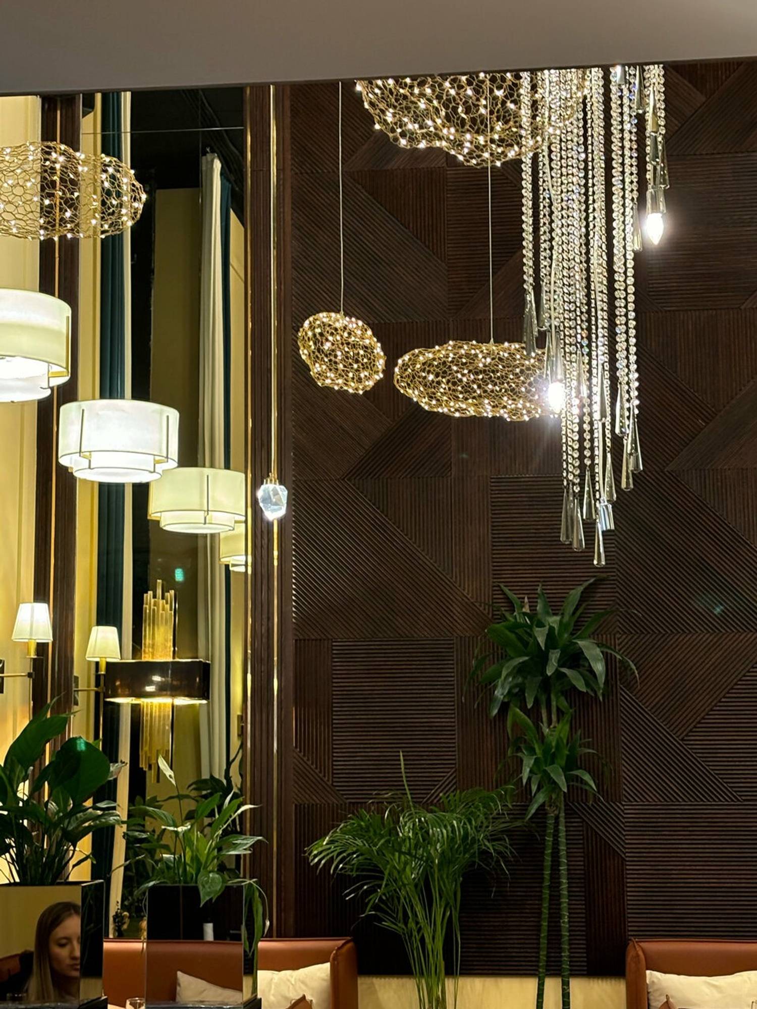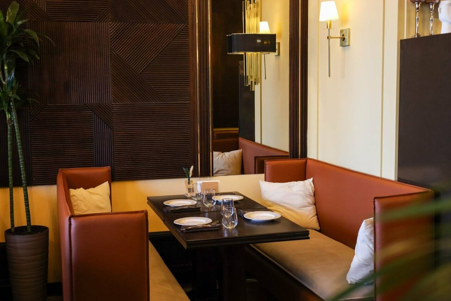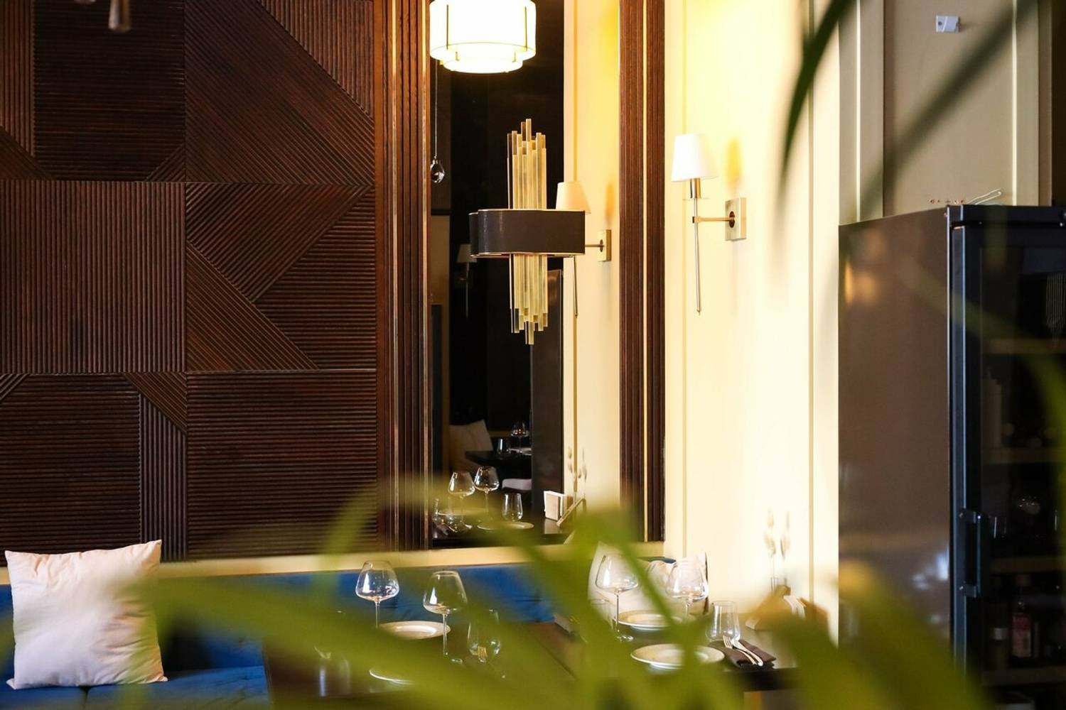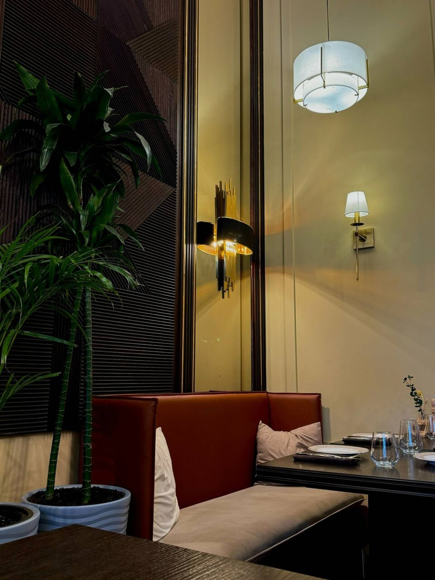 Атмосфера. Главная идея — контраст темного дерева и светлых акцентов: кожаные диваны, рельефный фарфор и высокие растения в кадках. Воздушные сетчатые люстры и черно-золотые бра над столами добавляют пространству лоска, а окна открывают вид на воду.