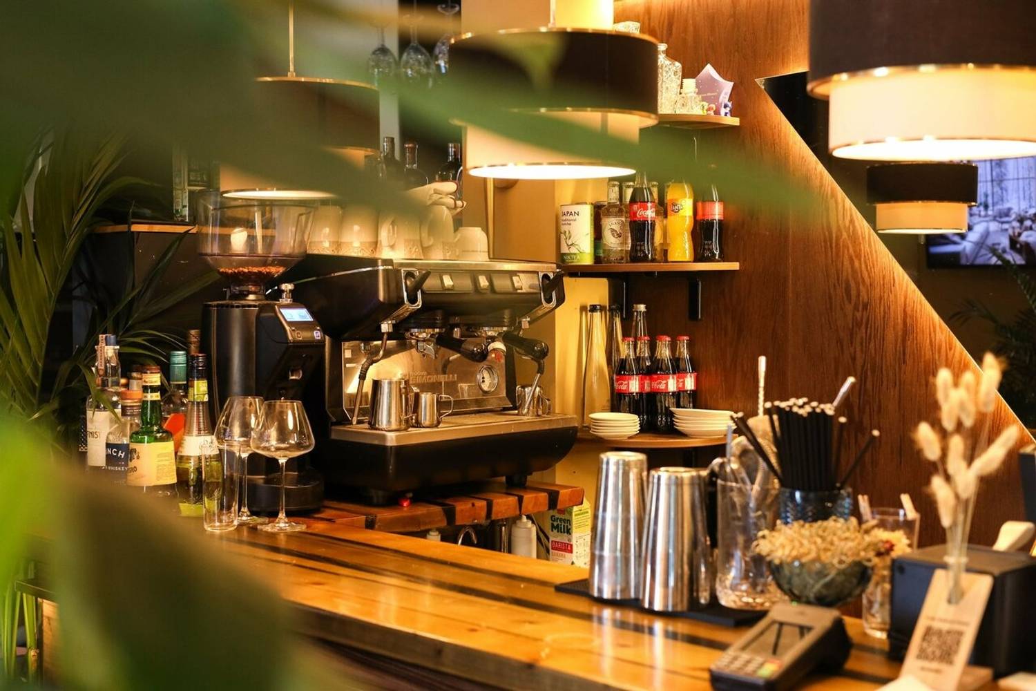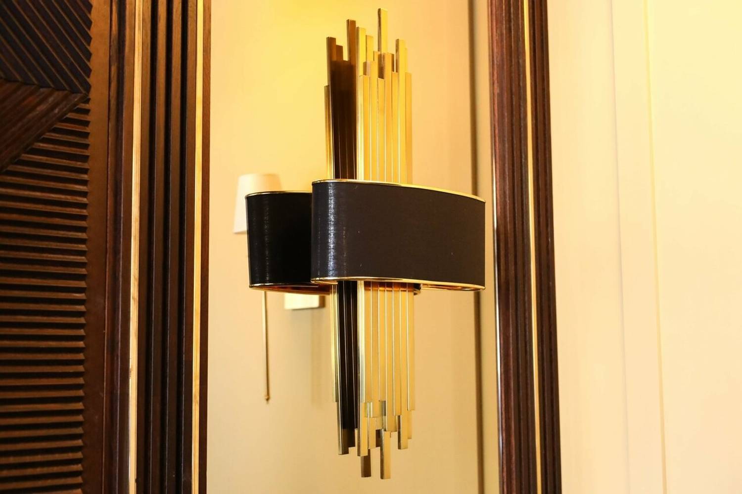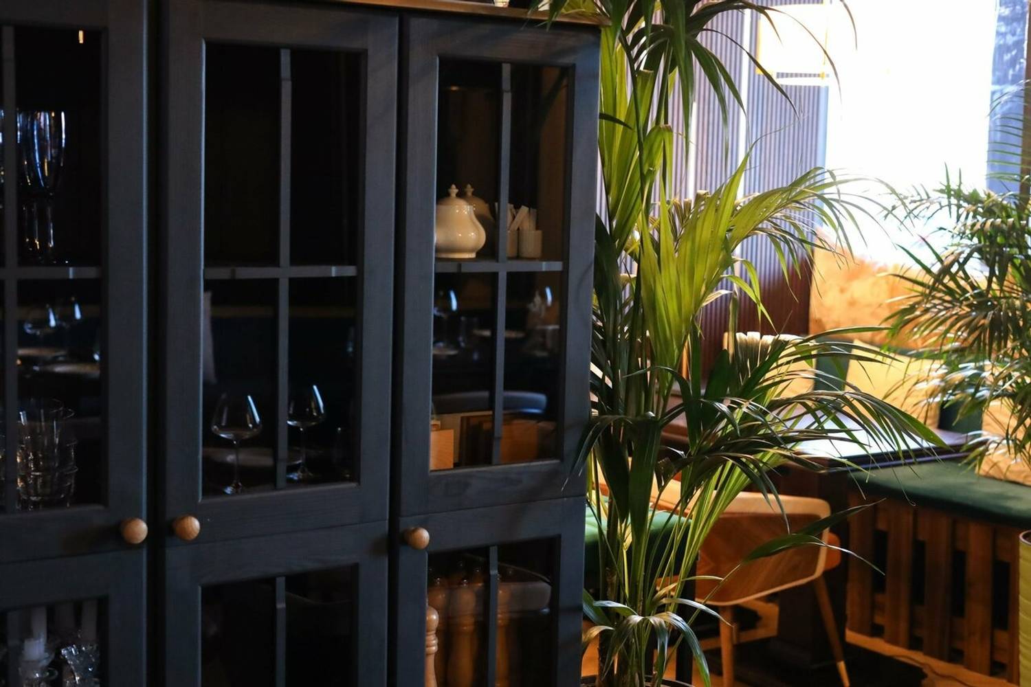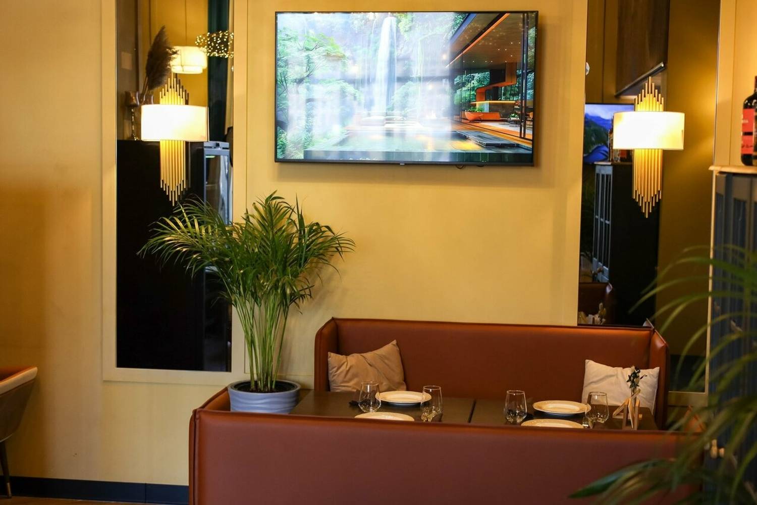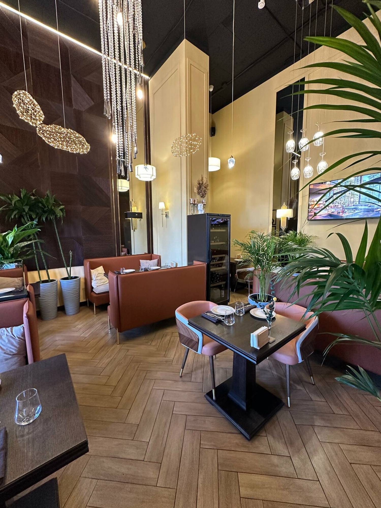 Атмосфера. Главная идея — контраст темного дерева и светлых акцентов: кожаные диваны, рельефный фарфор и высокие растения в кадках. Воздушные сетчатые люстры и черно-золотые бра над столами добавляют пространству лоска, а окна открывают вид на воду.
