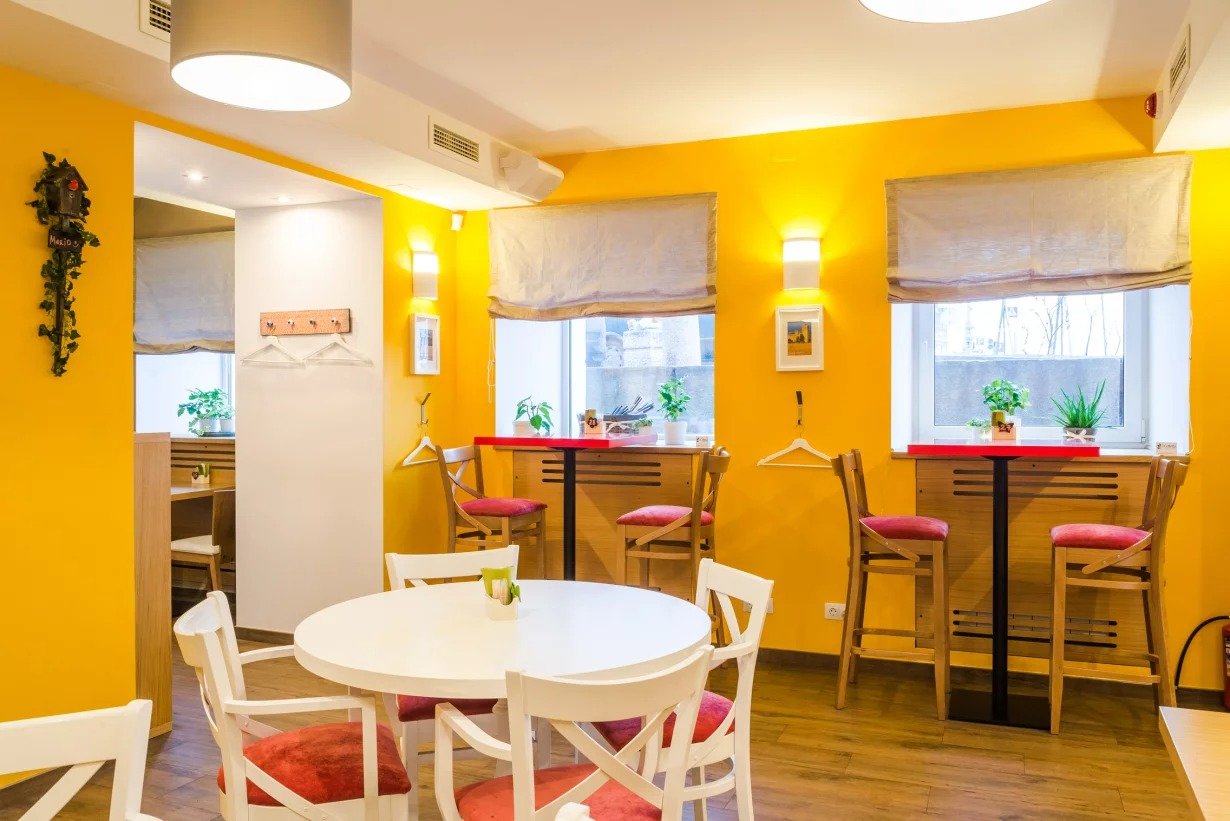 Атмосфера. Простое и солнечное пространство с видом на Фонтанку напоминает семейную тратторию. В интерьере — теплые оттенки, портреты шефа, нарисованные детьми, и открытая кухня, где шеф лично общается с гостями.