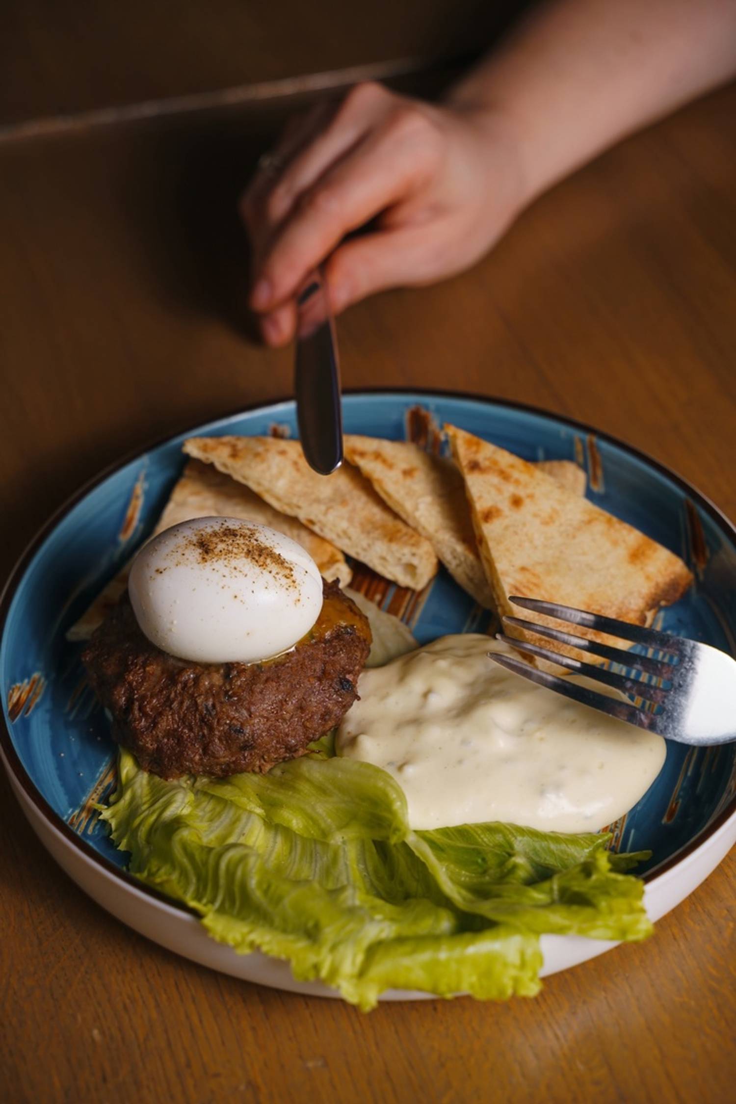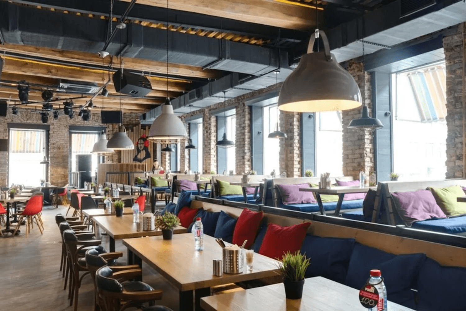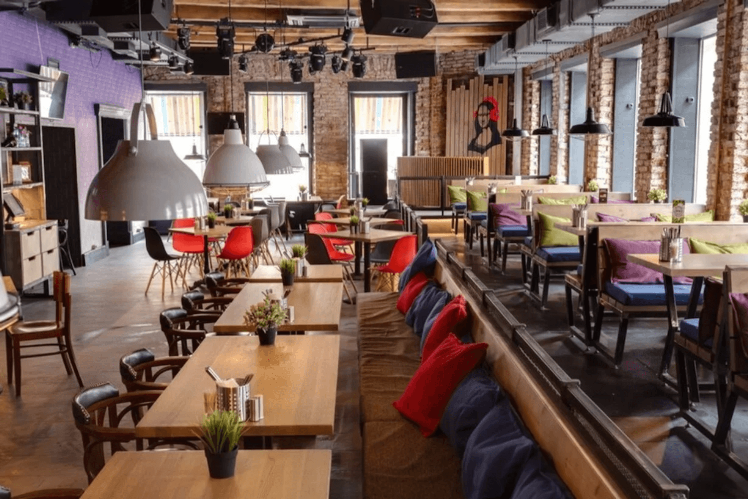 Здесь уютно и комфортно: деревянная мебель, мягкий свет, растения и подушки. А когда наступает вечер, ресторан превращается в место для танцев и караоке-вечеринок с крутыми артистами.