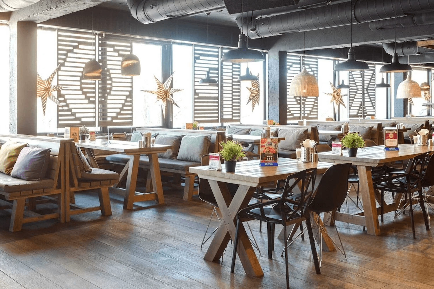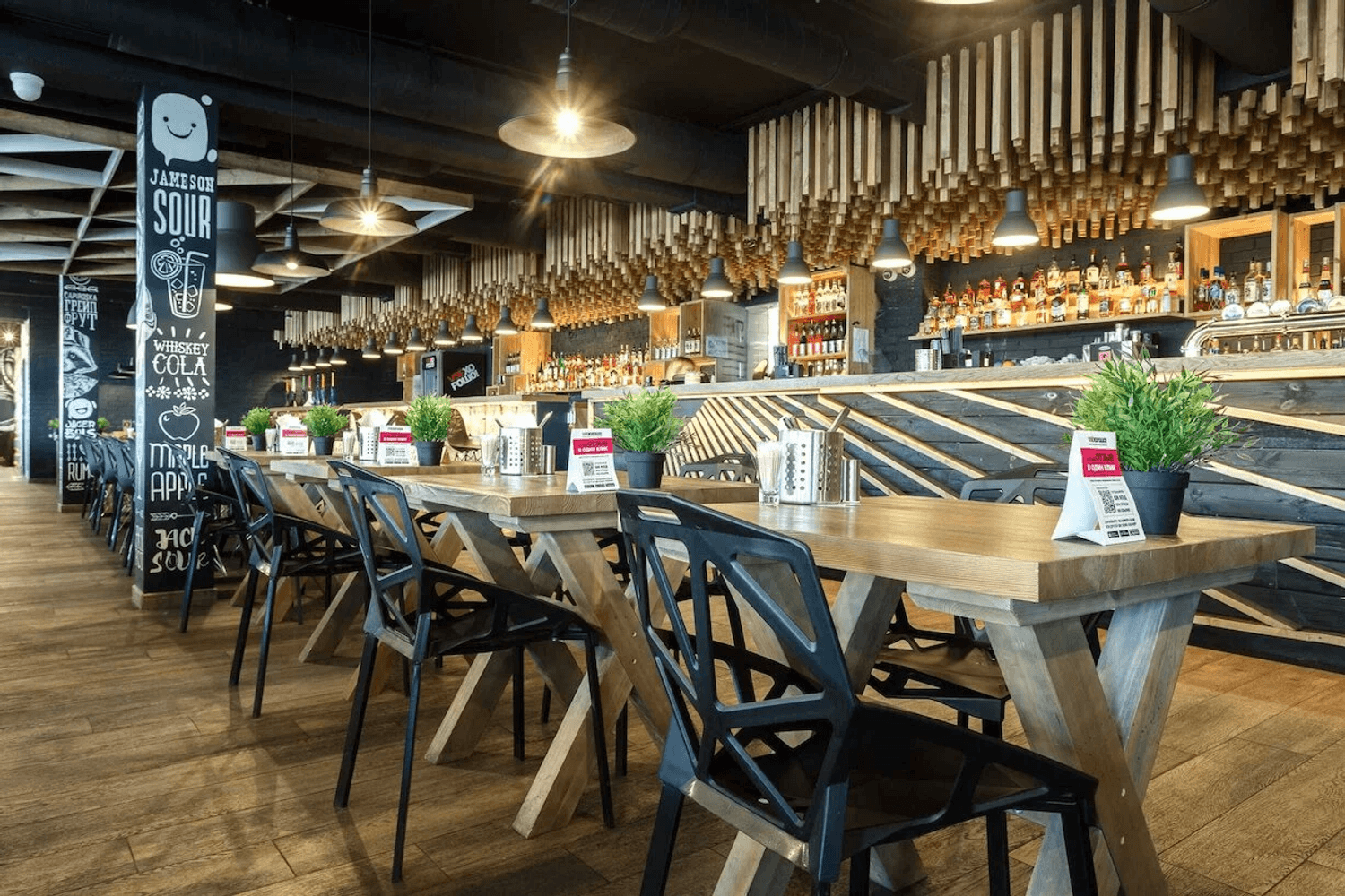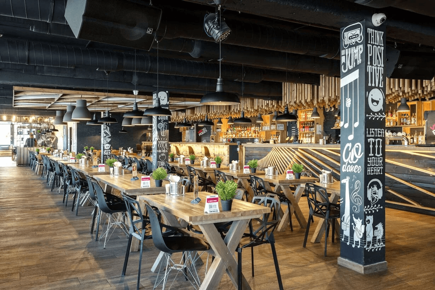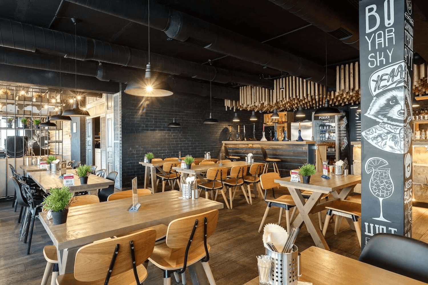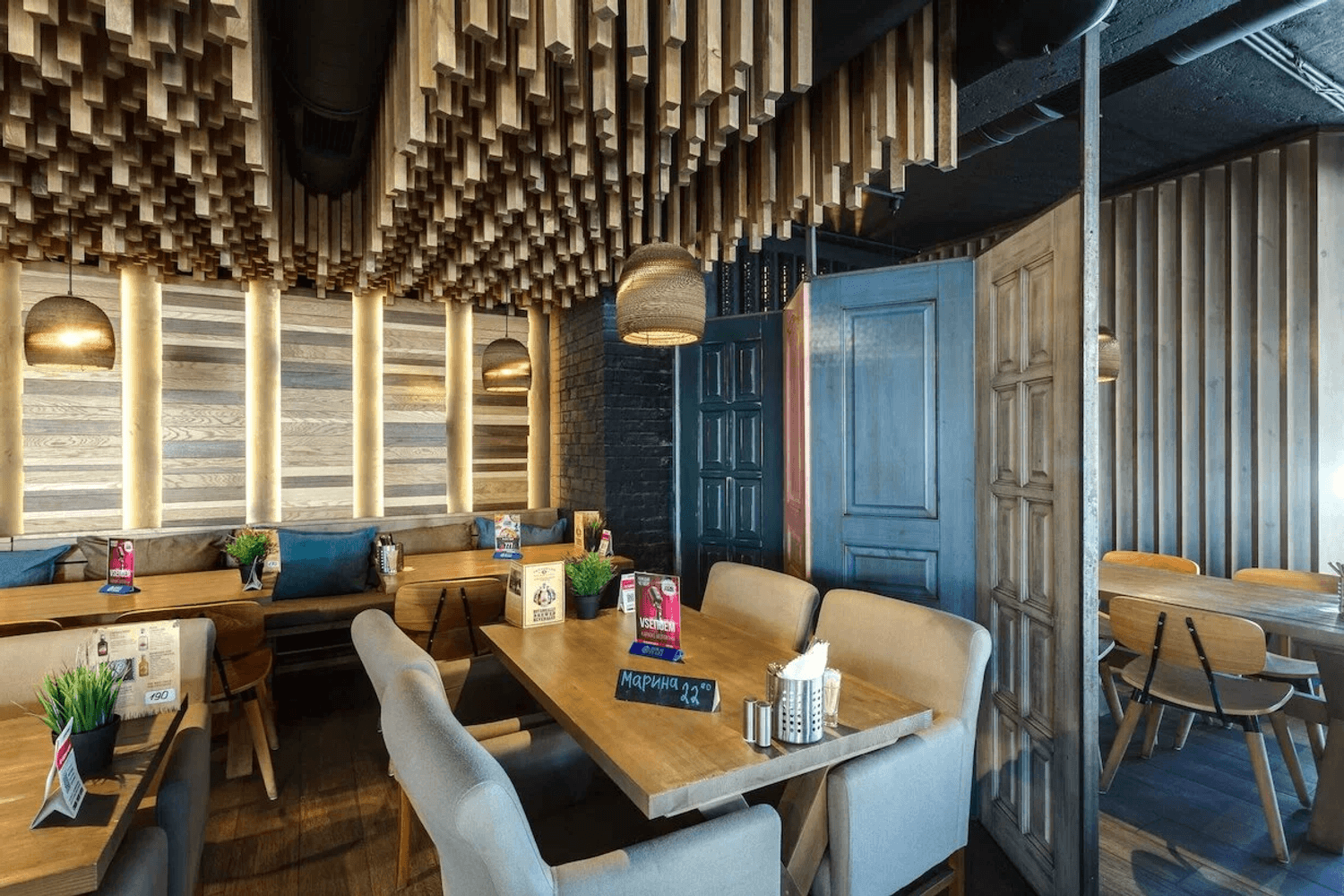 Атмосфера. Интерьер выполнен в уютном современном стиле: деревянная мебель, плетеные абажуры, живые растения и мягкие подушки. А вечером и ночью пространство превращается в площадку для вечеринок с выступлениями артистов.