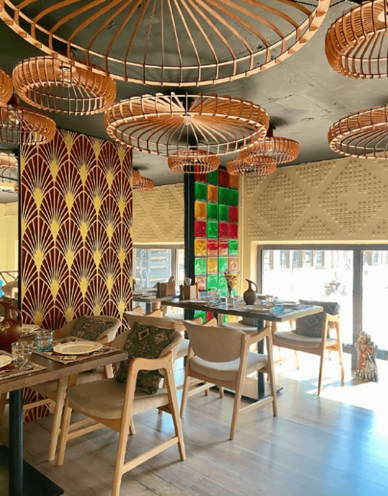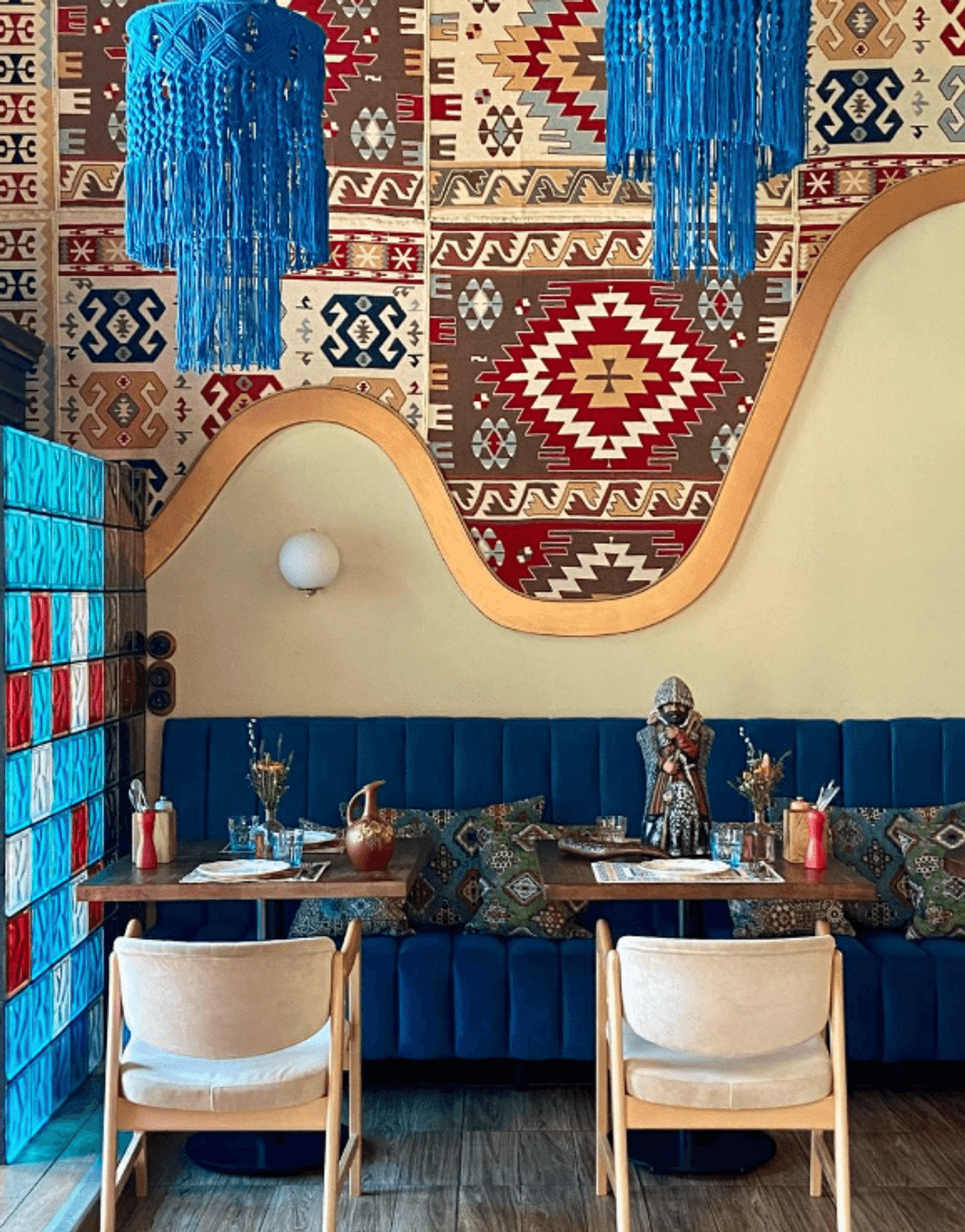 Атмосфера. Двухэтажное пространство сочетает теплую палитру, натуральные материалы и колоритные детали: здесь свет играет на разноцветных стеклоблоках, на столах лежат узорчатые скатерти, а светильники украшены плетением макраме. По пятницам здесь звучат живые грузинские мелодии, а для детей организуют анимацию и мастер-классы.