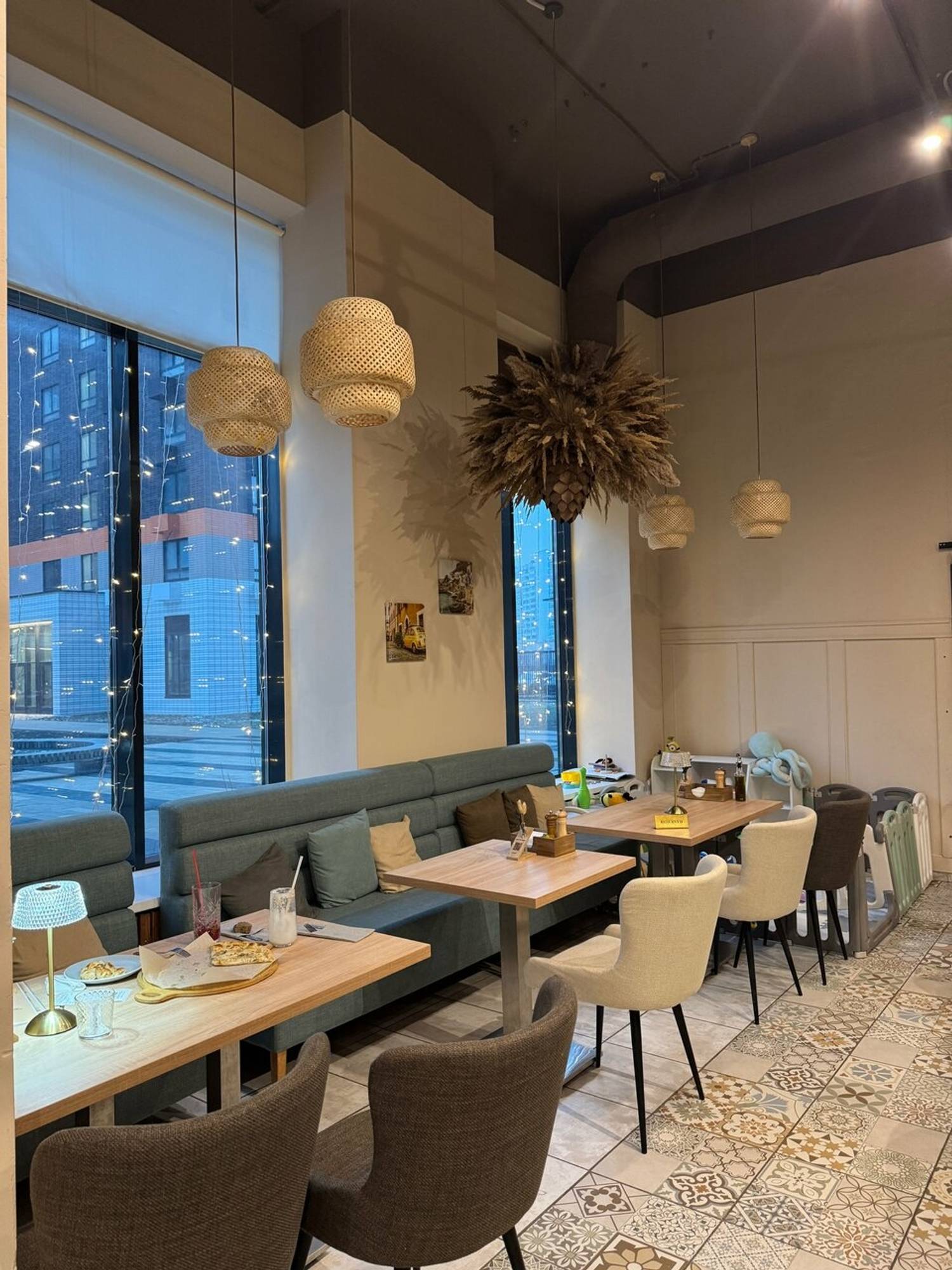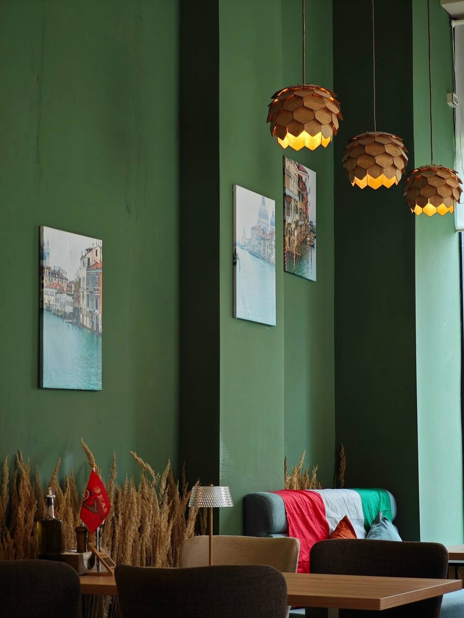 Атмосфера. Пространство с теплой цветовой гаммой, деревянной мебелью и мягким освещением напоминает уютную сицилийскую тратторию. В оформлении стен и мебели использованы натуральные природные цвета: оливковый, бежевый, коричневый, терракотовый. Благодаря этому помещение смотрится легко и органично, а большие окна добавляют света и воздуха.