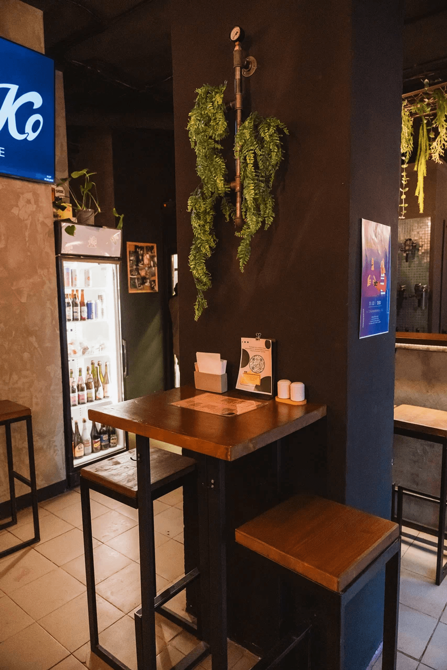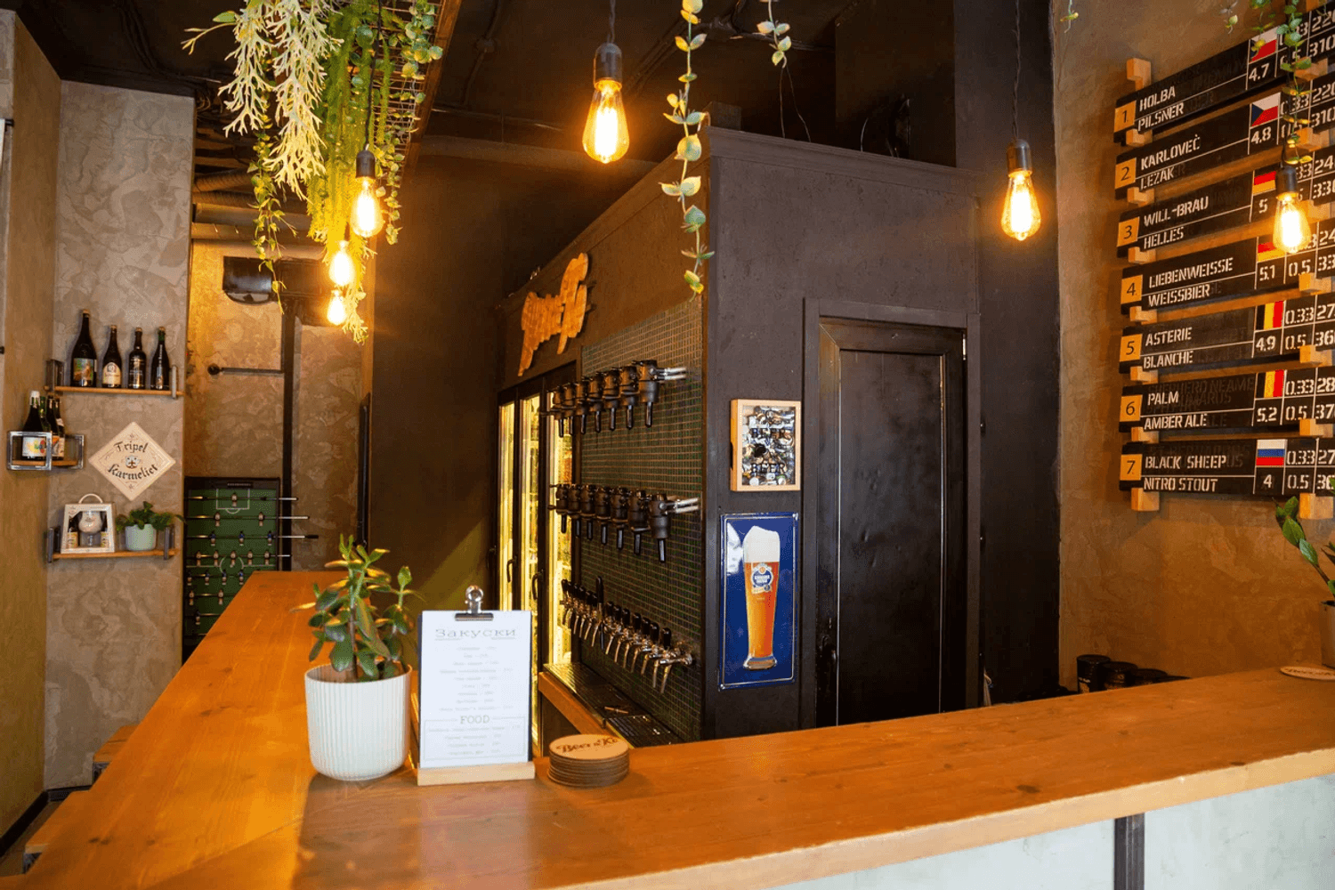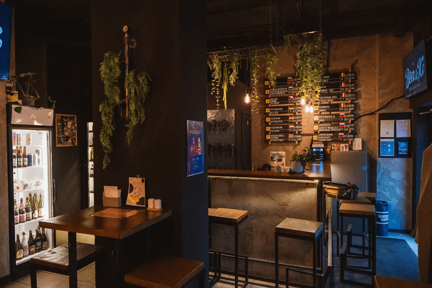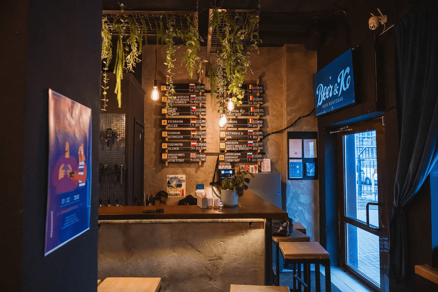 Атмосфера. Небольшое пространство в индустриальном стиле: открытые кирпичные стены, черные колонны с подвесными растениями, зеркала и мягкий свет. За баром висят краны, из которых наливают пиво из разных стран.