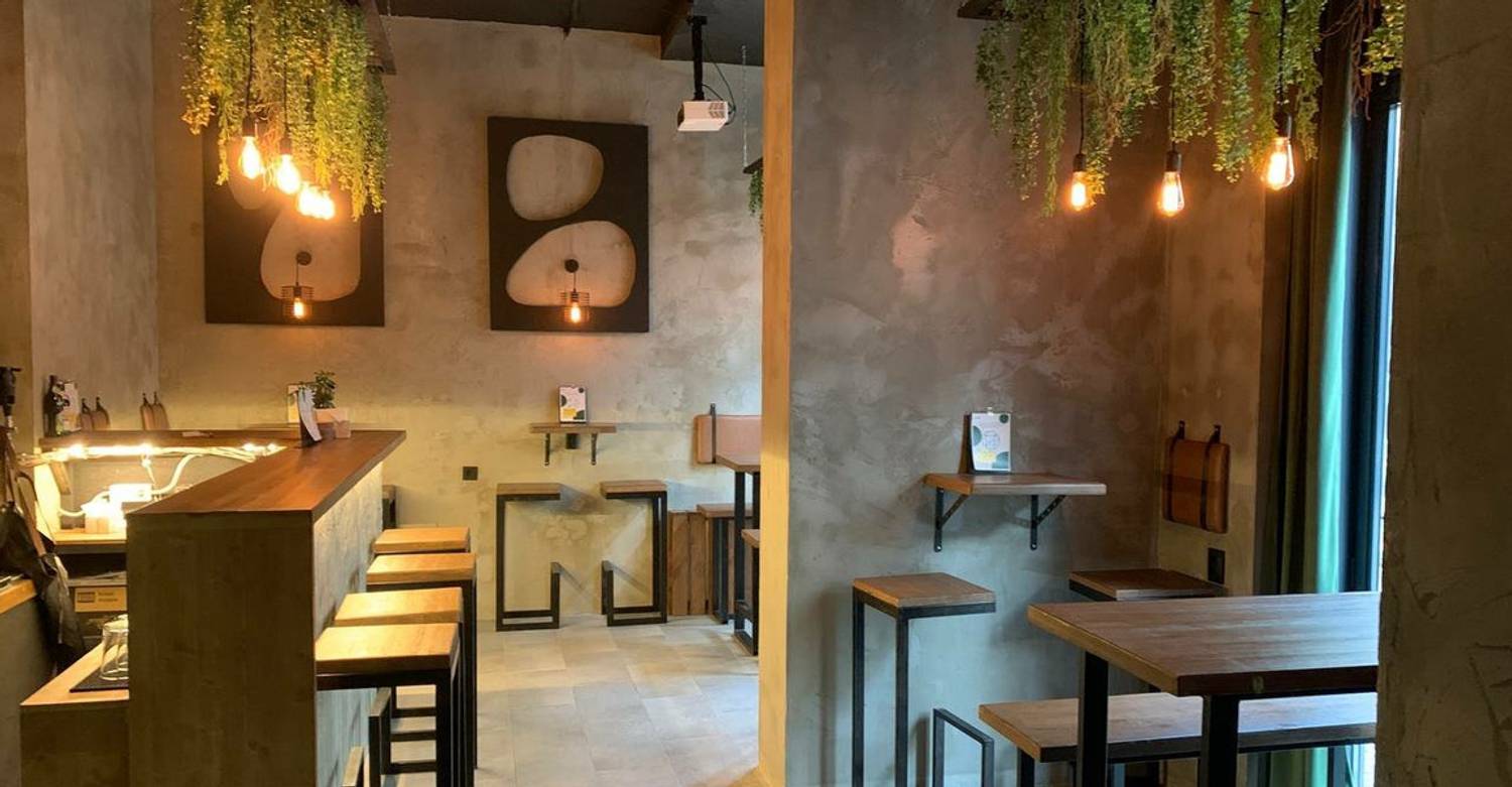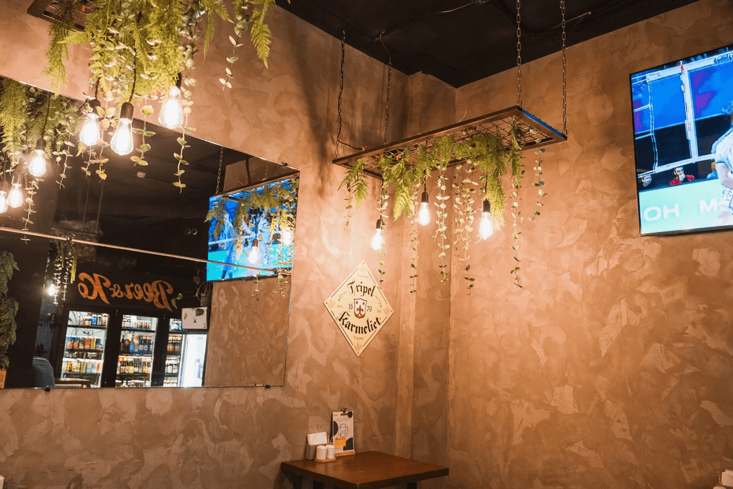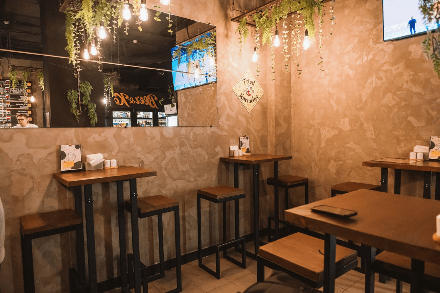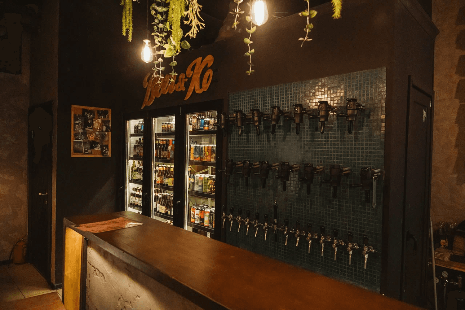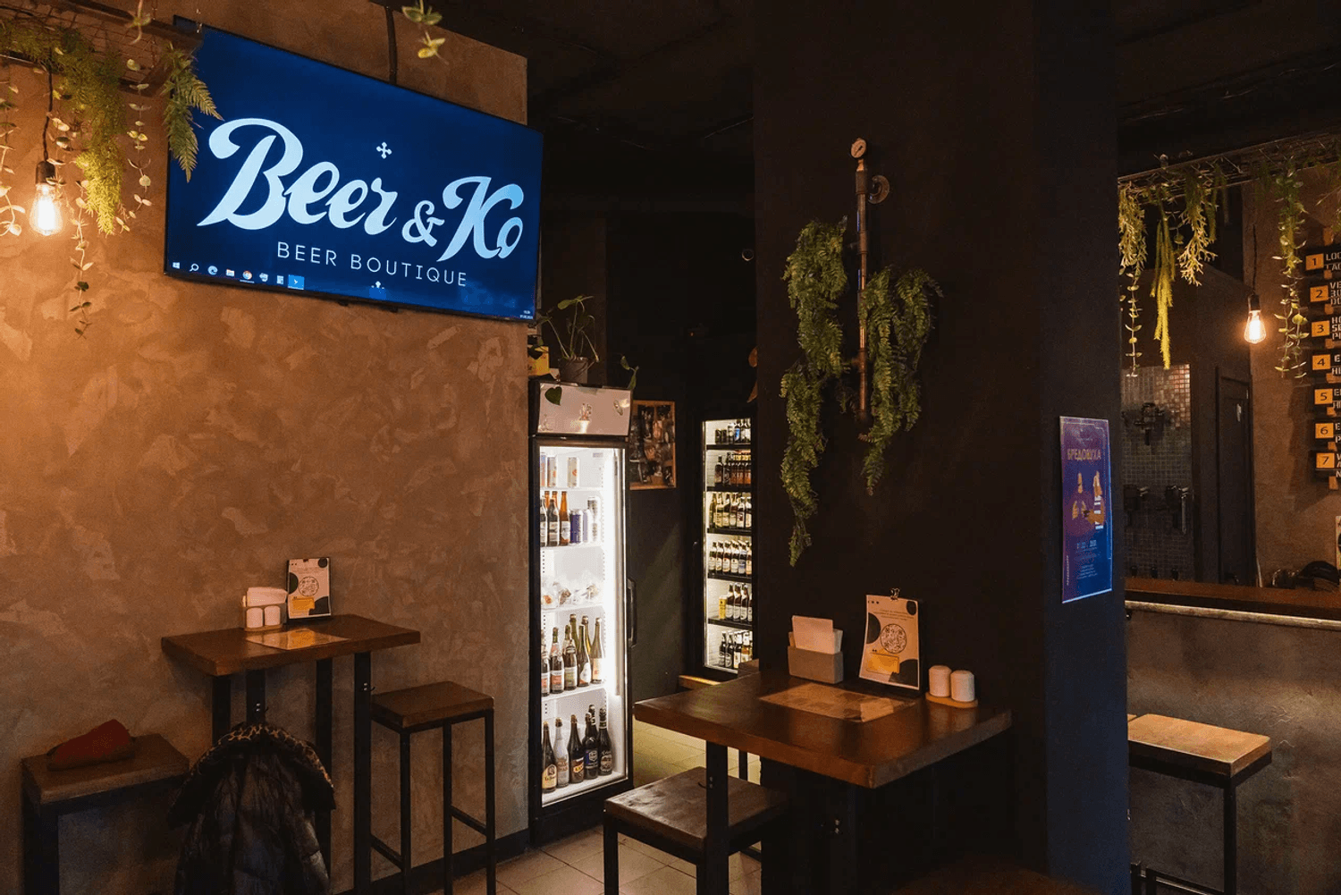 Атмосфера. Небольшое пространство в индустриальном стиле: открытые кирпичные стены, черные колонны с подвесными растениями, зеркала и мягкий свет. За баром висят краны, из которых наливают пиво из разных стран.