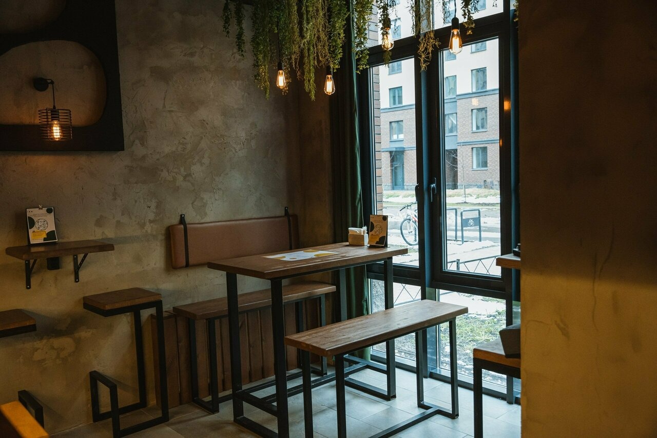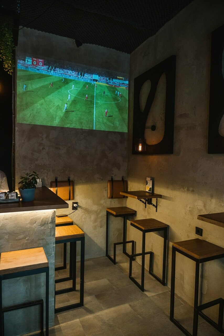 Атмосфера. Пространство с открытыми кирпичными стенами, металлическими элементами и мягким светом. Есть зона с караоке и место для просмотра спортивных мероприятий.