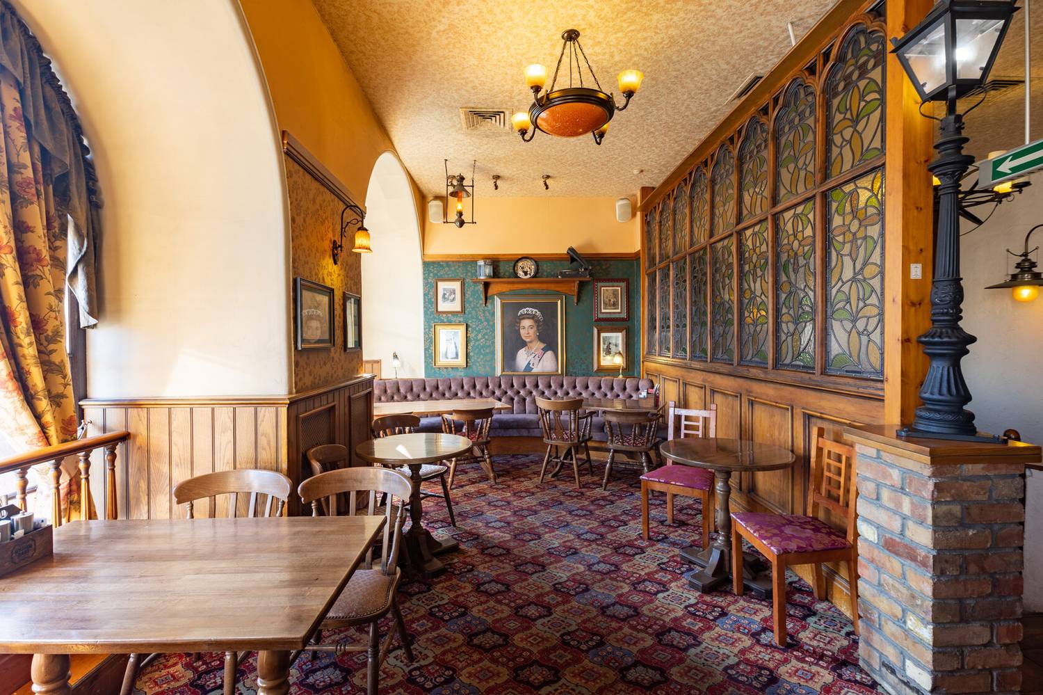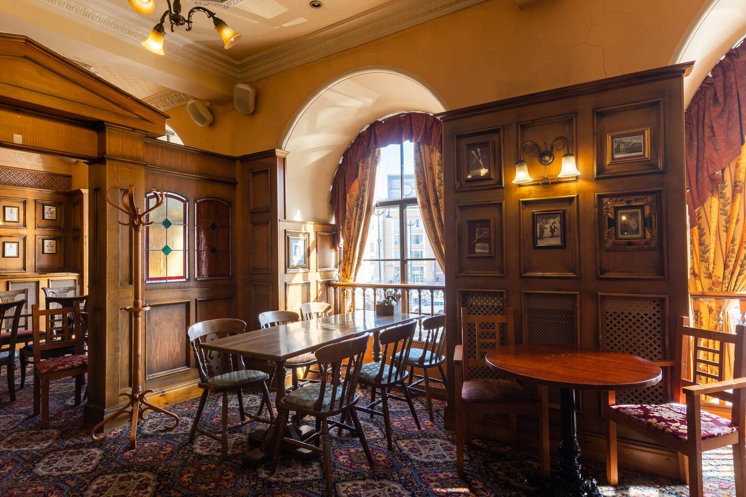 Атмосфера. Пространство разделено на тематические зоны: Королевскую гостиную с портретом Елизаветы II, библиотечный зал и барную стойку с витражами. Массивные деревянные панели, красно-зеленая гамма и картины в позолоченных рамах воссоздают дух классического британского паба.