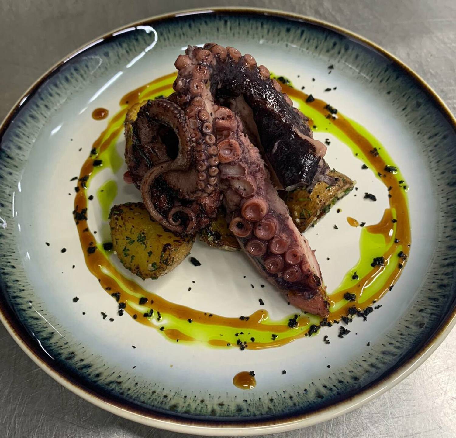 Еда и напитки. В меню — блюда средиземноморской и азиатской кухни с акцентом на морепродукты: краб-кейк с рисом, оливье с северным кальмаром, гедза с креветками, сырный мисо суп с горбушей, пельмени с красной рыбой. На компанию можно взять кастрюлю мидий в томатном соусе, шашлык с тунцом и лососем, бутерброды с икрой и креветками, а на десерт профитроли в шоколадном соусе и морковный торт.