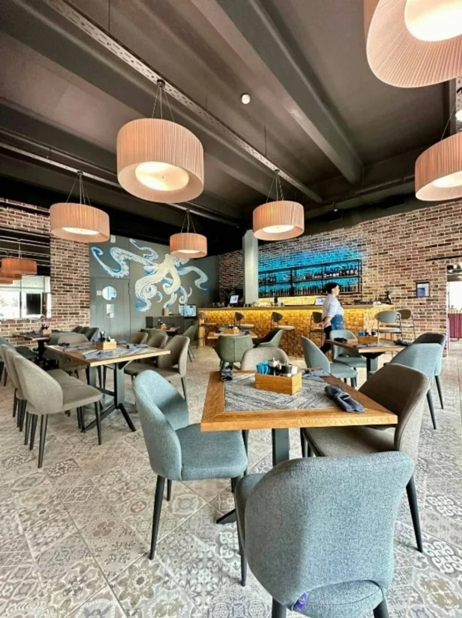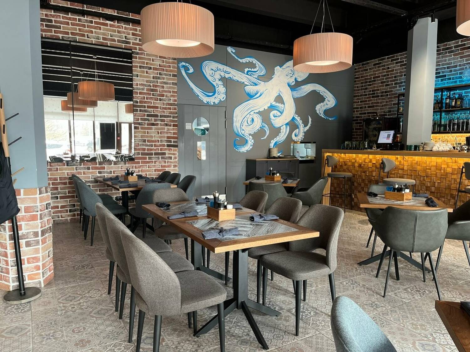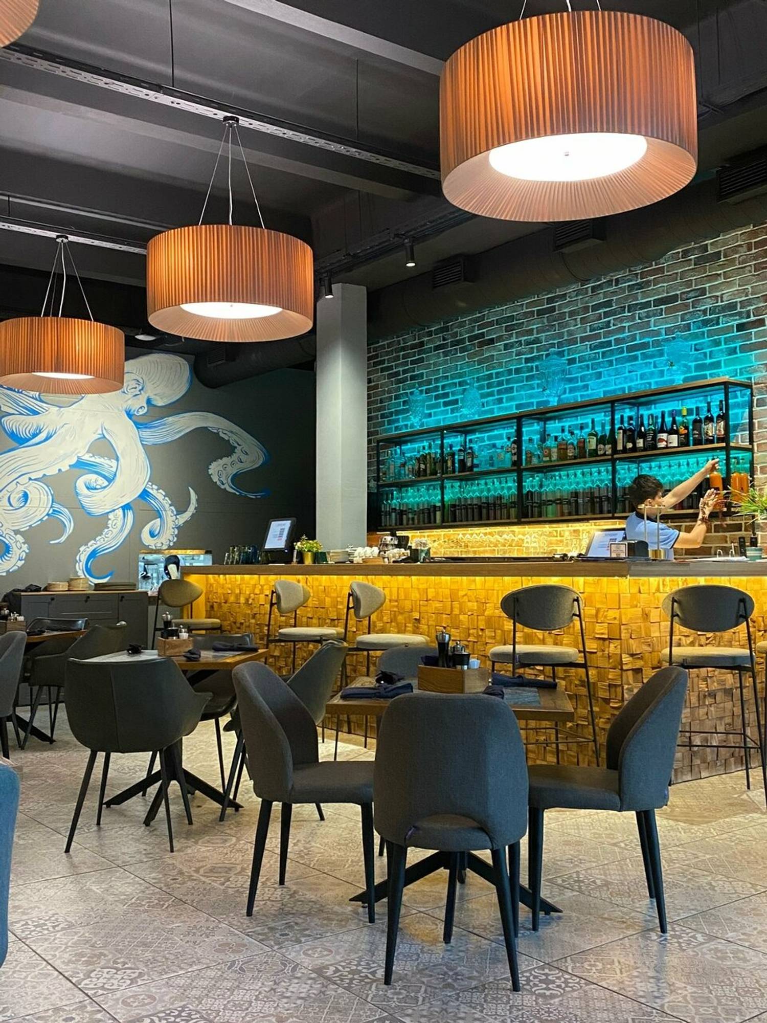 Атмосфера. Оформление заведения в морской стилистике: кирпичные стены с декоративными панелями из искусственной травы сочетаются с художественной росписью в виде гигантского осьминога и медуз. Центр притяжения — барная стойка с золотистой подсветкой, которая контрастирует с голубой подсветкой на заднем фона, что создает эффект морского сияния.