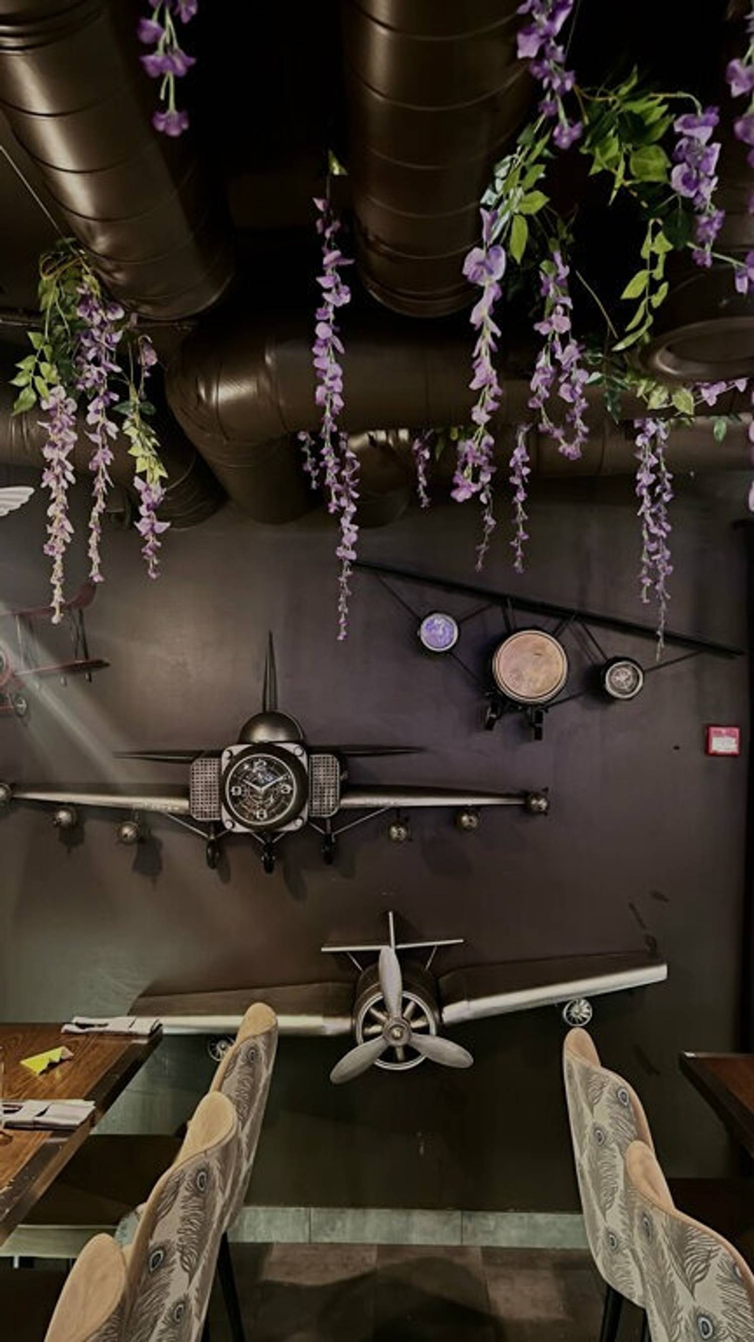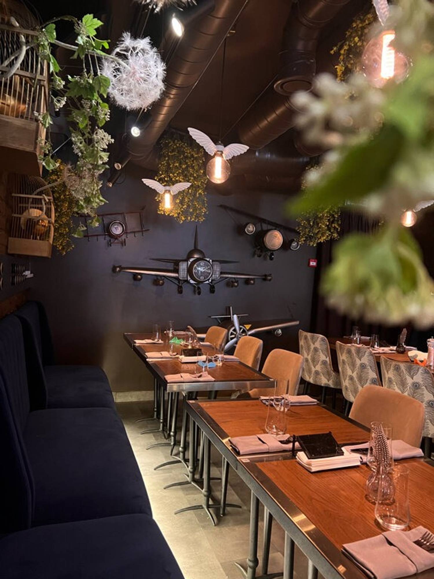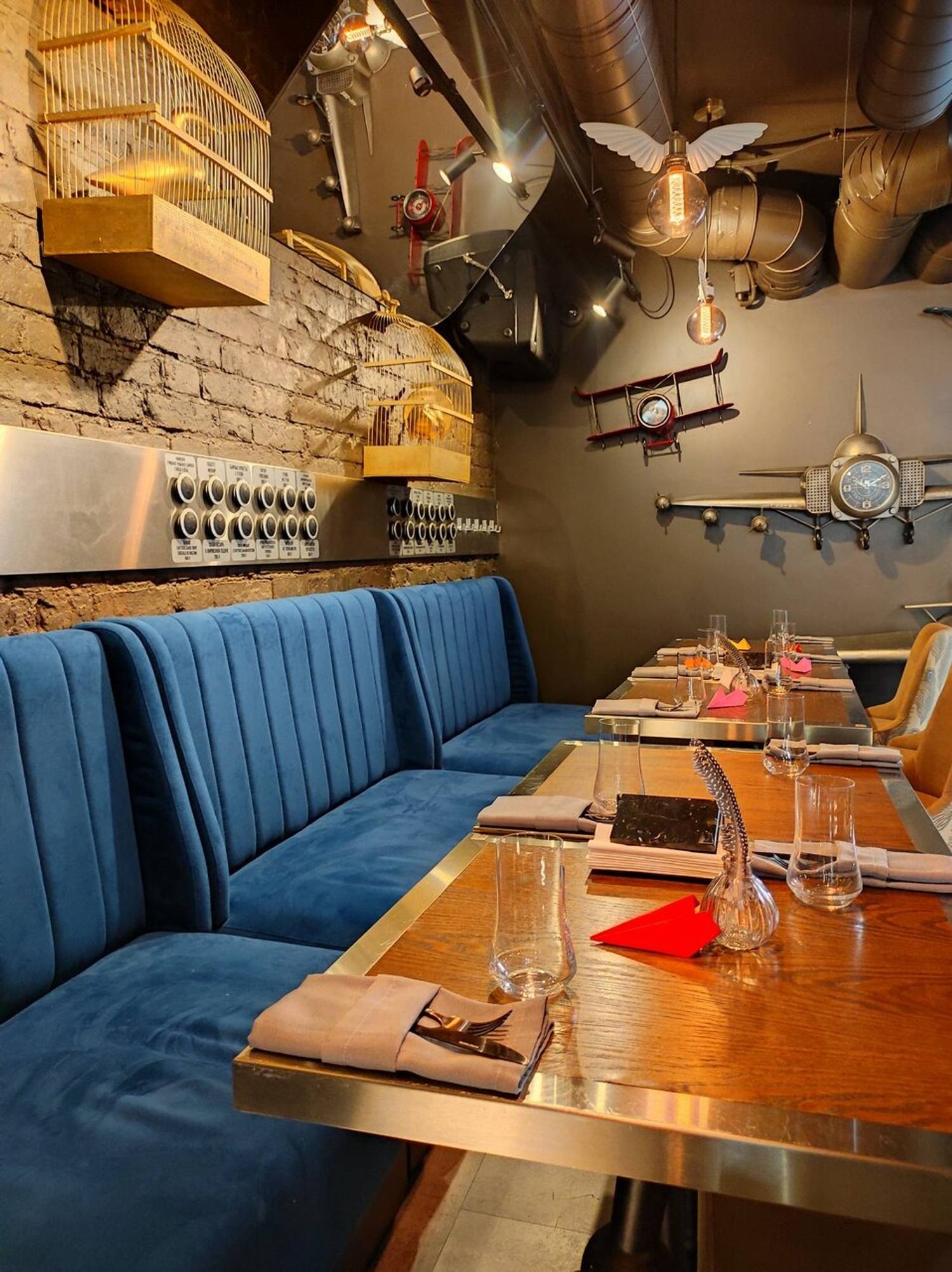 Атмосфера. Здесь все построено на эстетике полетов и авиационной стилистике. Синие диваны наводят на мысли о самолетных креслах, над столами парят лампочки с крыльями, а стены украшены ретро-самолетиками. При входе вас встретят сотрудники в форме пилотов, а дополнят атмосферу живая музыка и диджей-сеты по вечерам.