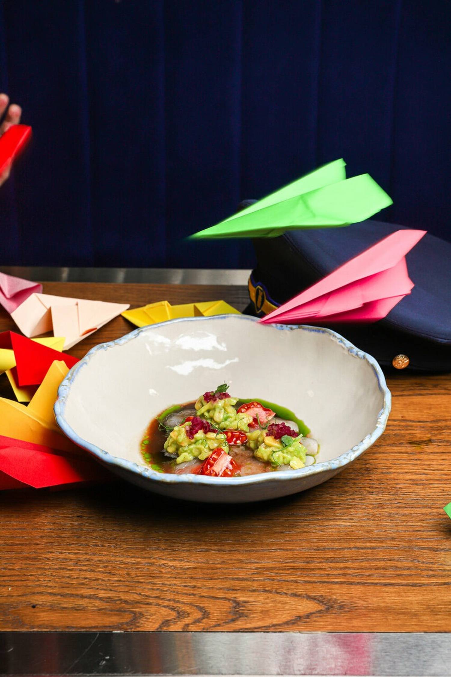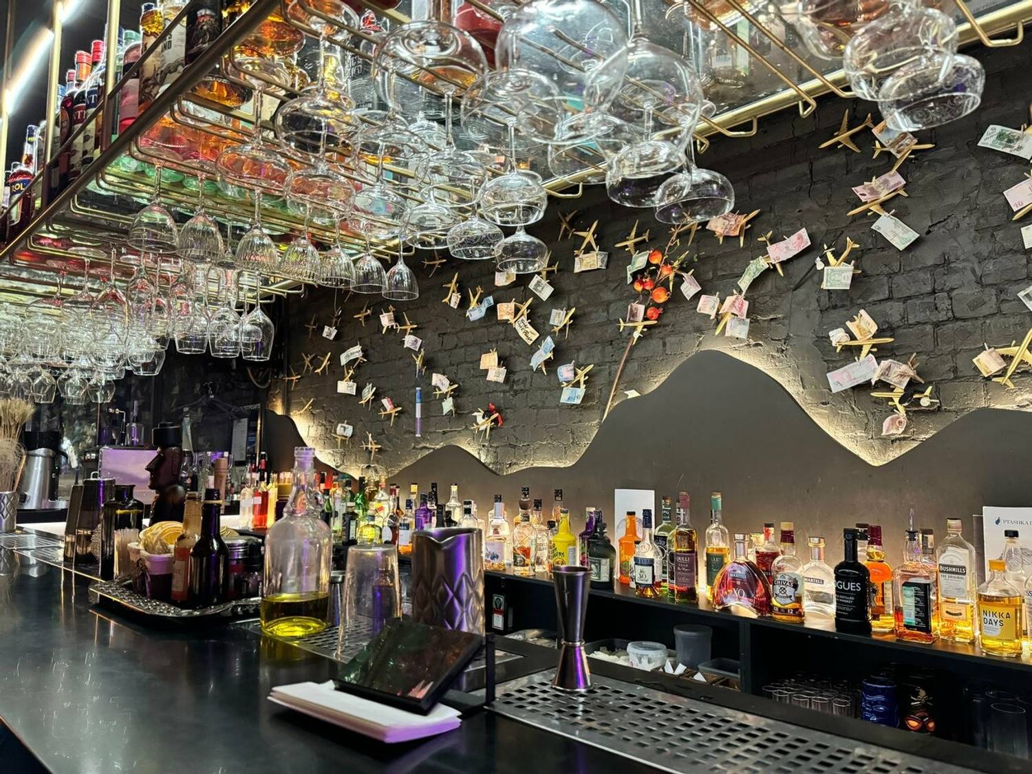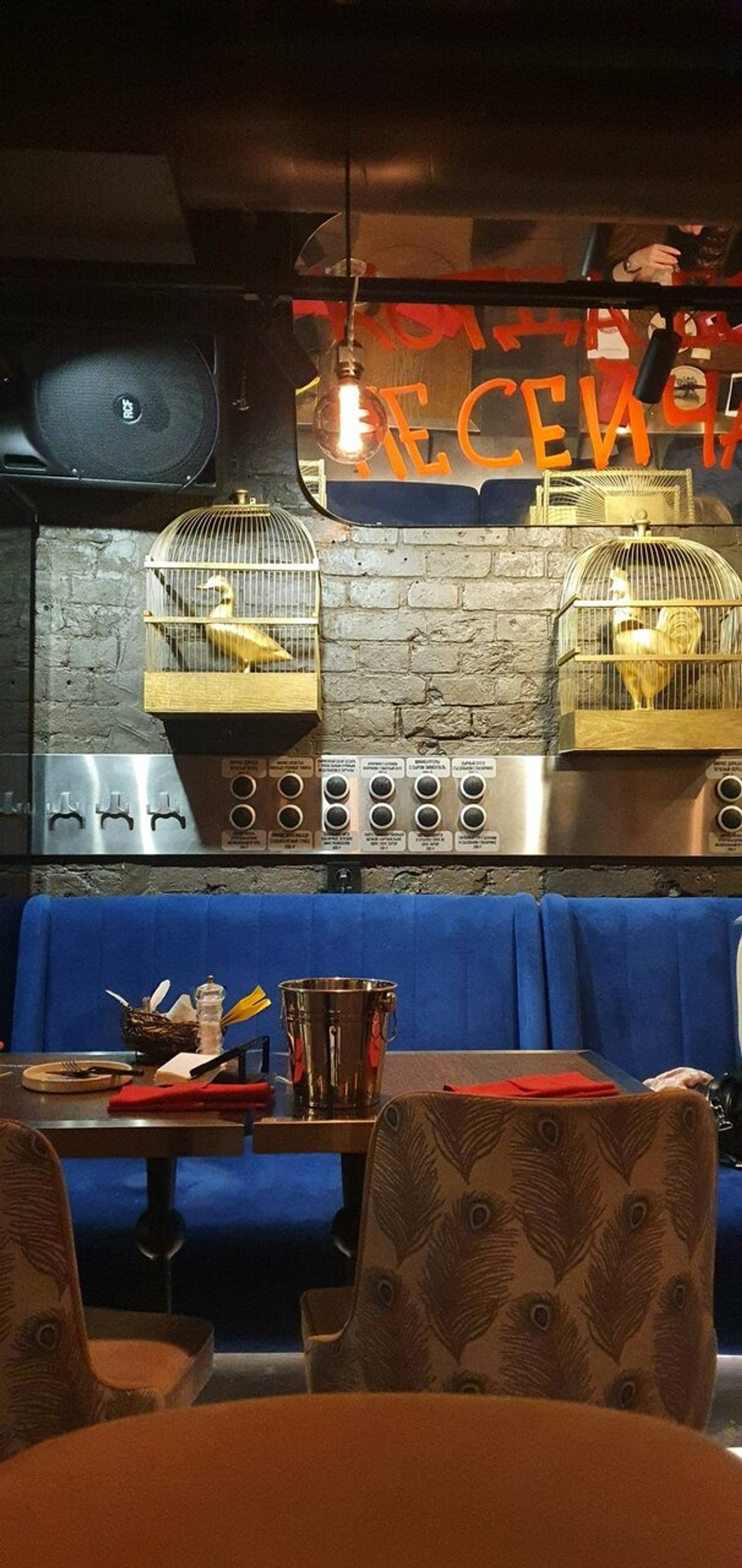 Атмосфера. Здесь все построено на эстетике полетов и авиационной стилистике. Синие диваны наводят на мысли о самолетных креслах, над столами парят лампочки с крыльями, а стены украшены ретро-самолетиками. При входе вас встретят сотрудники в форме пилотов, а дополнят атмосферу живая музыка и диджей-сеты по вечерам.