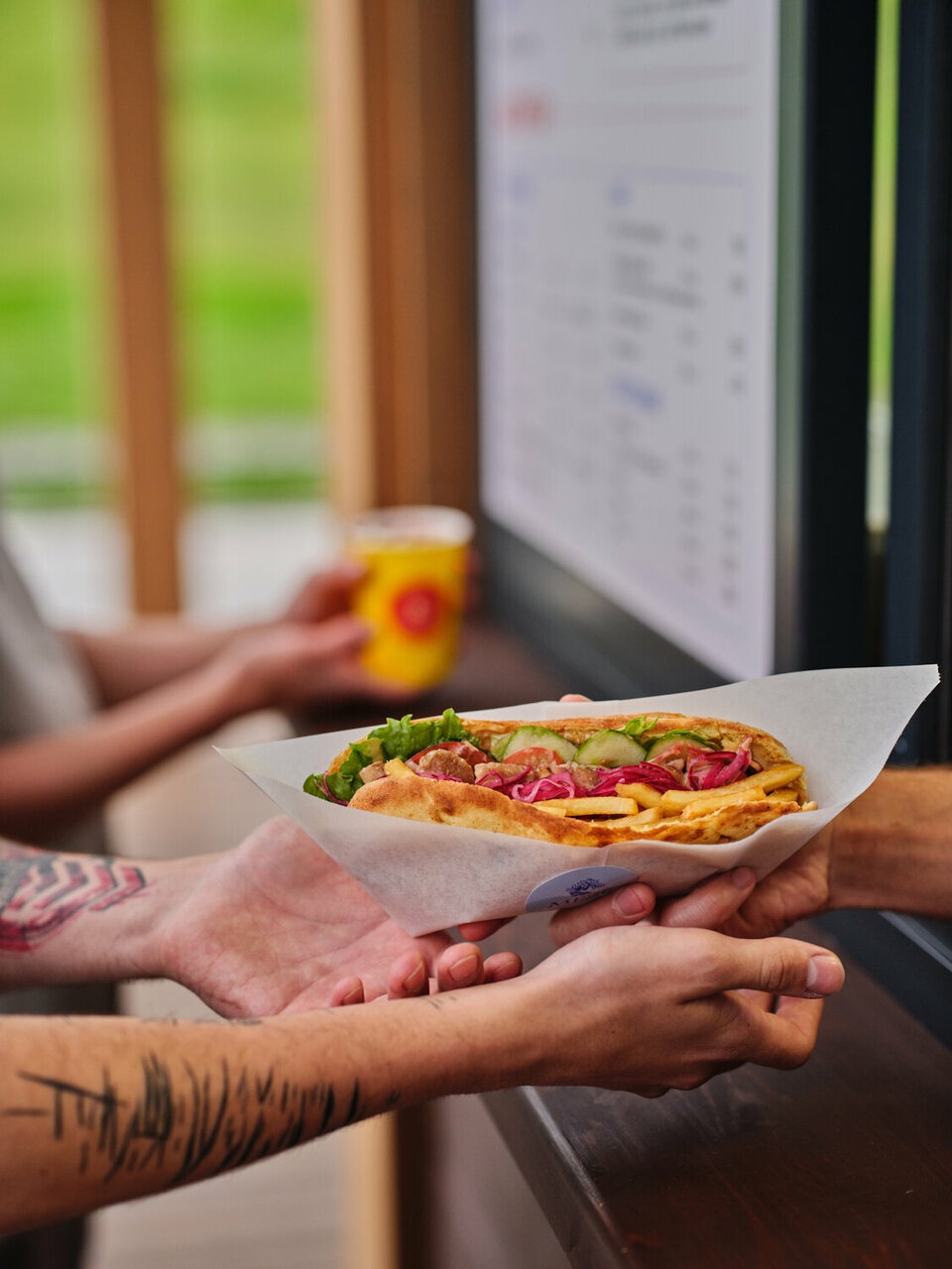 Еда и напитки. В меню — классический греческий стритфуд: гирос с сыром халуми, свининой и курицей, френч-дог, хот-дог Бруклин и салат с тунцом. Из напитков можно взять классический кофе, лимонад, фраппе и пиво на кране.