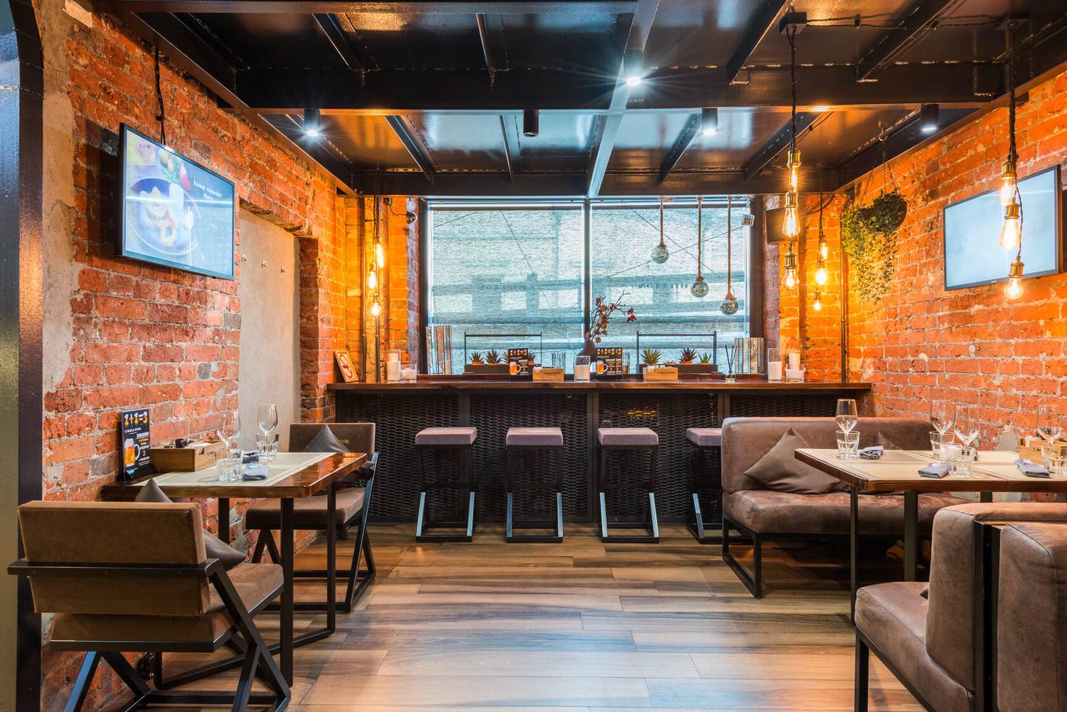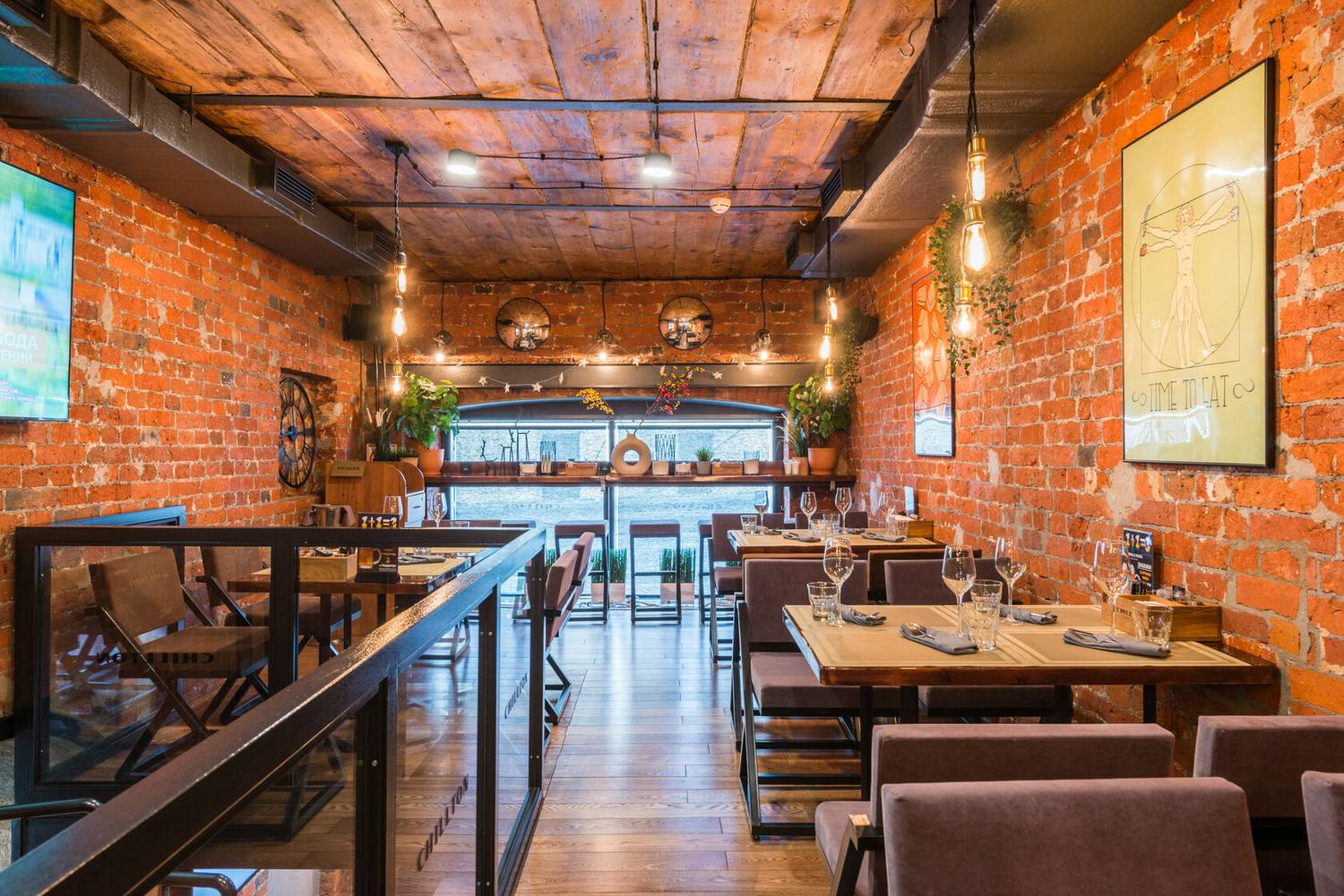 Атмосфера. Интерьер в стиле индустриального лофта с кирпичными стенами, винтажными деталями и приглушенным светом сохраняет особый дух места. Пространство разделено на два уровня: первый этаж задуман для вечеринок, второй — для более спокойных камерных ужинов.