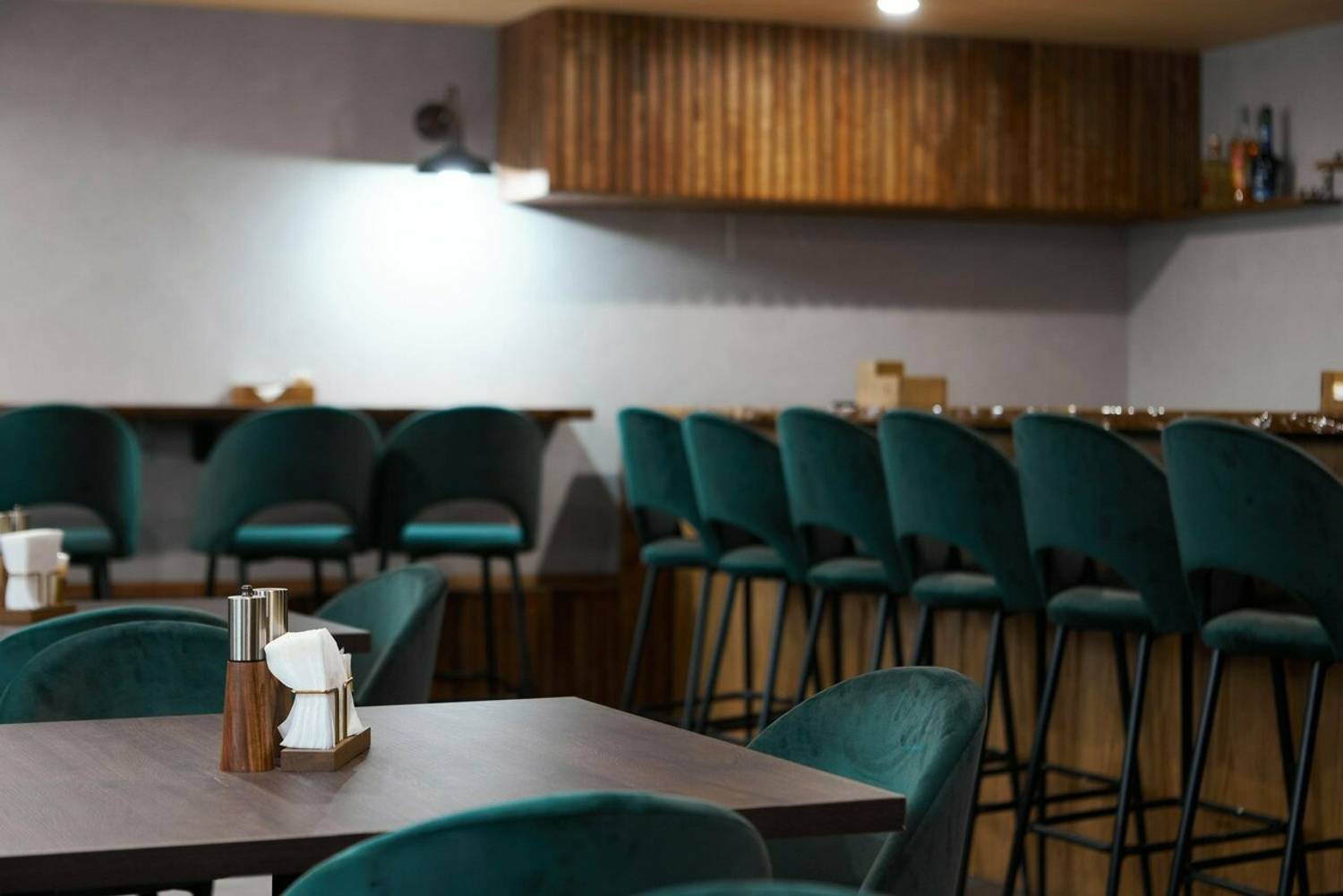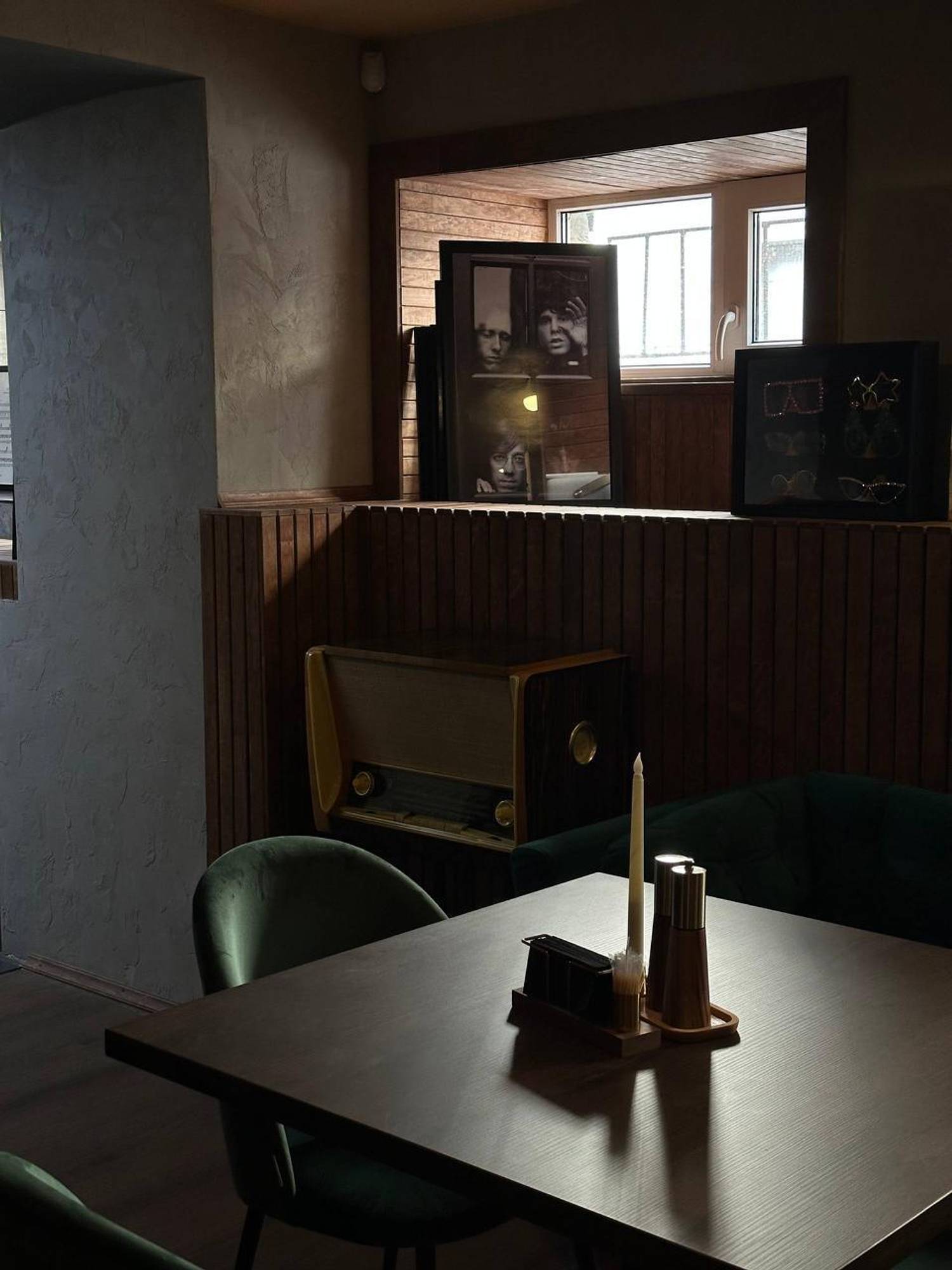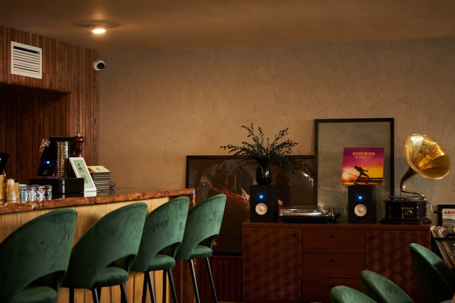 Атмосфера. Интерьер с деталями камерной гостиной: стеллажи со старыми книгами, граммофон, колонки и проигрыватель винила создают ностальгическую ауру. Изумрудные мягкие стулья и барная стойка с синей подсветкой добавляют современный, но сдержанный акцент.