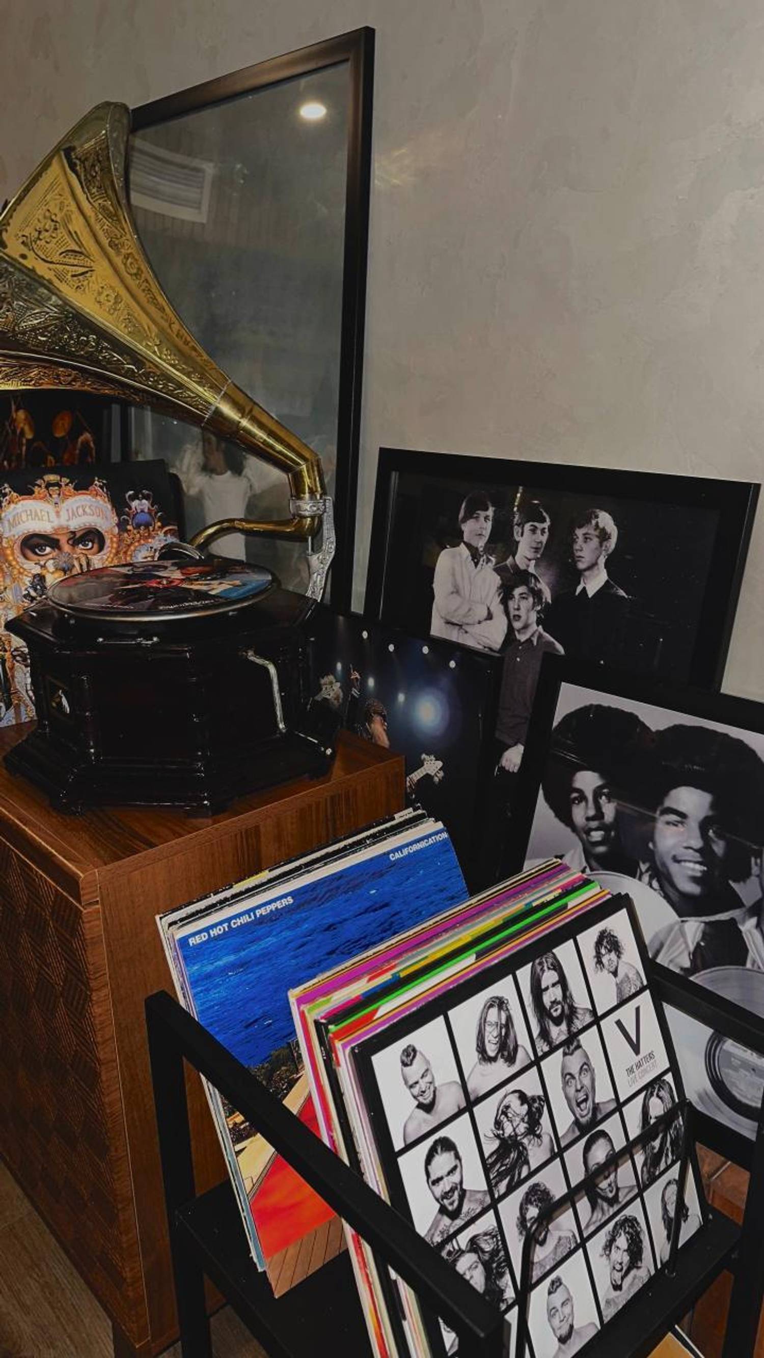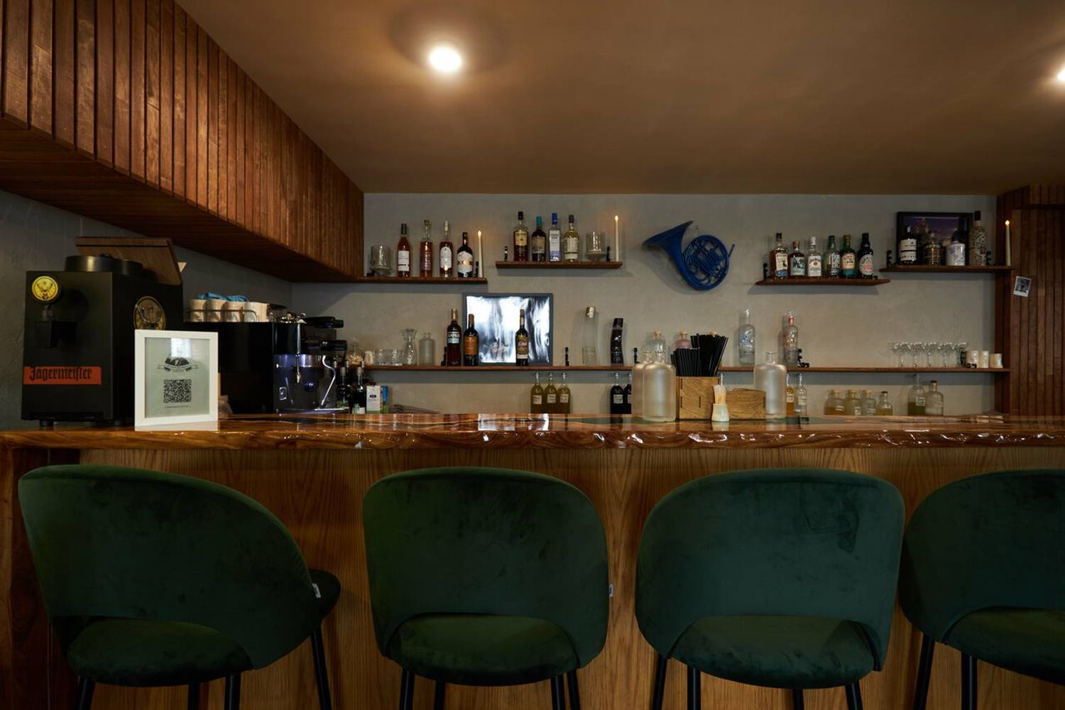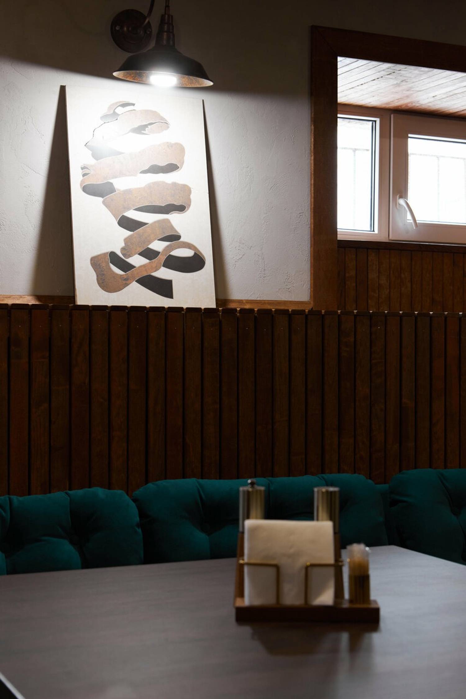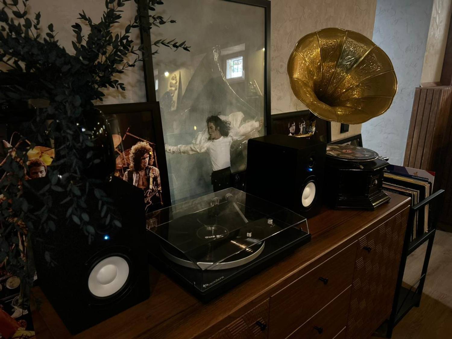 Атмосфера. Интерьер с деталями камерной гостиной: стеллажи со старыми книгами, граммофон, колонки и проигрыватель винила создают ностальгическую ауру. Изумрудные мягкие стулья и барная стойка с синей подсветкой добавляют современный, но сдержанный акцент.