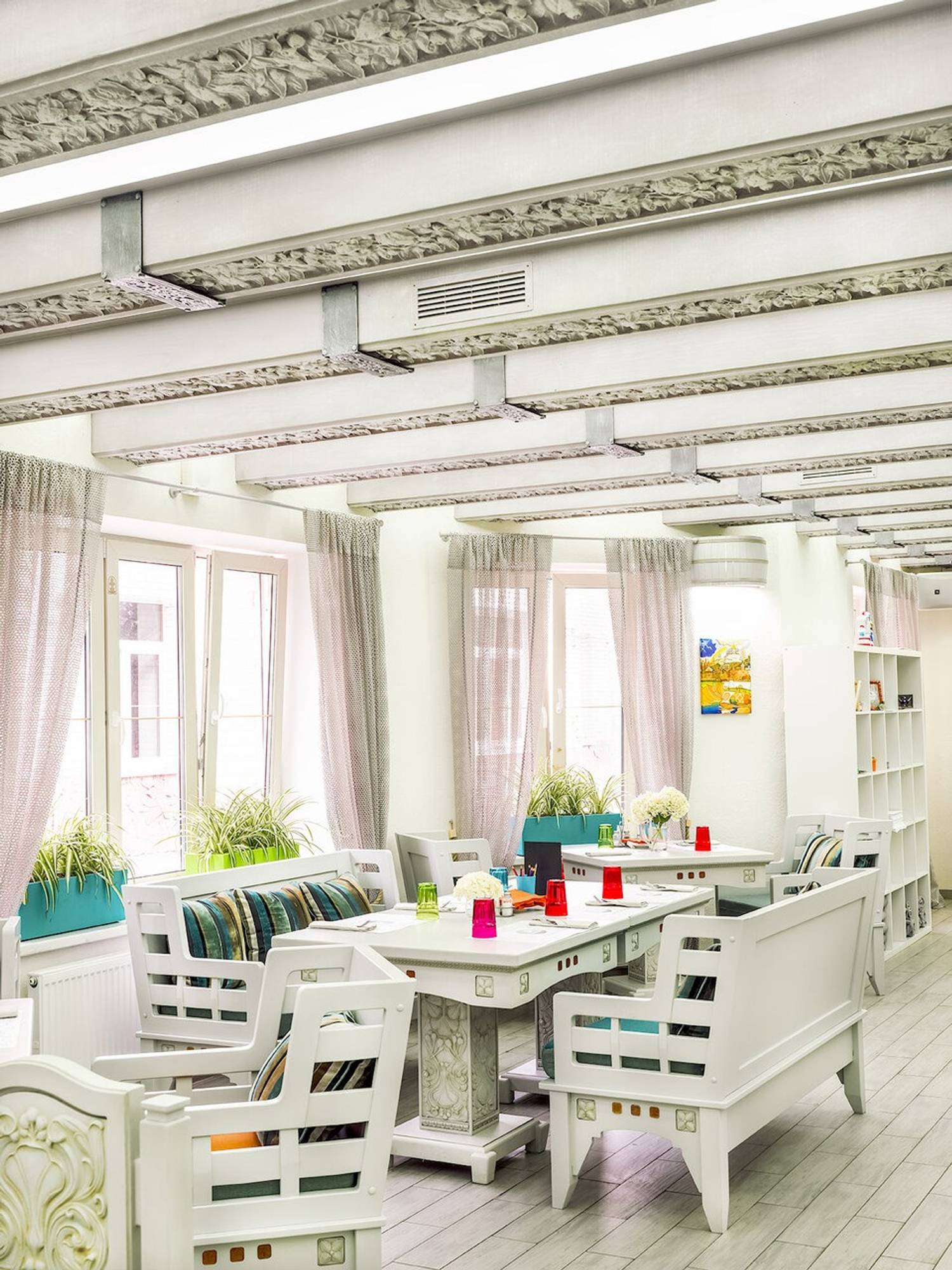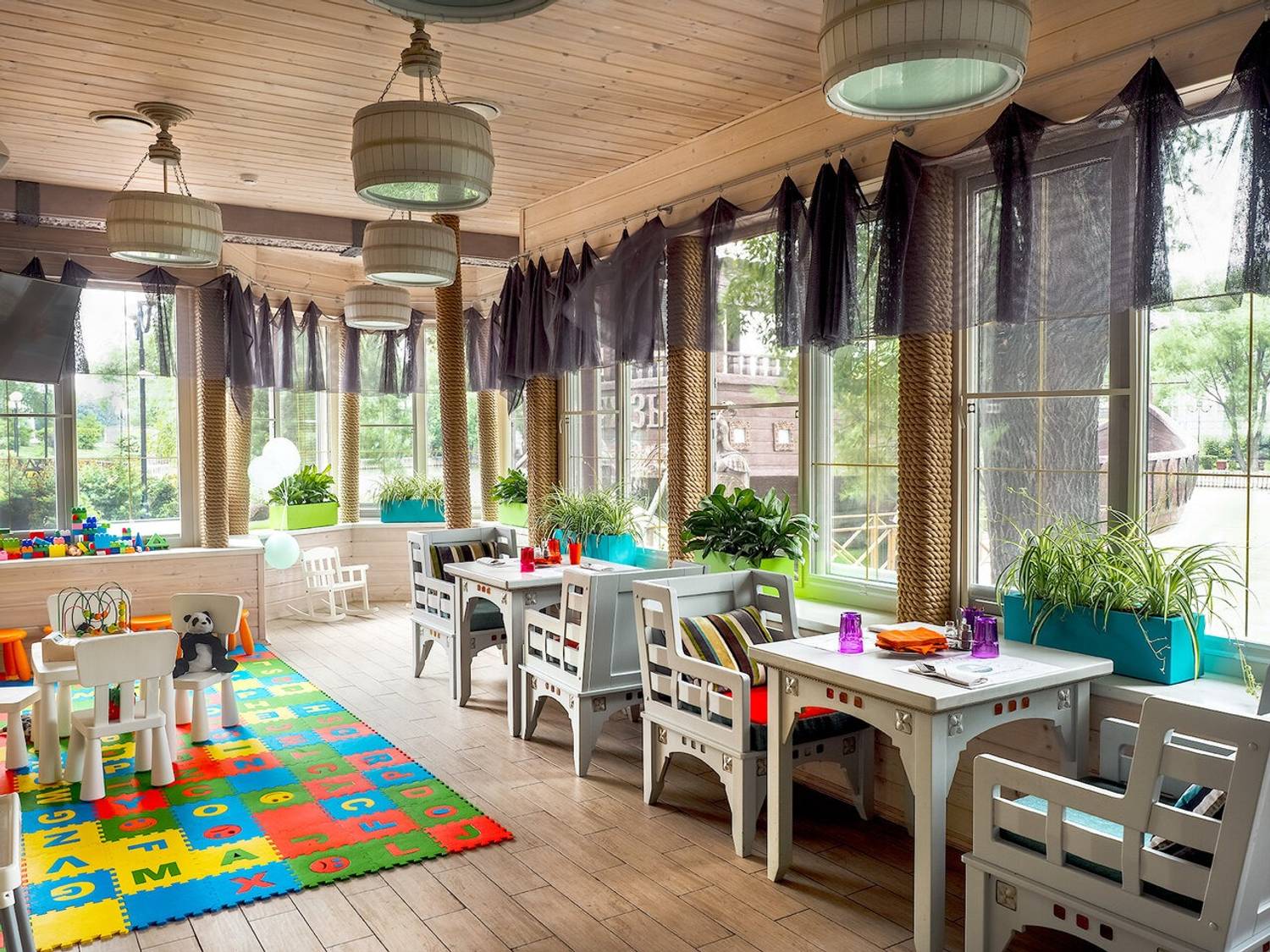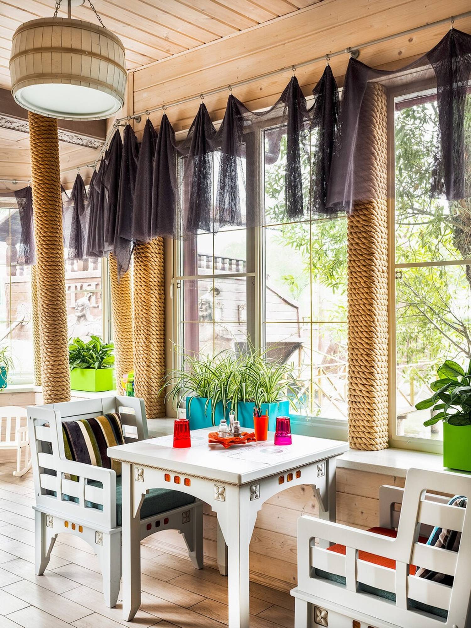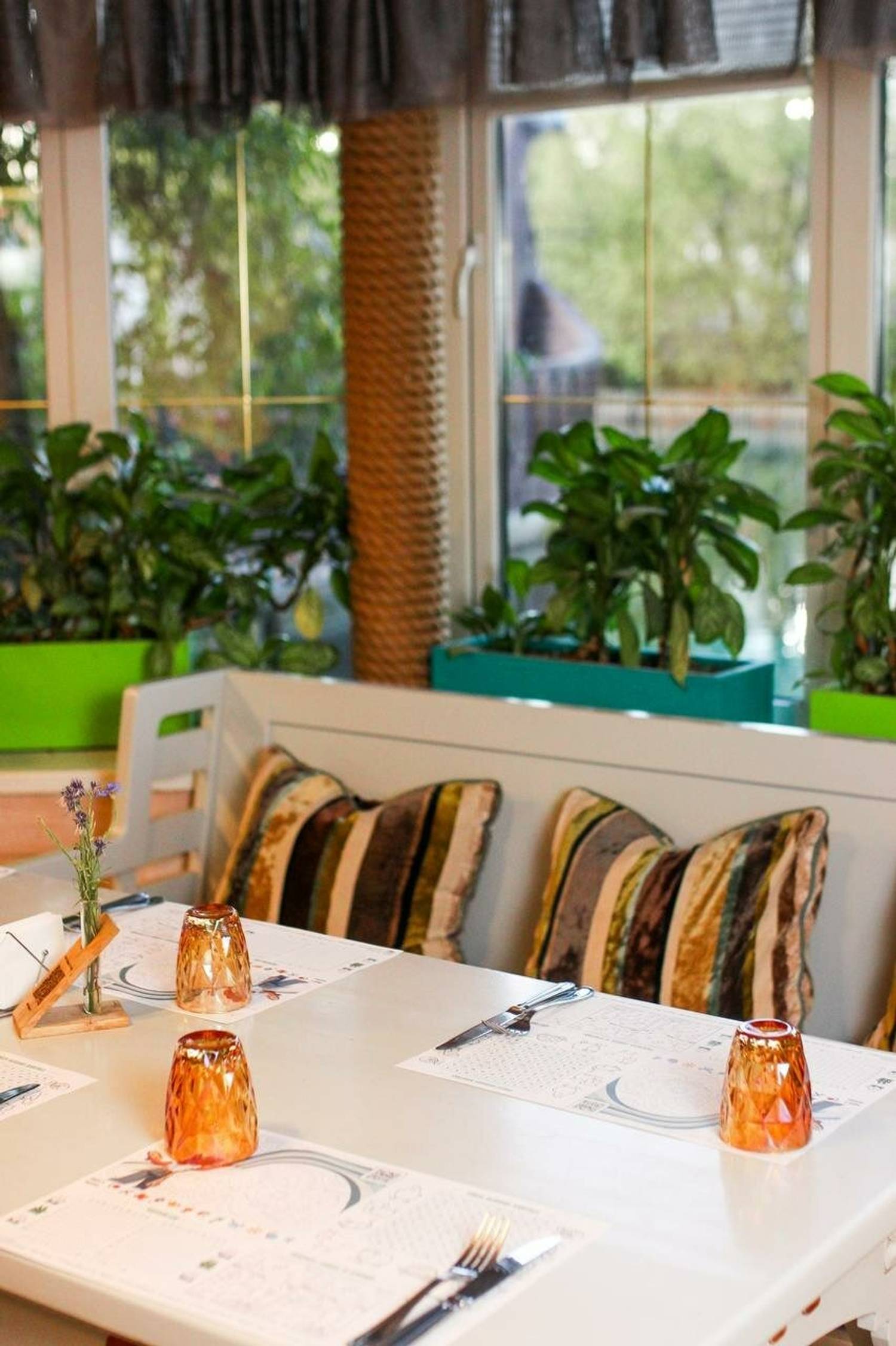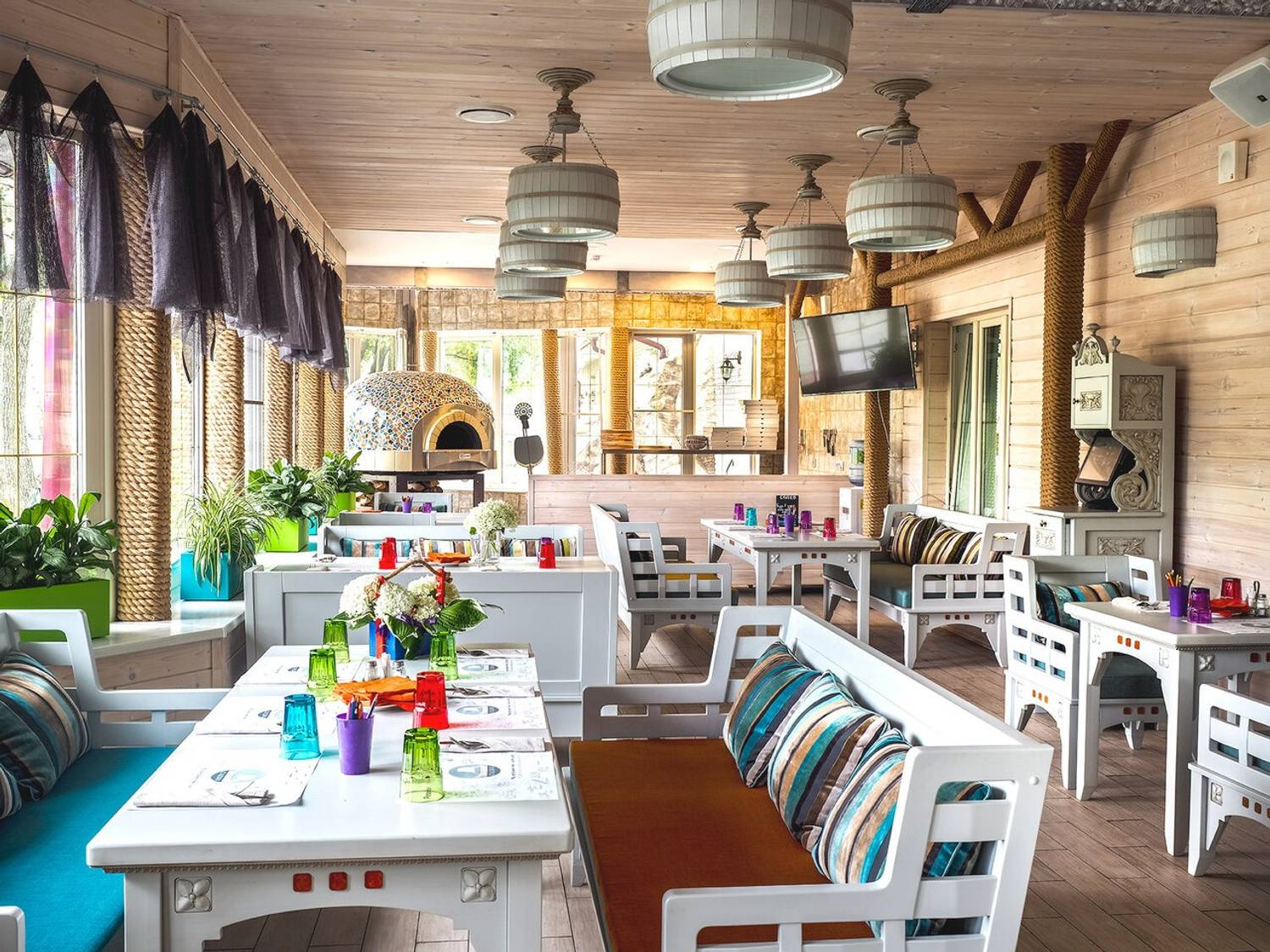 Атмосфера. Владельцам ресторана удалось объединить уют русской усадьбы и легкость средиземноморского стиля: люстры в виде деревянных бочек, яркие полосатые подушки и дровяная печь с мозаичной отделкой. Летом гости могут провести время на террасе-ладье прямо на воде, наблюдая за лебедями, а дети — играть на площадке с батутом.