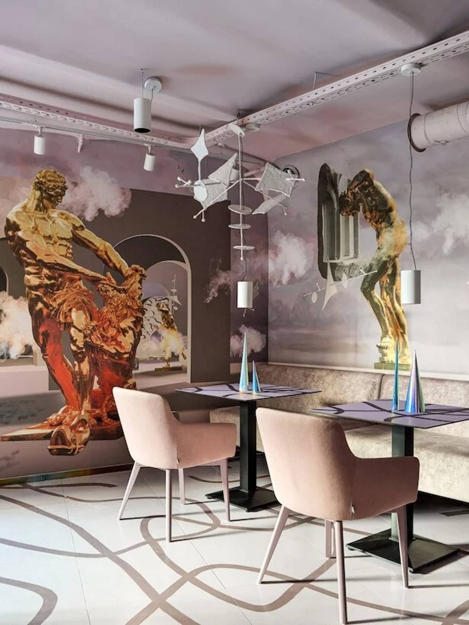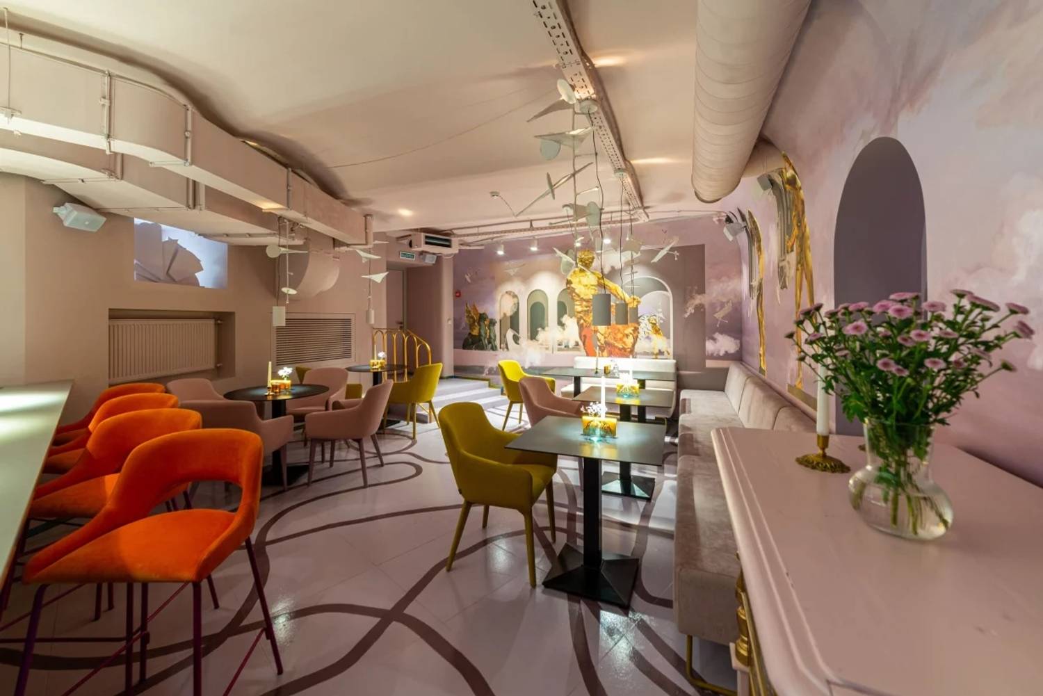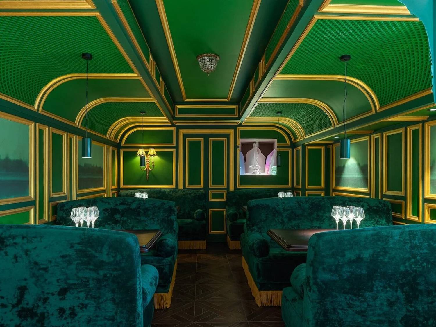 Атмосфера. Пространство делится на две зоны: первая оформлена в изумрудно-зеленых тонах с золотыми деталями, вторая — в нежно-розовой гамме с арочными проемами, создающая мечтательную атмосферу. Летняя терраса открывает вид на город, а интерьер сочетает исторические элементы XIX века с современным комфортом.