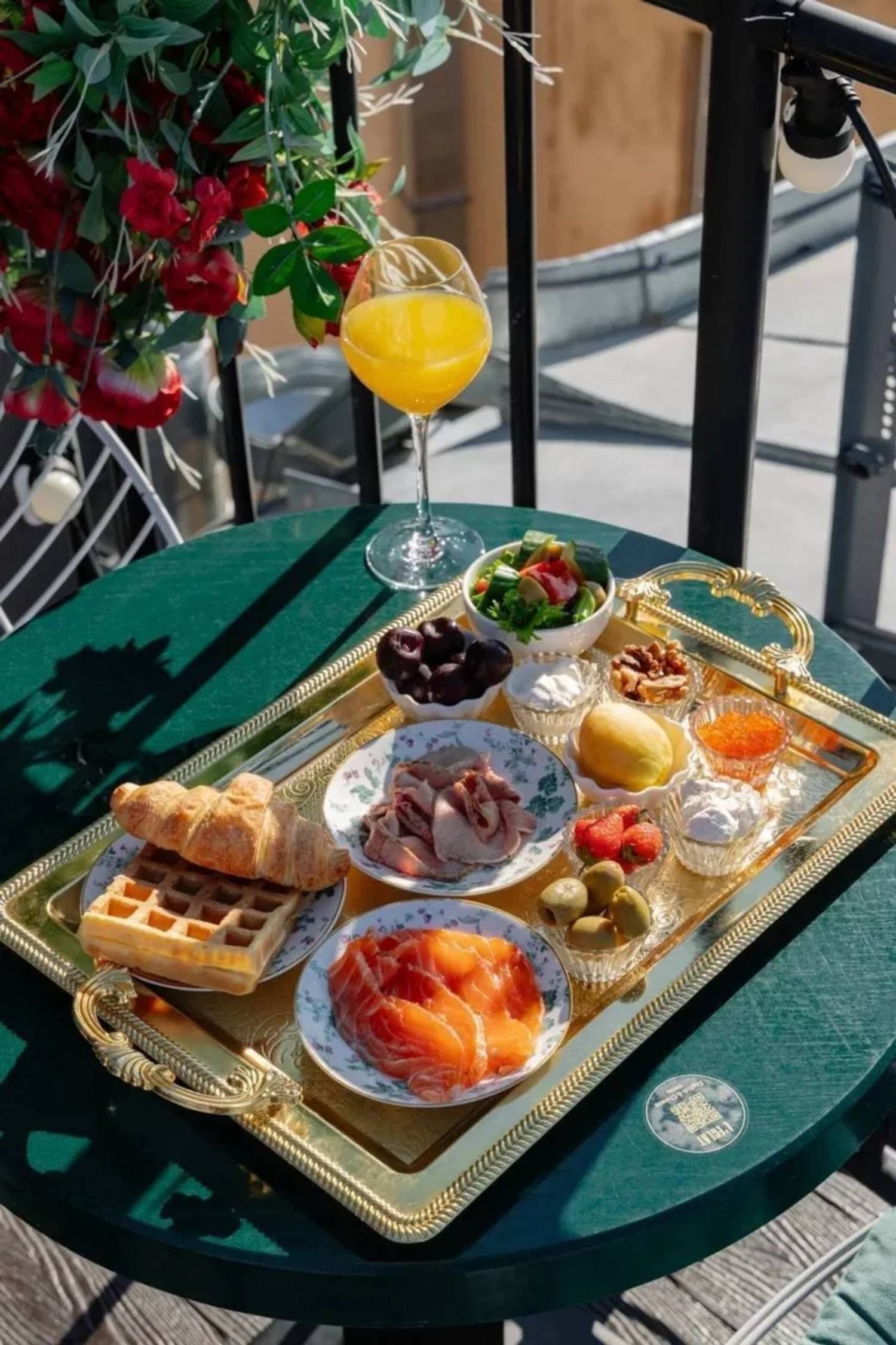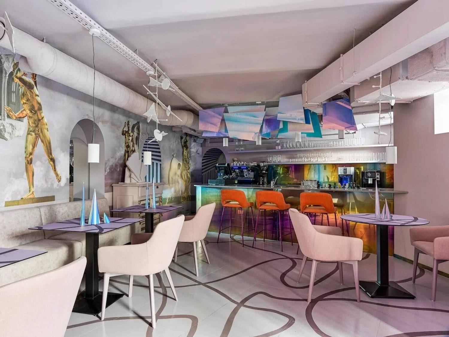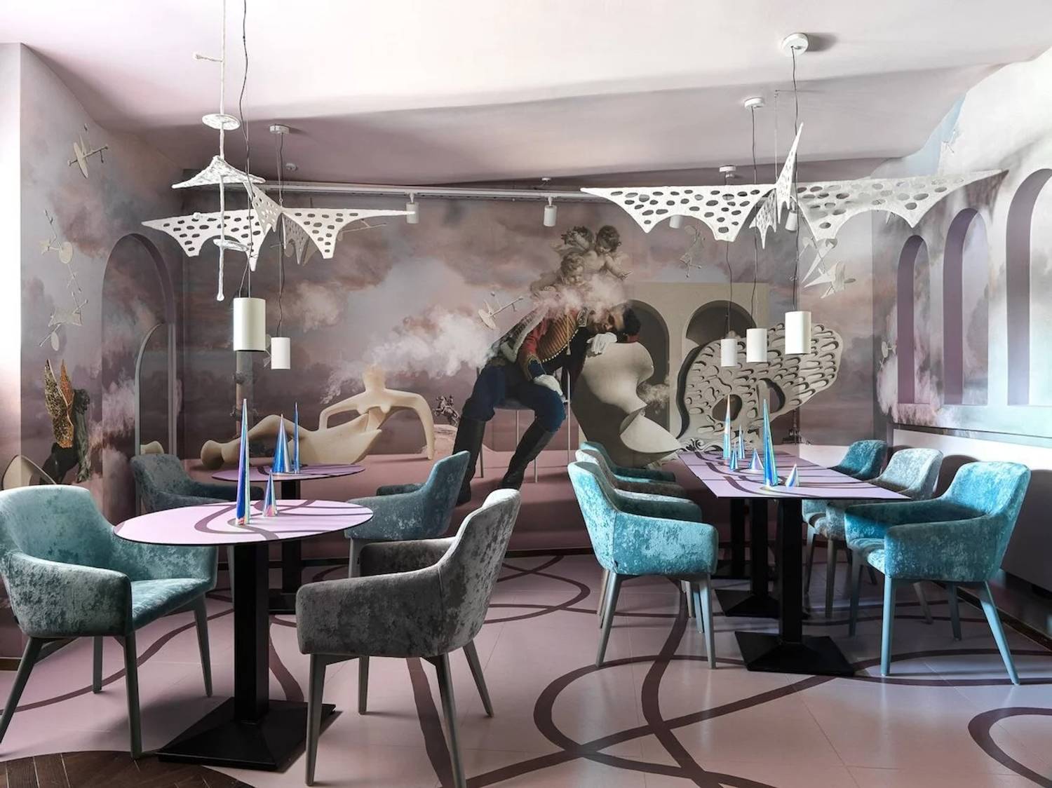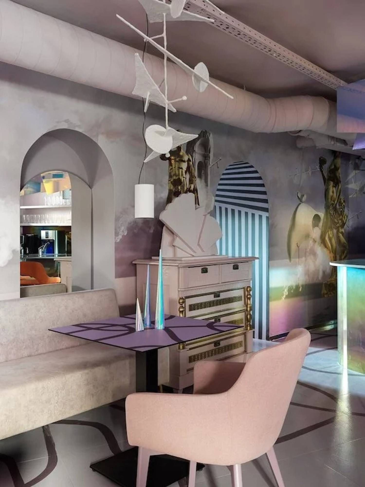 Атмосфера. Пространство делится на две зоны: первая оформлена в изумрудно-зеленых тонах с золотыми деталями, вторая — в нежно-розовой гамме с арочными проемами, создающая мечтательную атмосферу. Летняя терраса открывает вид на город, а интерьер сочетает исторические элементы XIX века с современным комфортом.