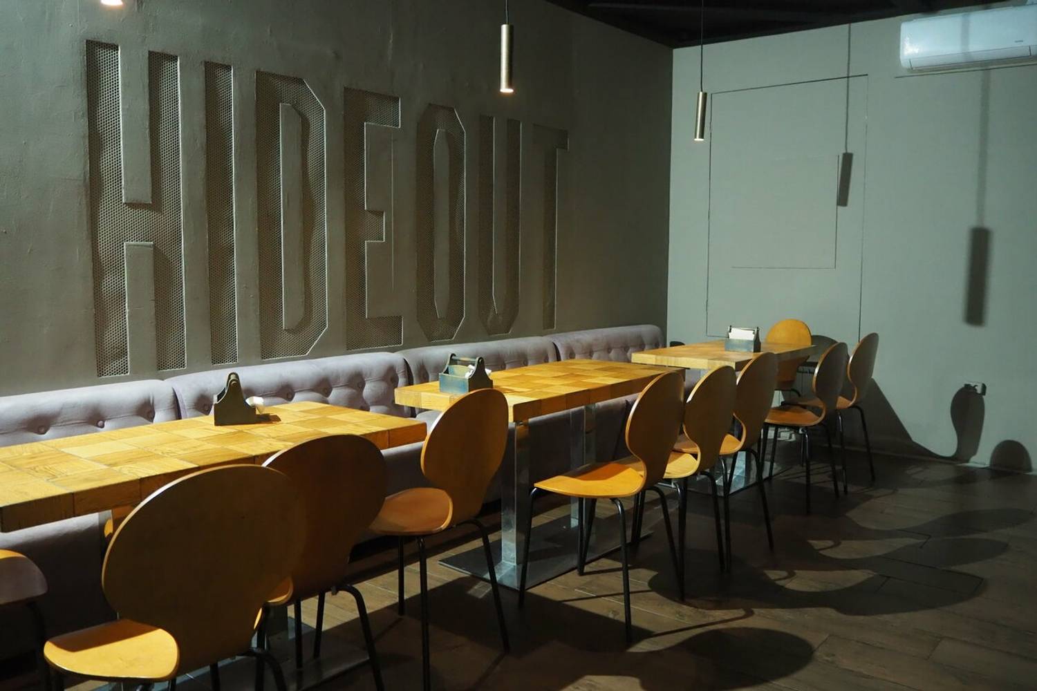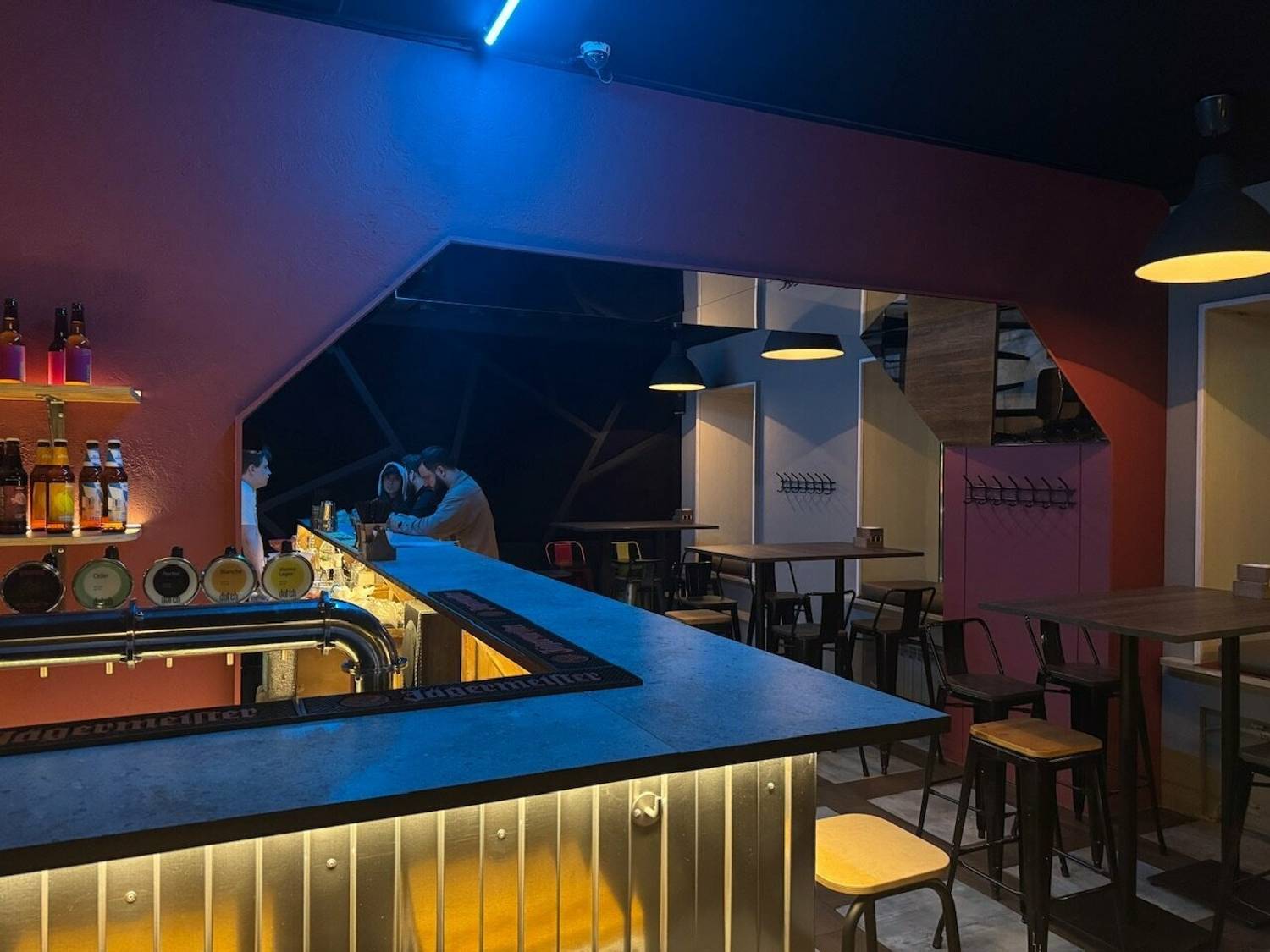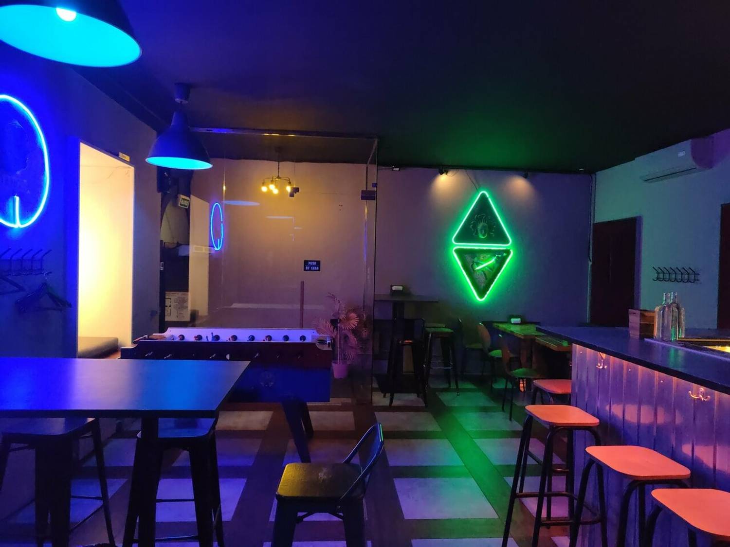 Атмосфера. Индустриальный стиль с металлической барной стойкой с подсветкой, неоновыми кругами и треугольниками на стенах и деревянными столами. Из развлечений для гостей есть настольный футбол.