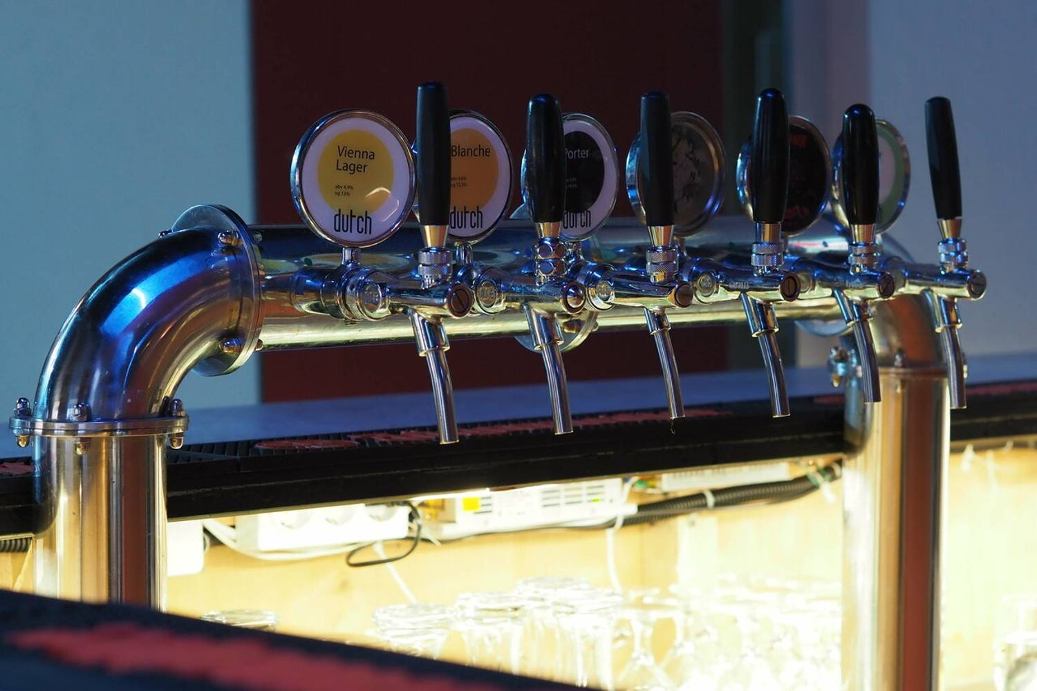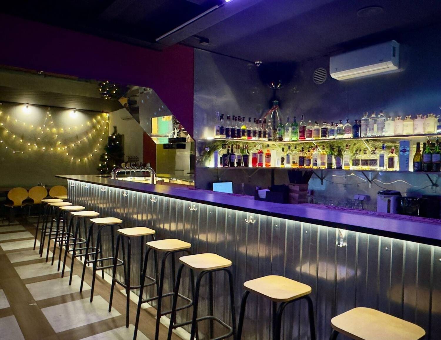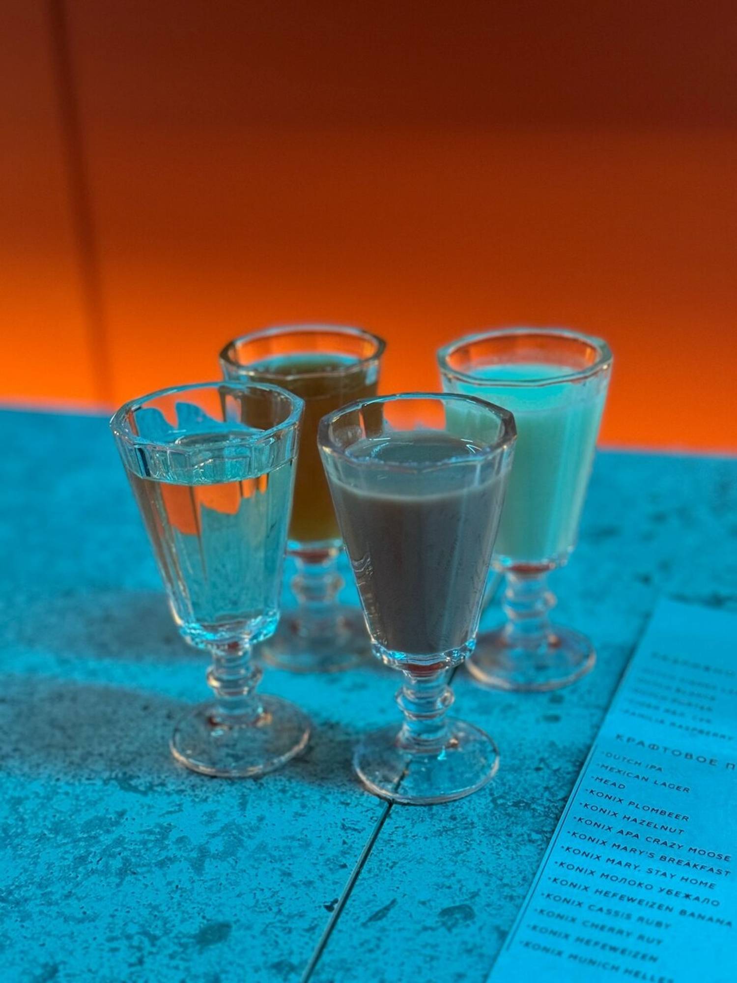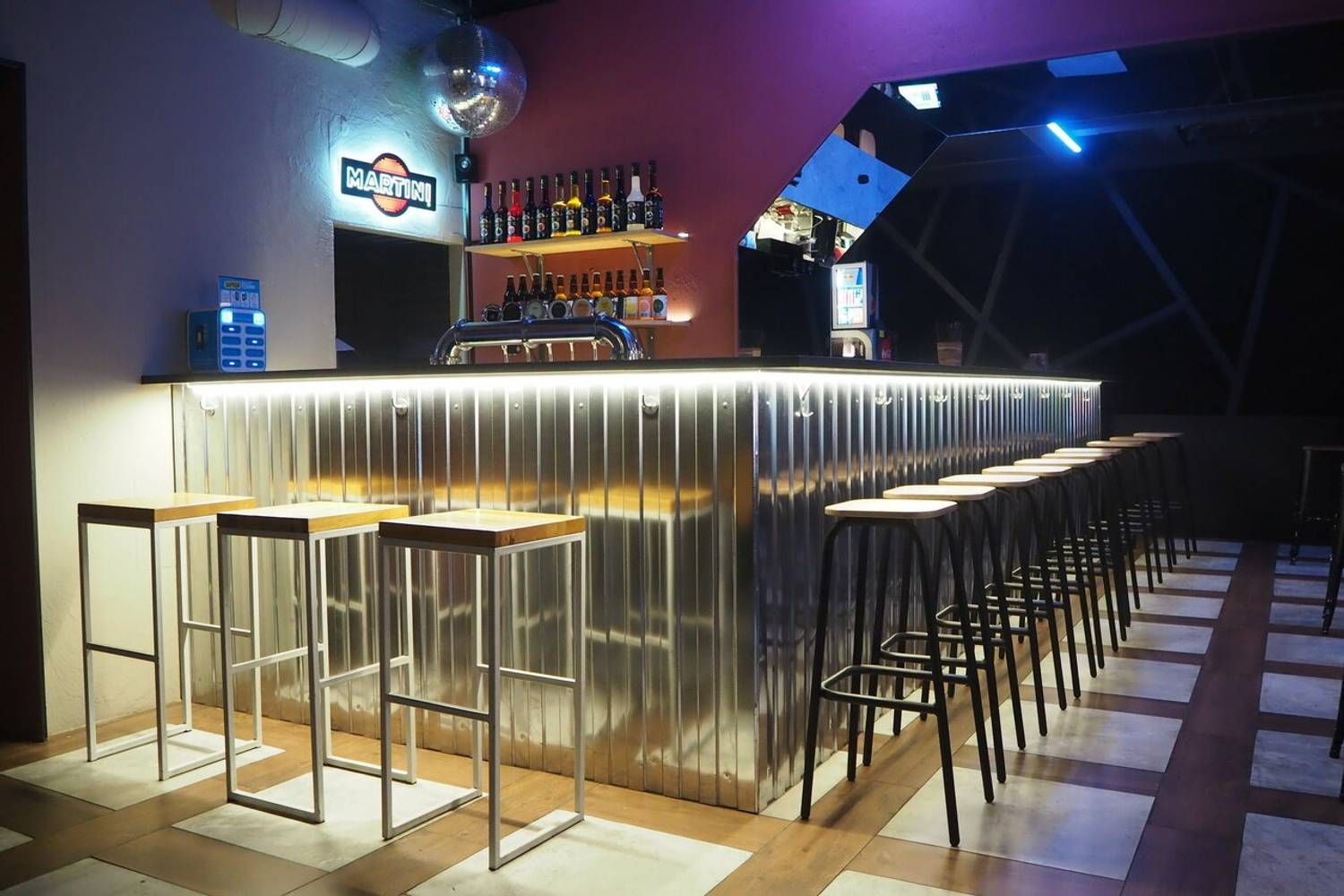 Атмосфера. Индустриальный стиль с металлической барной стойкой с подсветкой, неоновыми кругами и треугольниками на стенах и деревянными столами. Из развлечений для гостей есть настольный футбол.