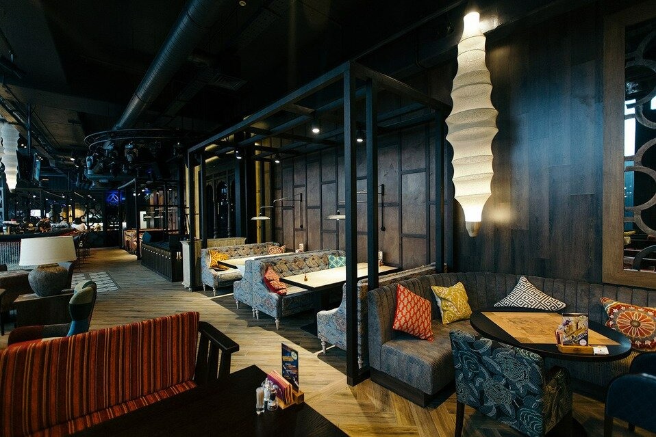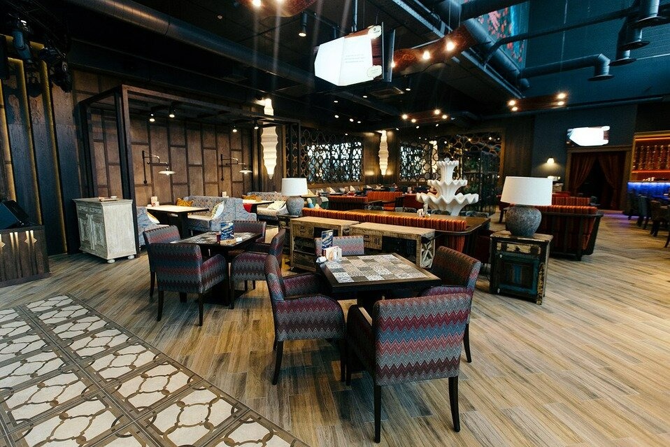Атмосфера. Просторный залом с террасой, где можно провести время в теплую погоду. Интерьер сочетает восточные мотивы с современным дизайном: диванами с узорами и декором, похожим на фонтаны. Для гостей с детьми есть игровая комната с игрушками. По выходным проходят вечеринки с живыми выступлениями вокалистов, диджеями и ведущими.