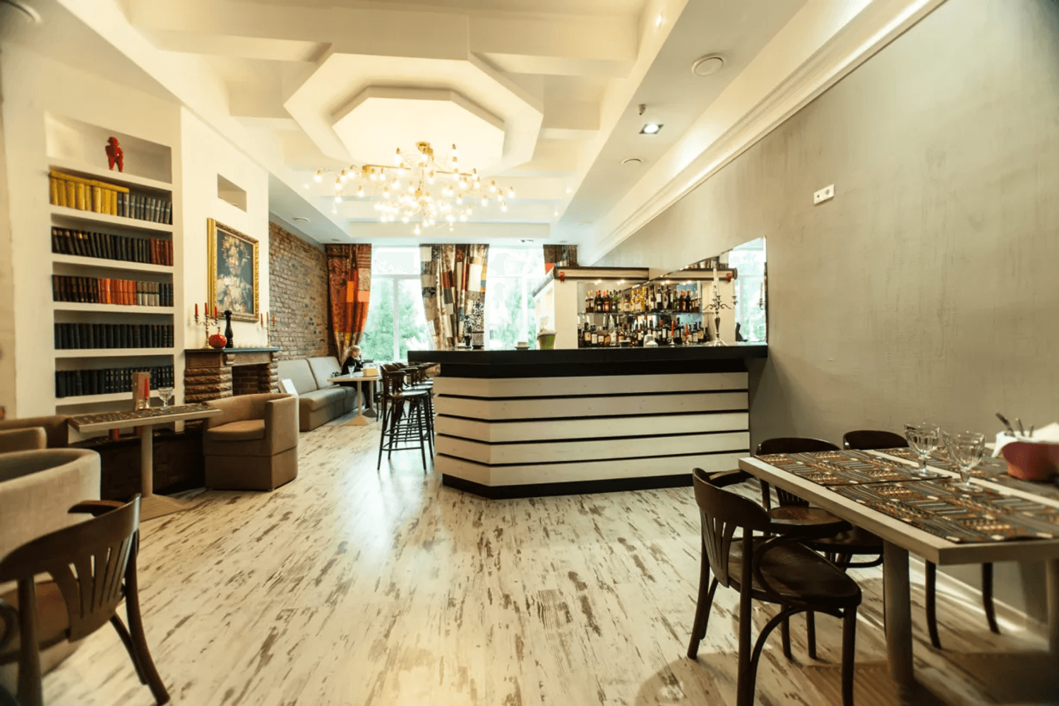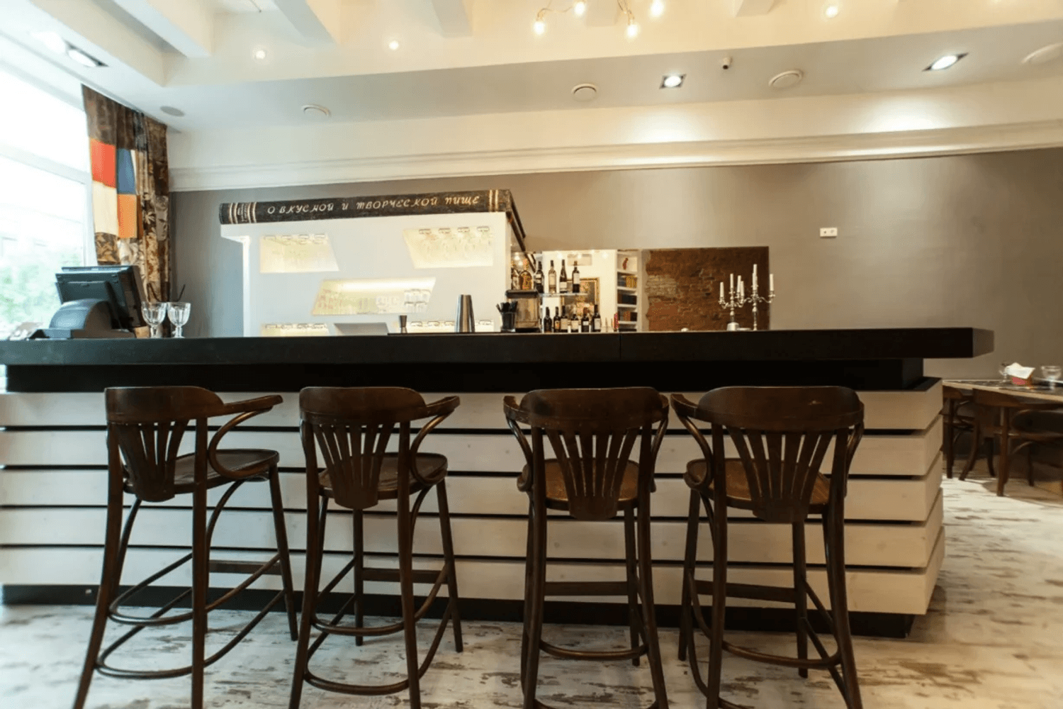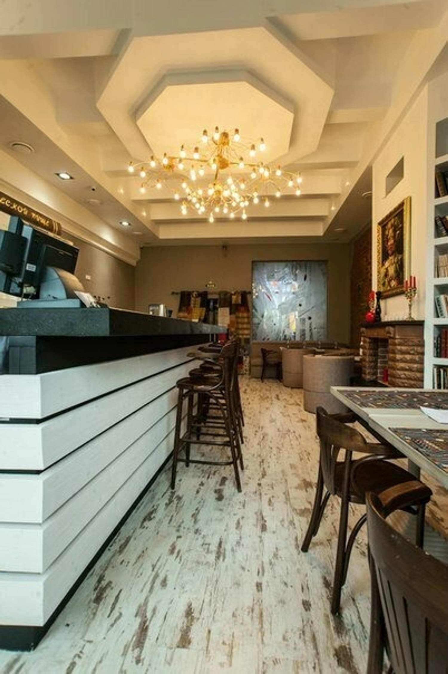 Атмосфера. Современное пространство оправдывает то, что находится в арт-кластере: внутри — картины на стенах, открытая полка с книгами и мягкое освещение. Можно расположиться как за столом, так и за барной стойкой.