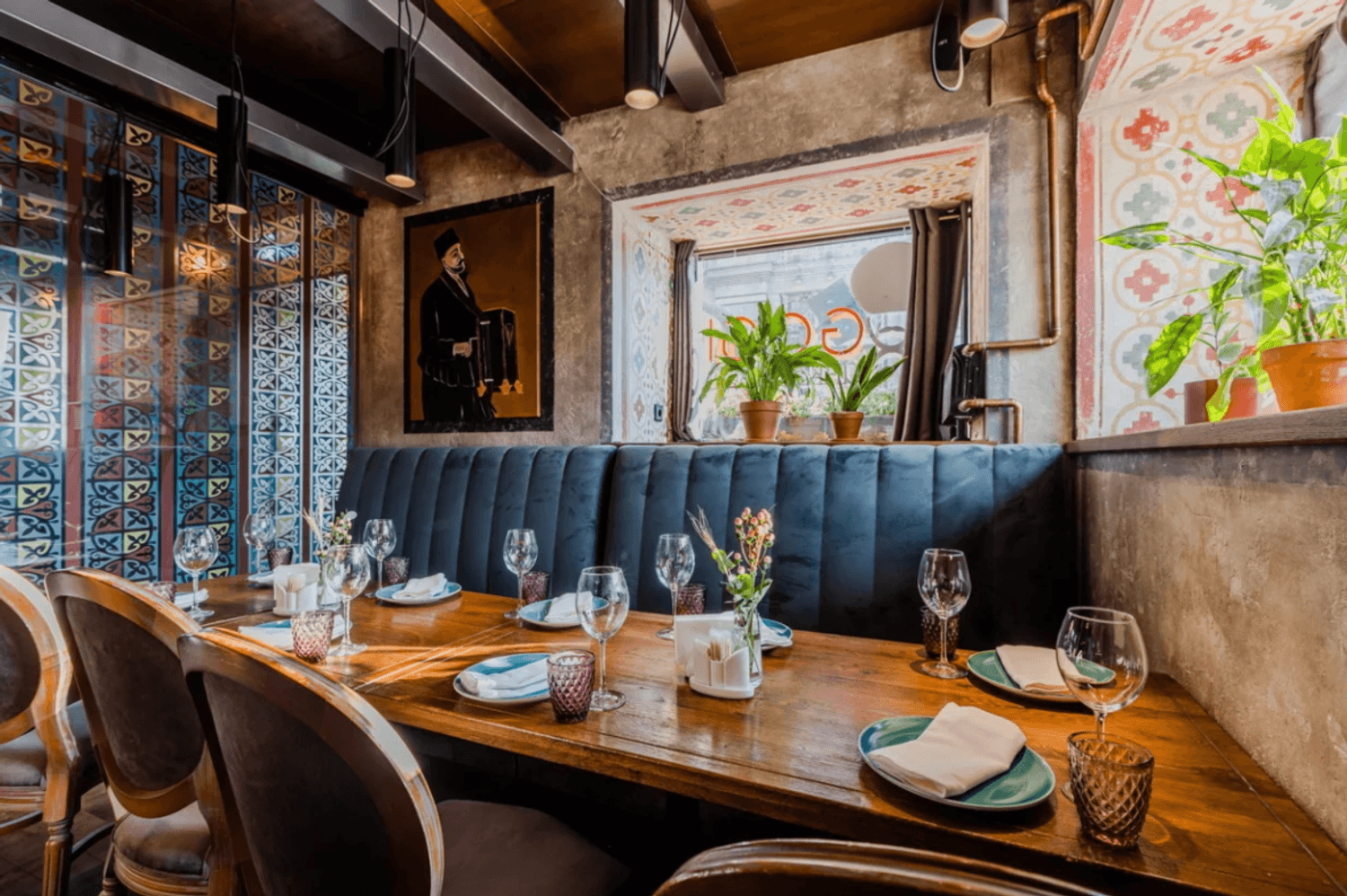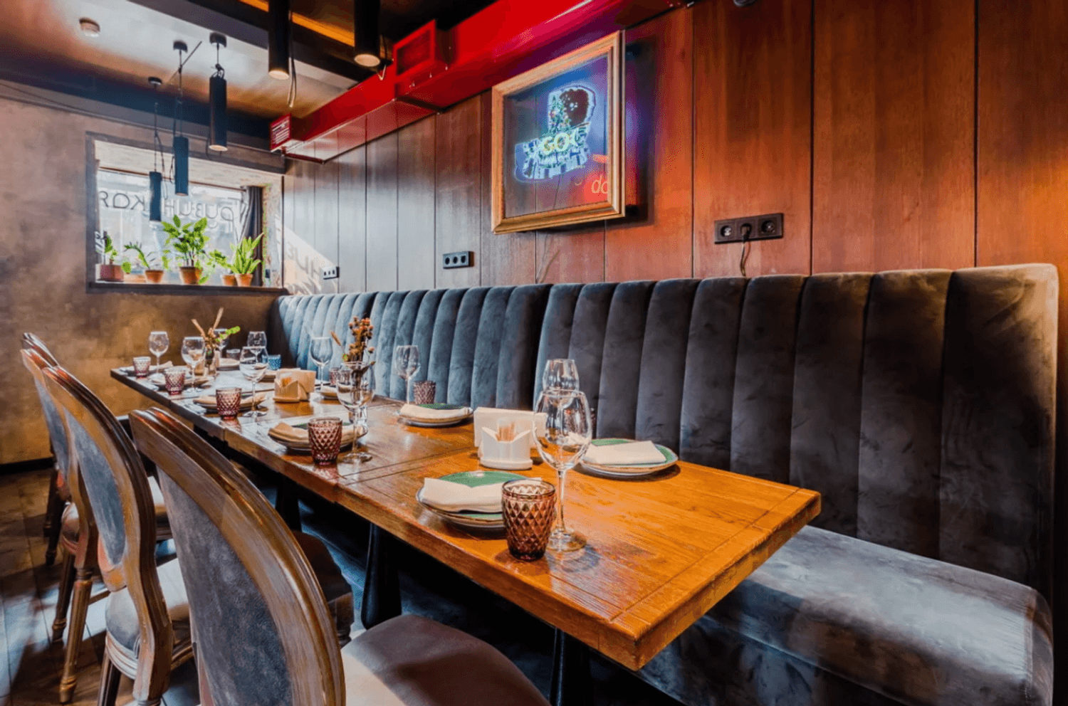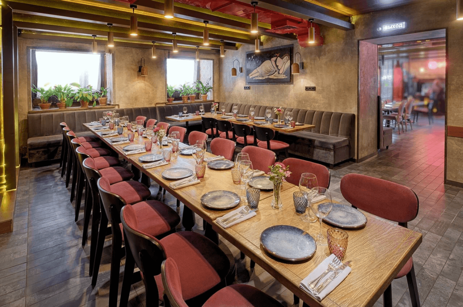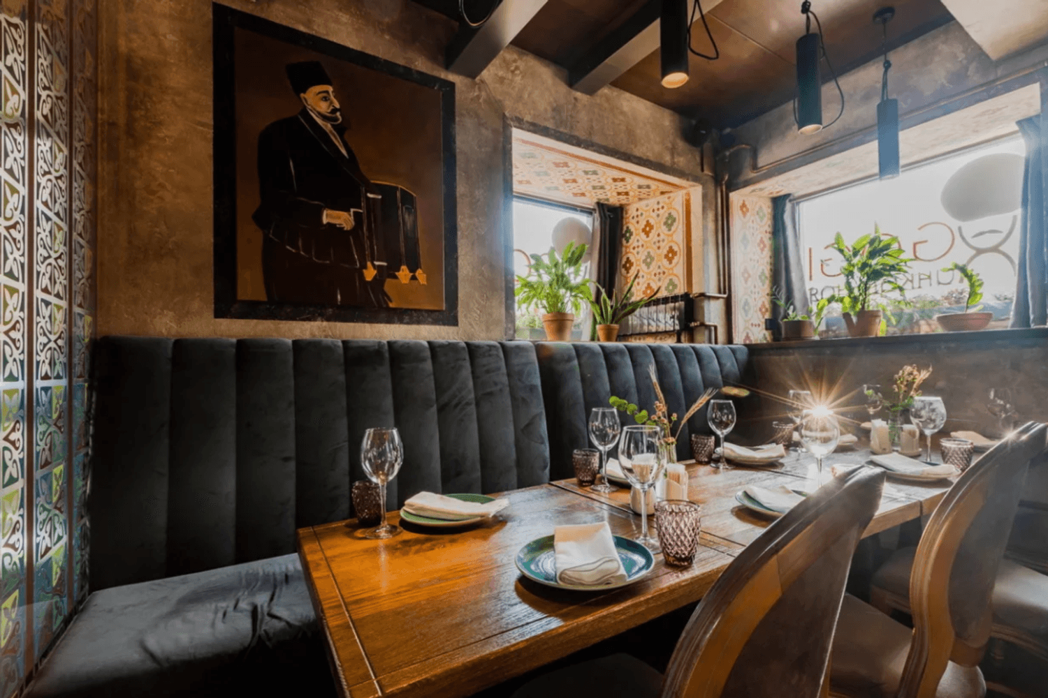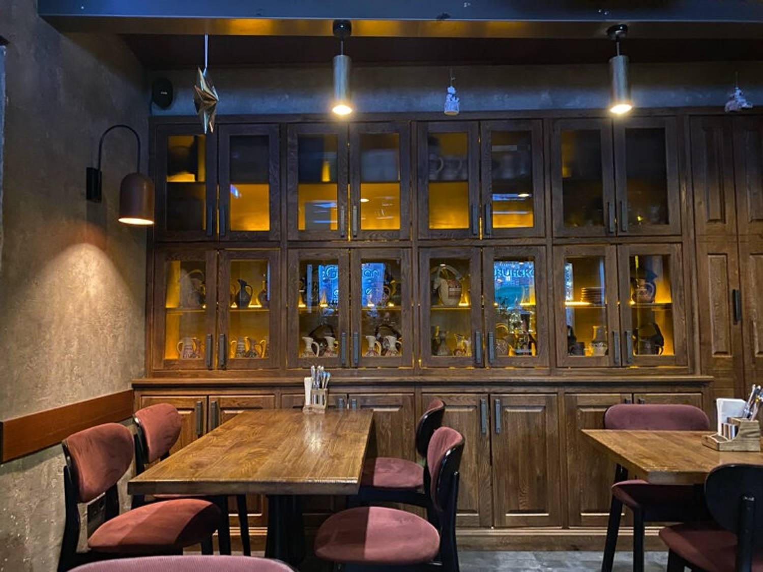 Атмосфера. Арки на подоконниках с грузинскими орнаментами, рисунки пирующих грузин и декоративные тарелки с цветочной росписью — в таком интерьере улыбка настроение поднимается само по себе. Барную стойку тоже оформили орнаментальной плиткой, шкафы с керамической посудой и стилизованное панно с хинкали дополняют образ гостеприимного кавказского дома.