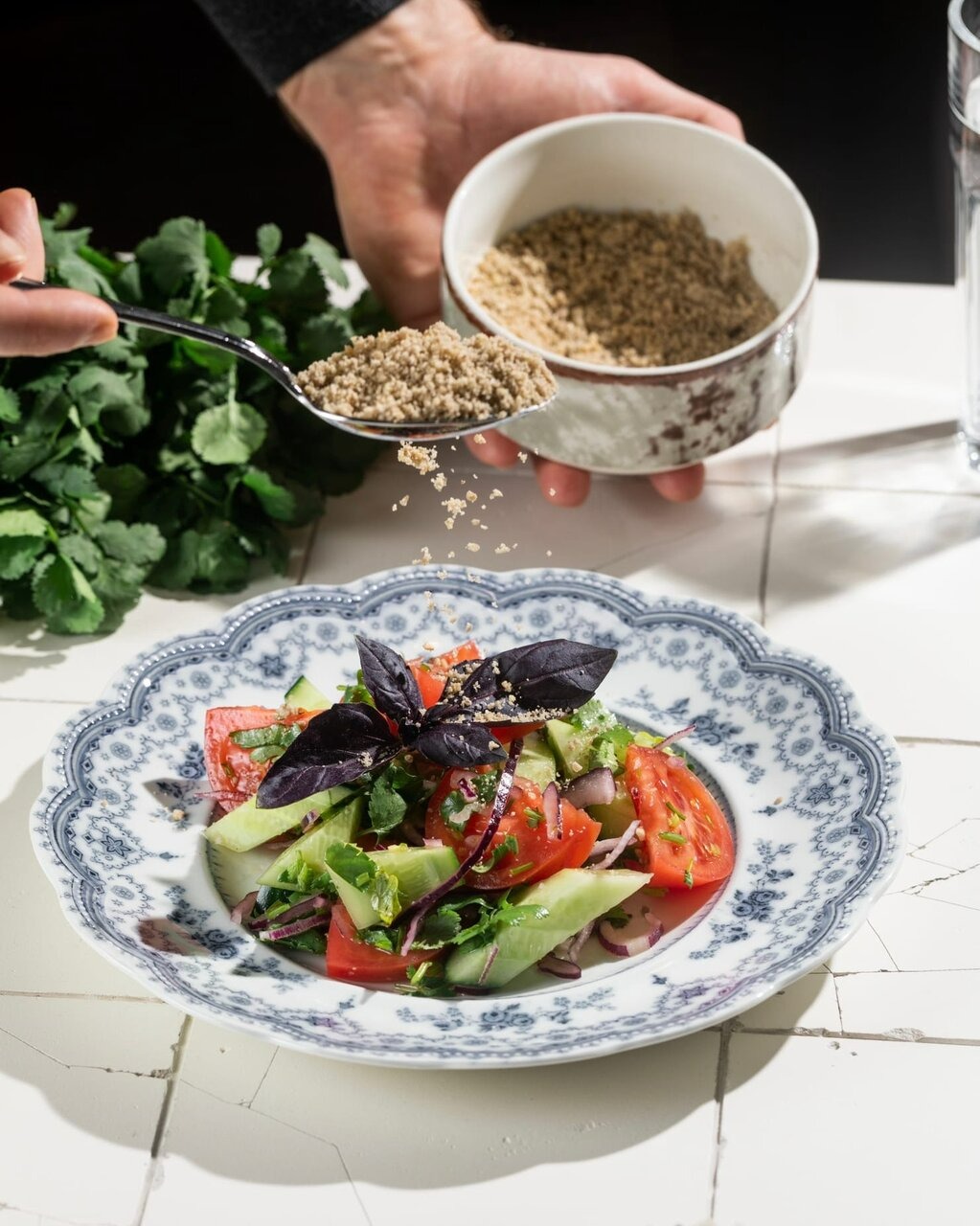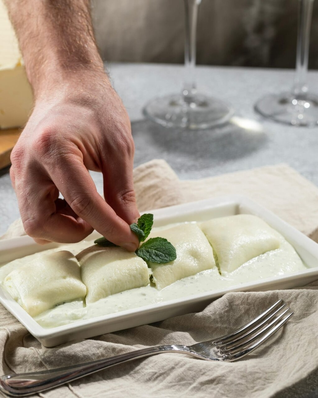 Еда и напитки. В меню — традиционные грузинские блюда: сациви из курицы, салат с языком в медово-горчичном соусе, хачапури по-царски и слоеный вариант, говядина по-грузински и стейк из семги по-тбилисски.