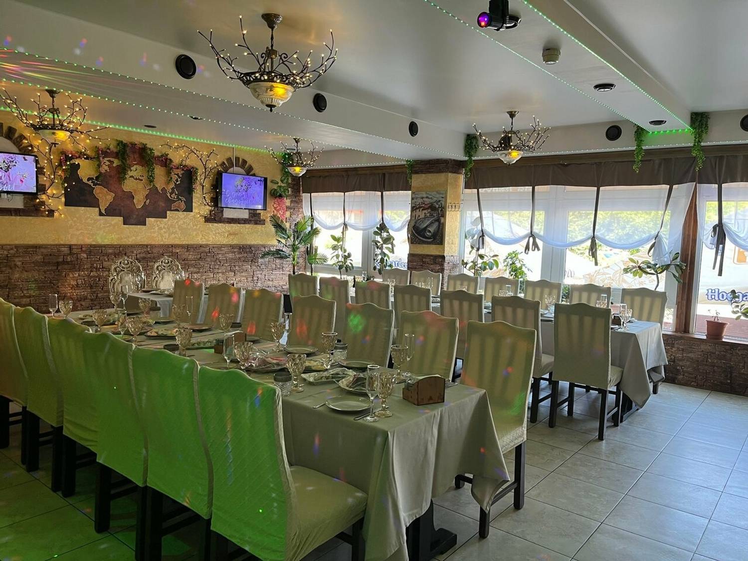 Еда и напитки. В меню — аппетитный шашлык на углях, хачапури, пицца, ароматные рулетики из баклажанов, салаты, ассорти и соусы. А из десертов предлагают чизкейк и шоколадный торт.