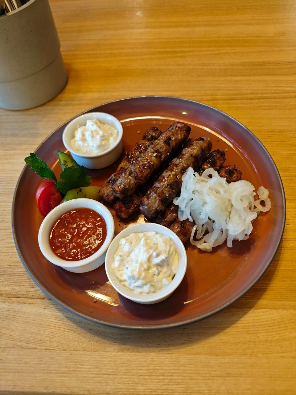 Еда и напитки. В меню — паприкаш из трески, плескавица, сербская пека, караджорджева, суп-гуляш из говядины. Из сладкого есть чизкейк с соусом из манго и якаранда в половинке ананаса.