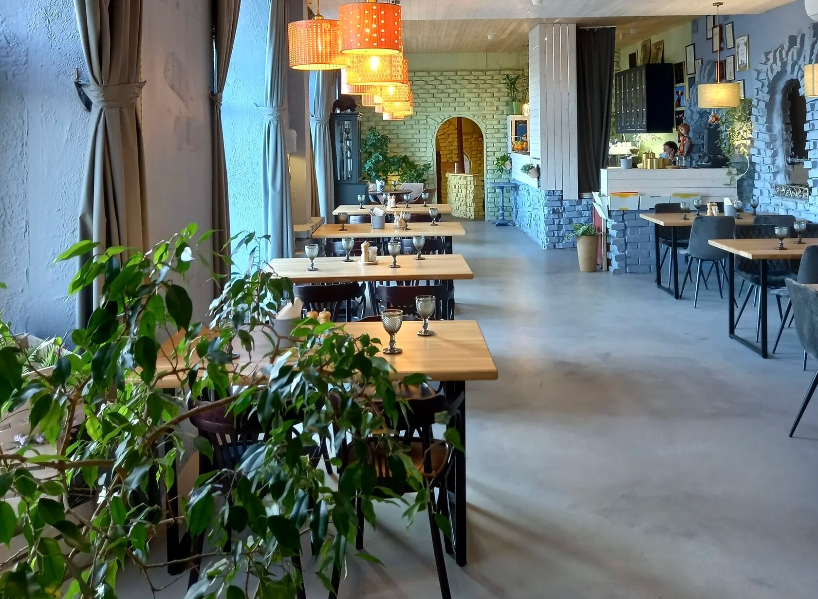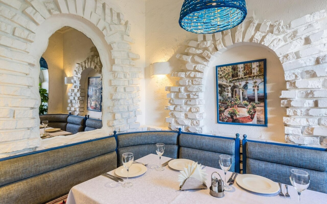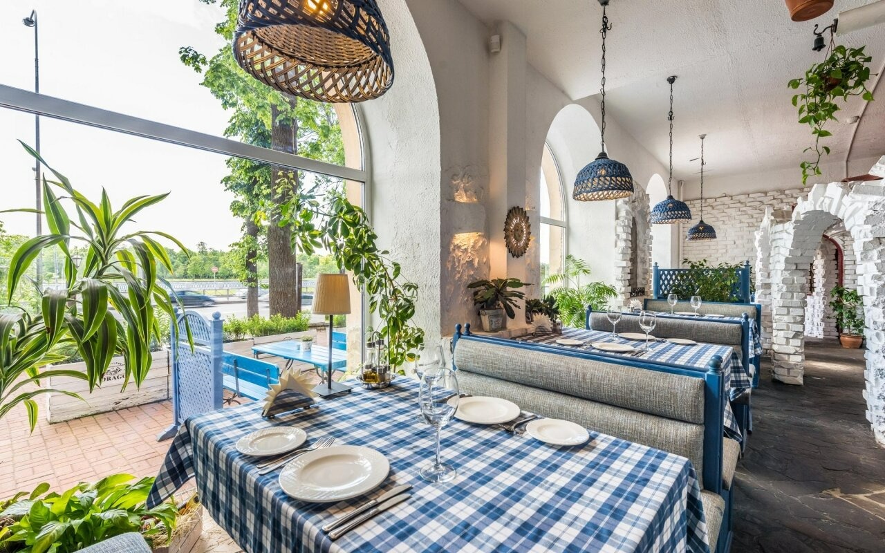 Атмосфера. Интерьер воссоздает дух адриатического побережья: беленые стены с лепниной, кирпичные арки и ярко-голубые акценты в плетеных оградах, скатертях в клетку и люстрах-сетях. Растения, шкаф с винной коллекцией и летняя терраса дополняют курортную эстетику.