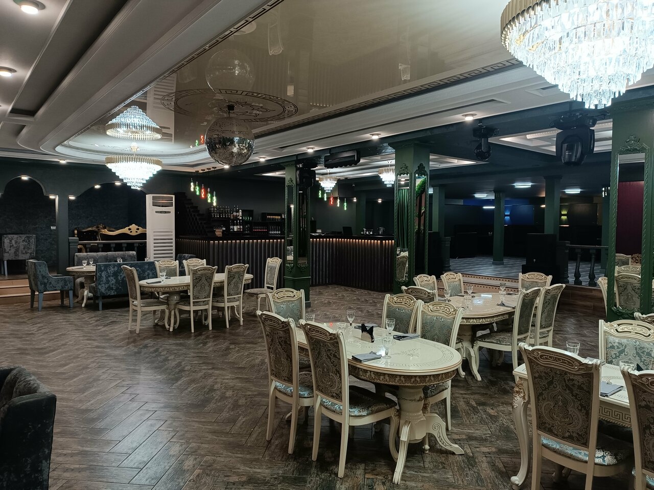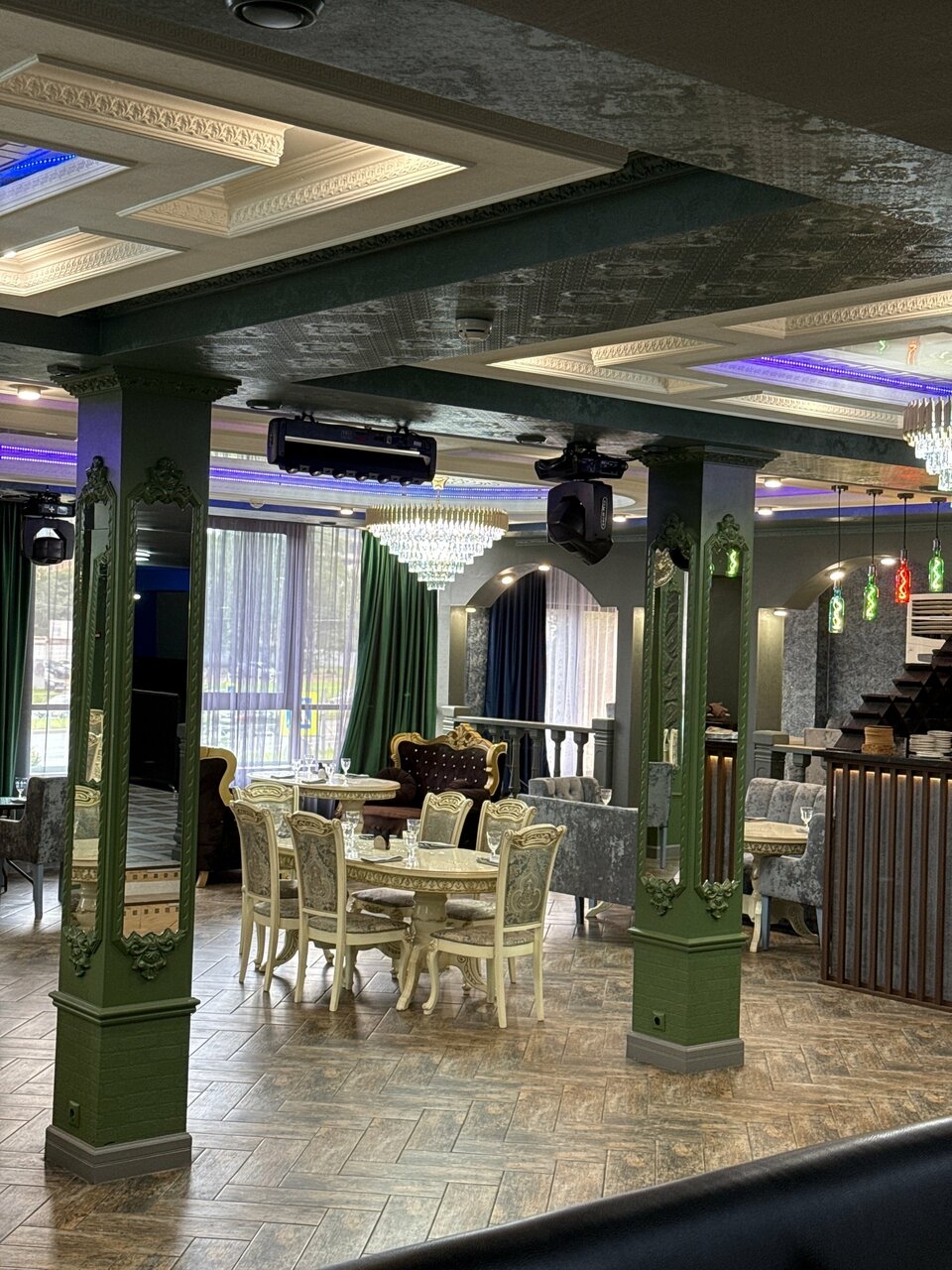 Атмосфера. Интерьер выполнен хотя и сдержанно, но с намеком на роскошь: с красивыми белыми столами и стульями, темно-зелеными колоннами с зеркалами и хрустальными люстрами. В просторном пространстве хватит места для любой большой компании.