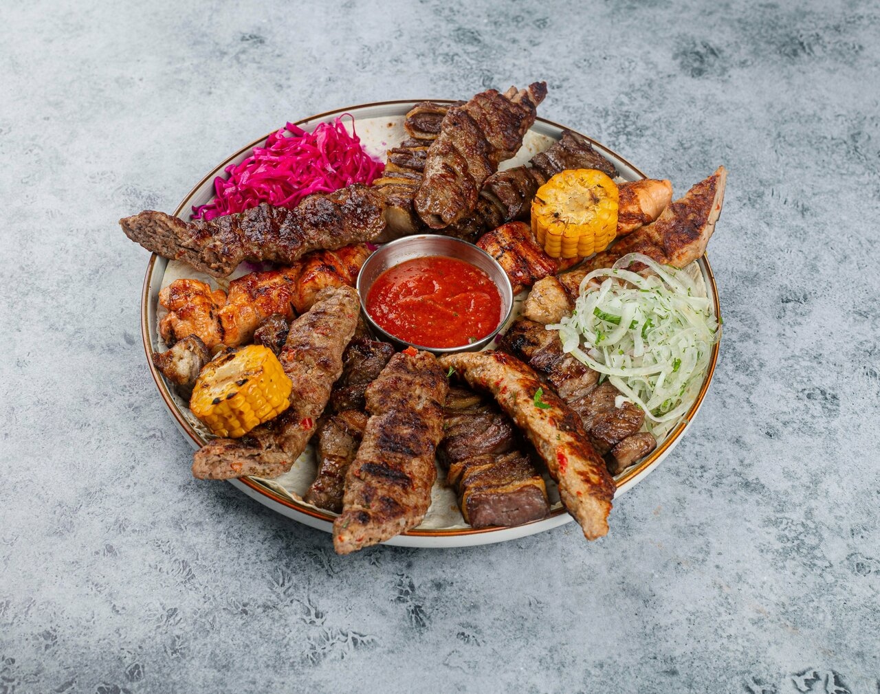 Еда и напитки. В меню — шашлык из баранины и курицы, запеченный сыр, гренки, манты и долма. А на десерт классический чизкейк, покрытый карамелью.