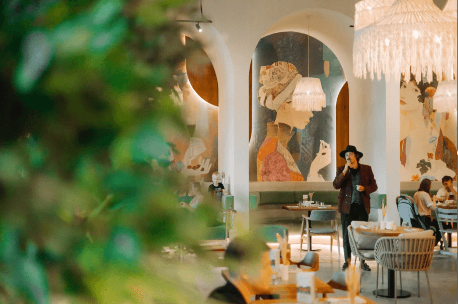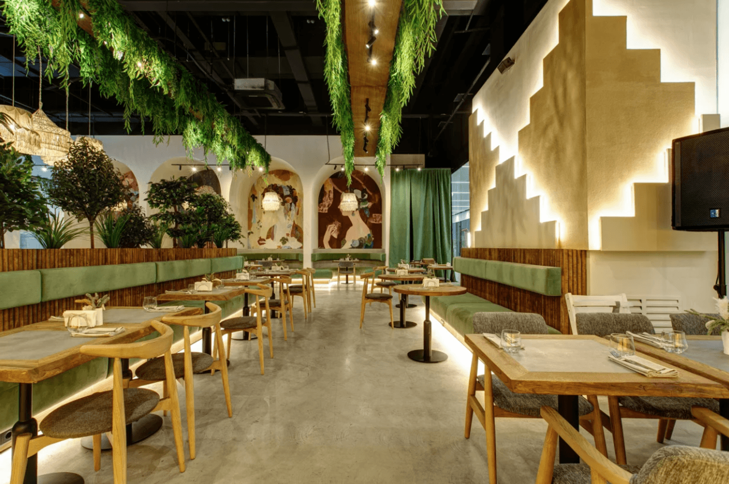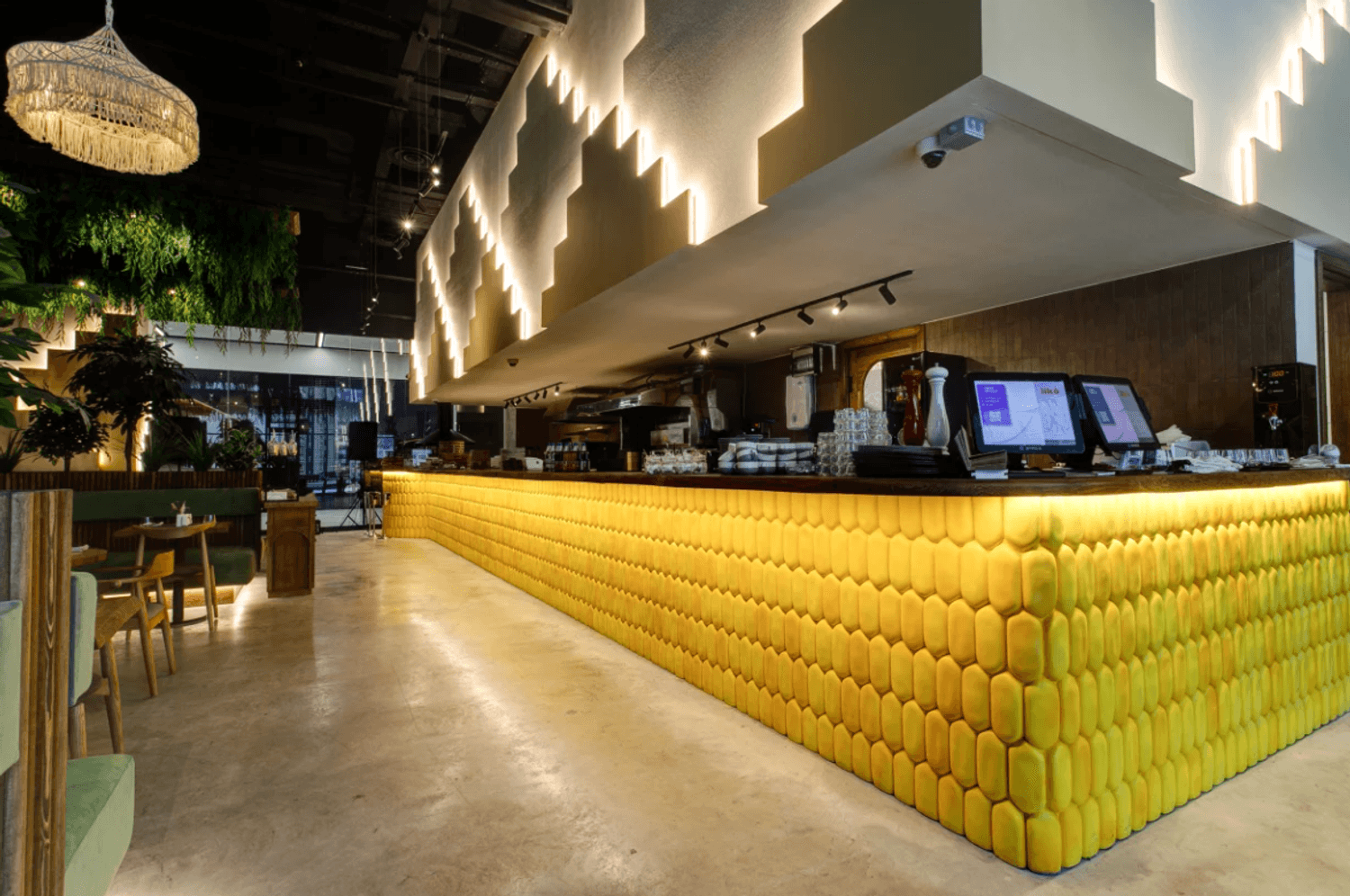 Атмосфера. Большой зал в кремовых и зеленых тонах наполнен светом и растениями. Разноуровневые мягкие зоны позволяют выбрать уединенное место для встреч с друзьями или комфортный уголок для семейного ужина. Для детей оборудовали трехэтажное пространство с игровой зоной, где маленькие гости находятся под присмотром, пока взрослые отдыхают за обедом или ужином.