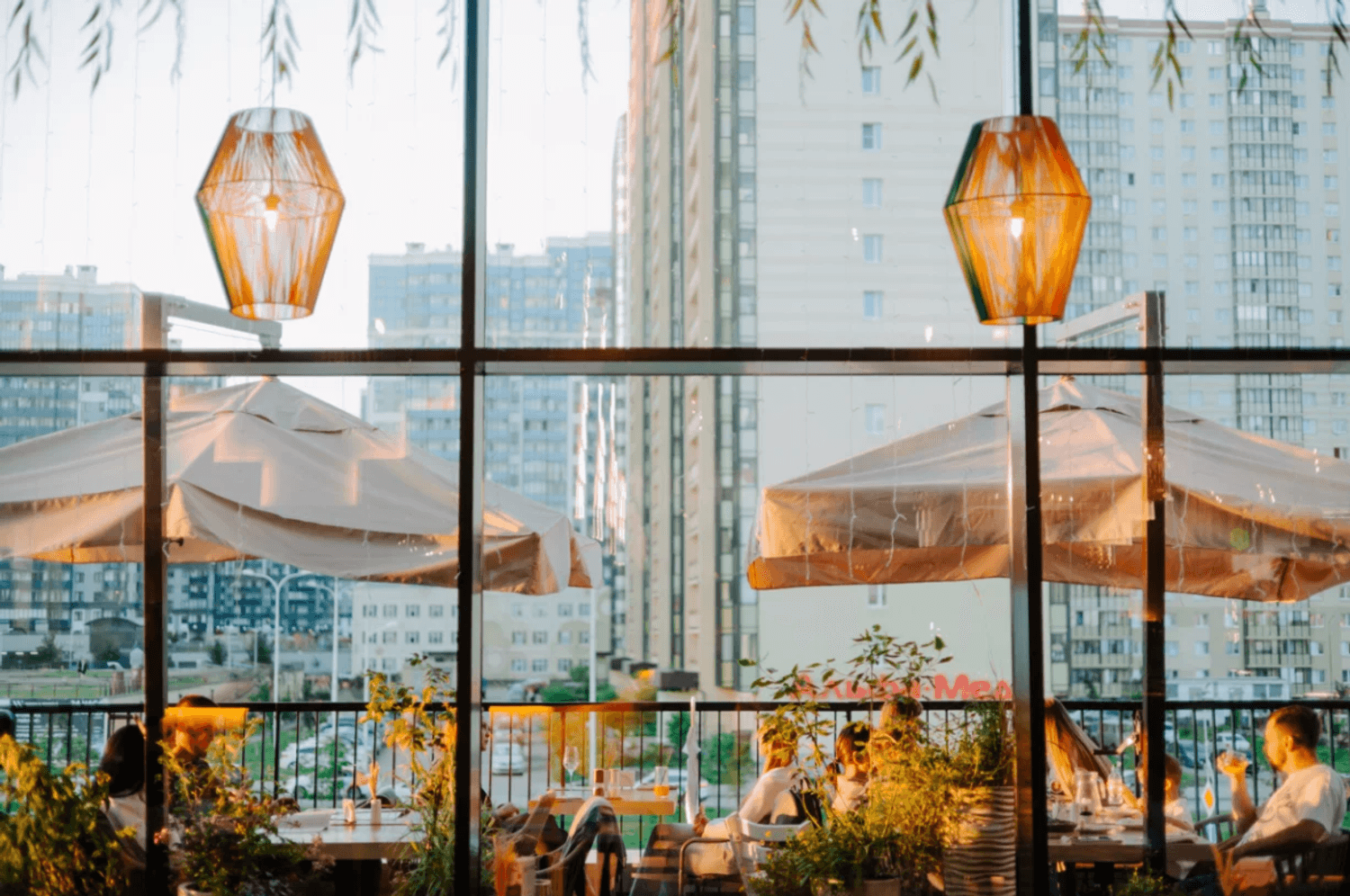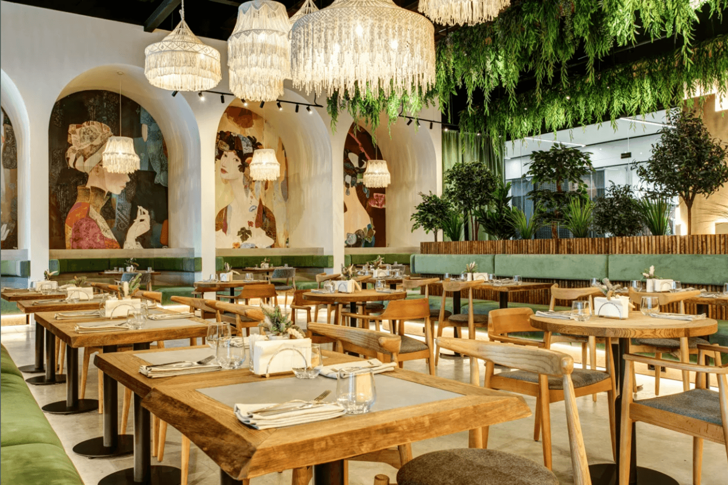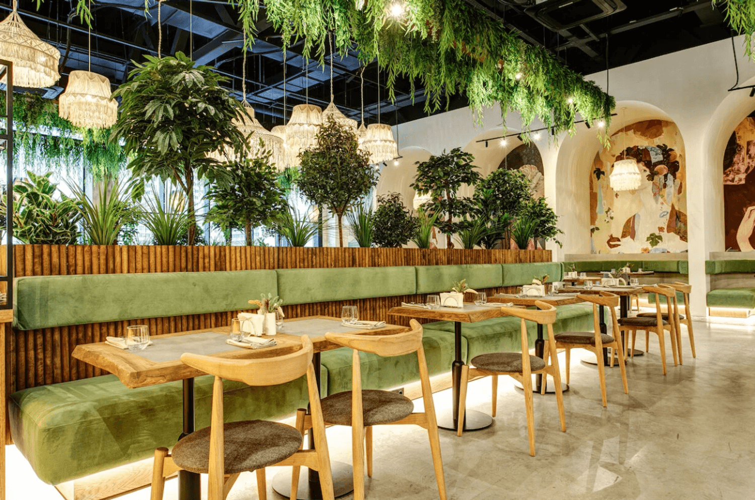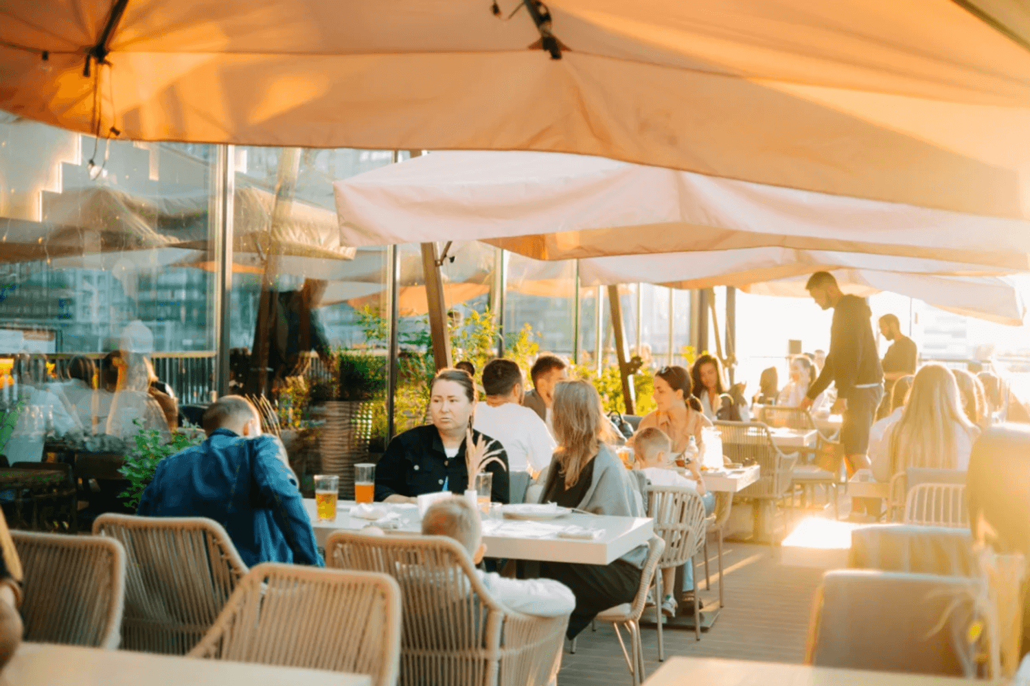 Атмосфера. Большой зал в кремовых и зеленых тонах наполнен светом и растениями. Разноуровневые мягкие зоны позволяют выбрать уединенное место для встреч с друзьями или комфортный уголок для семейного ужина. Для детей оборудовали трехэтажное пространство с игровой зоной, где маленькие гости находятся под присмотром, пока взрослые отдыхают за обедом или ужином.