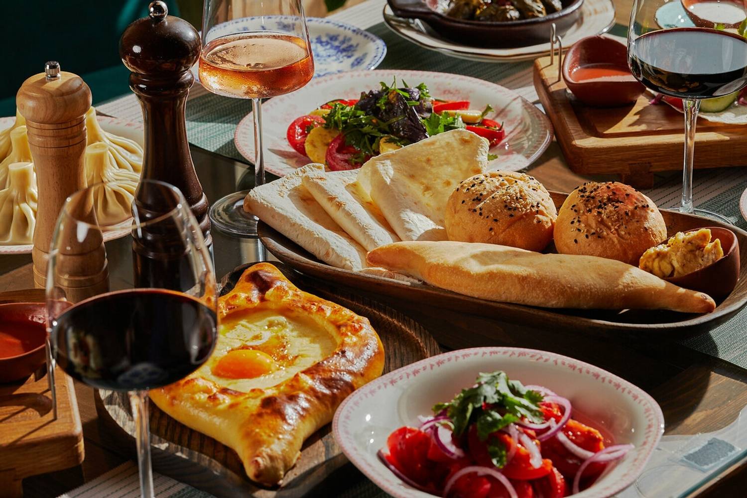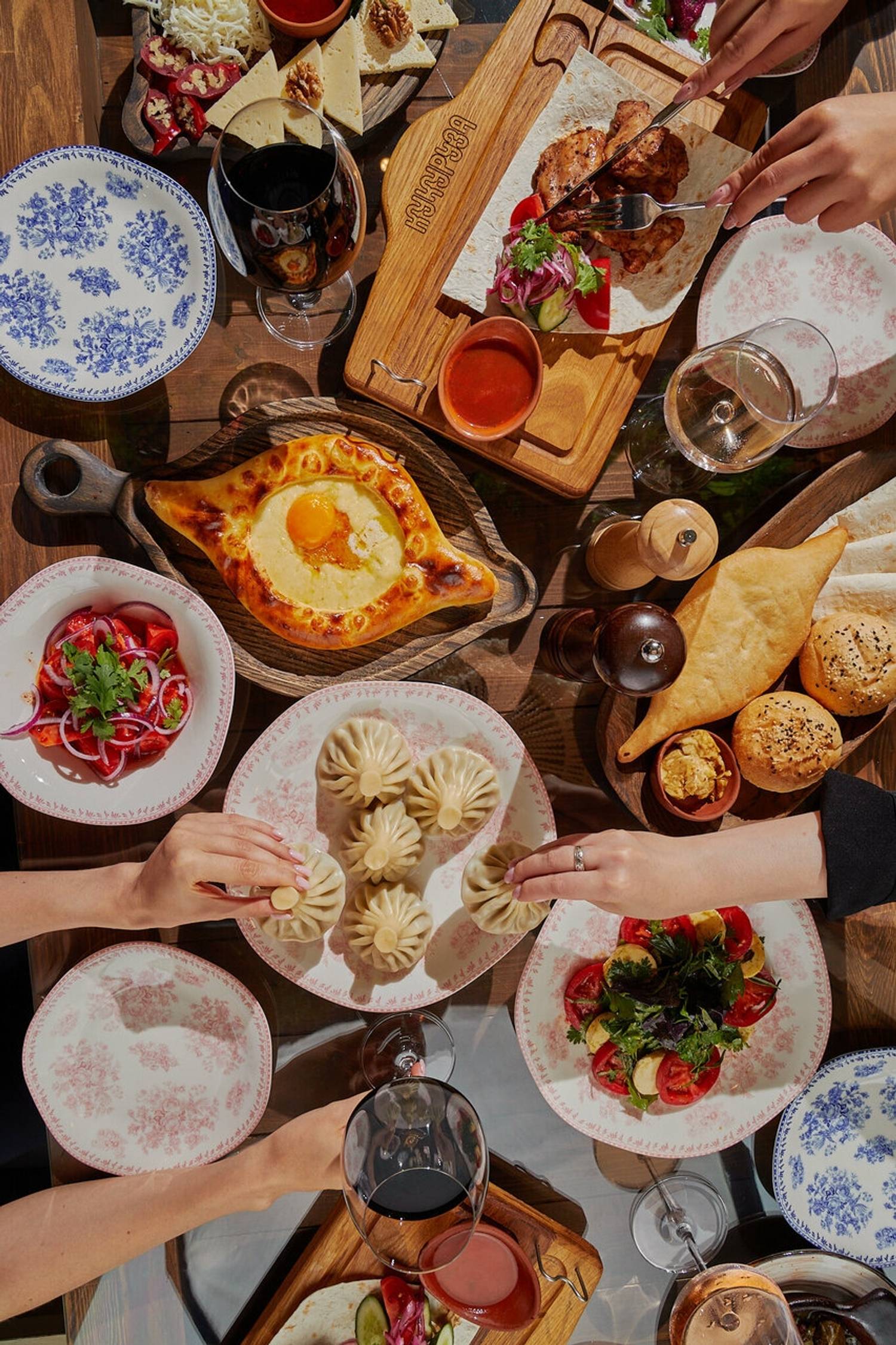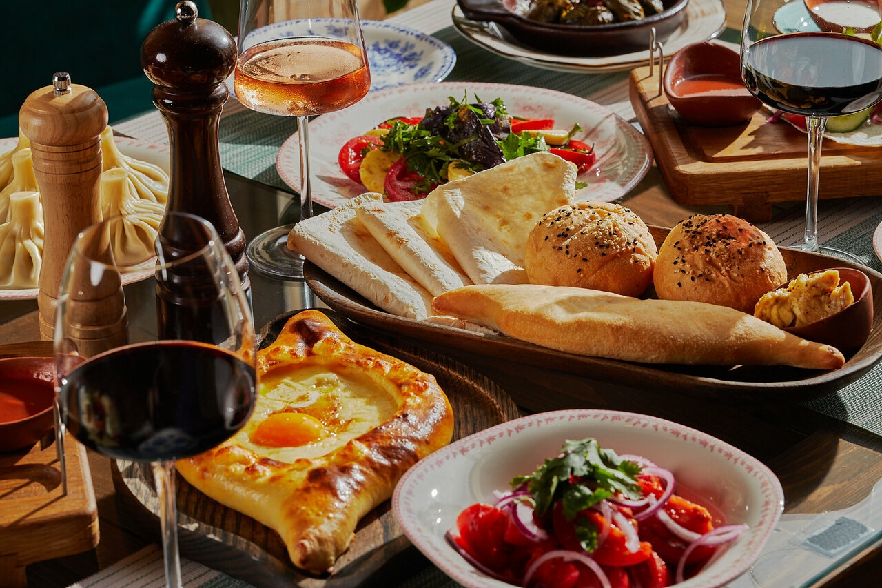 Еда и напитки. Меню сочетает традиционные грузинские блюда и европейские позиции: подают хачапури, хинкали, кутабы, пасты, ризотто и салаты со страчателлой. Особое внимание уделено грилю, мангалу и блюдам из тандыра, а также намазкам — мухаммара, бабагануш и лабне с травами и томатами. Гостям предлагают вина, коктейли, пиво и безалкогольные напитки.
