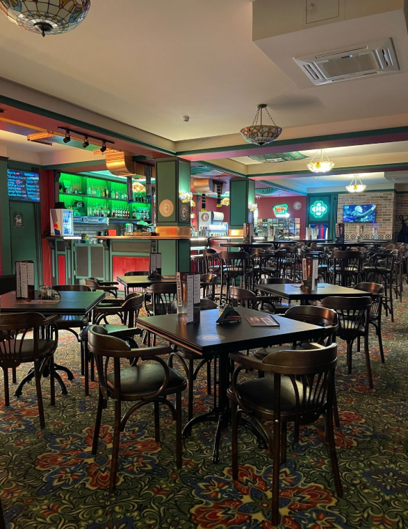 Атмосфера. Интерьер выполнен в красно-зеленых тонах типичного европейского паба. В зале есть кикер и регулярно проходят концерты с живой музыкой, так что уют и веселый ирландский вайб гарантированы.
