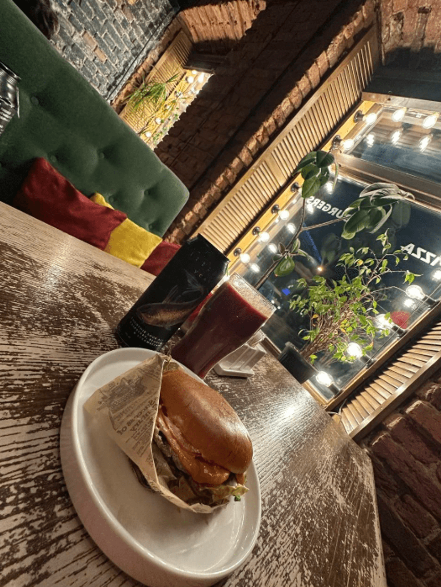 Еда и напитки. В меню — аппетитные закуски: стрипсы, креветки панко, чесночные гренки. На горячее подают сытную мясную пиццу или гринчбургер. А из напитков — разливное пиво и сидр.
