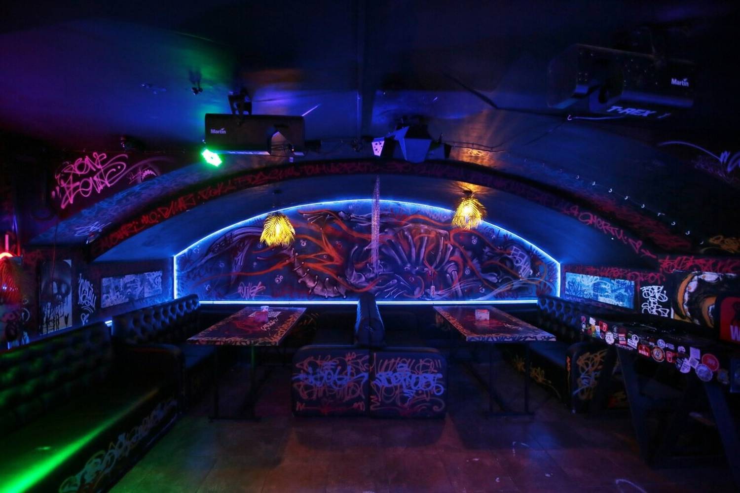 Атмосфера. Неоновые вывески и ленты привлекают внимание и сами по себе, но и заодно подсвечивает расписанную в стиле граффити мебель. Здесь можно подпевать любимым трекам, сидя на мягком диване, или зажигать на танцполе.