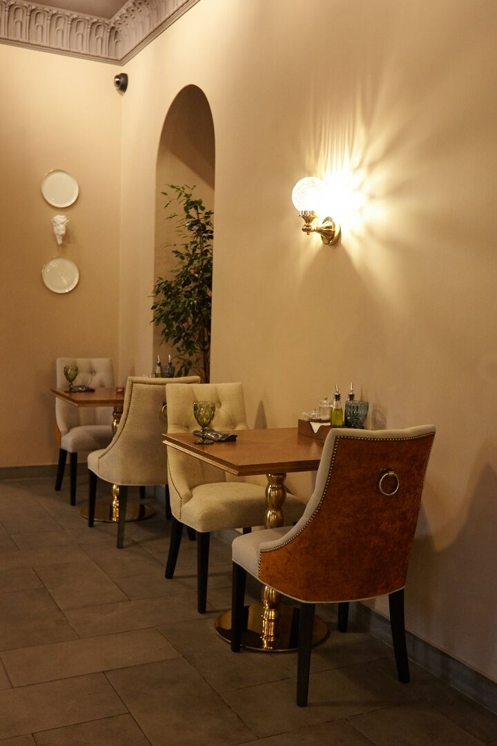 Атмосфера. Пространство сочетает элементы лофта с художественной штукатуркой и аутентичные детали: домотканые ковры, золотые акценты и пышную зелень. Здесь три зала разного формата, включая вип-локации, которые подходят как для романтических ужинов, так и для деловых встреч. Каждый вечер атмосферу дополняет живая музыка.