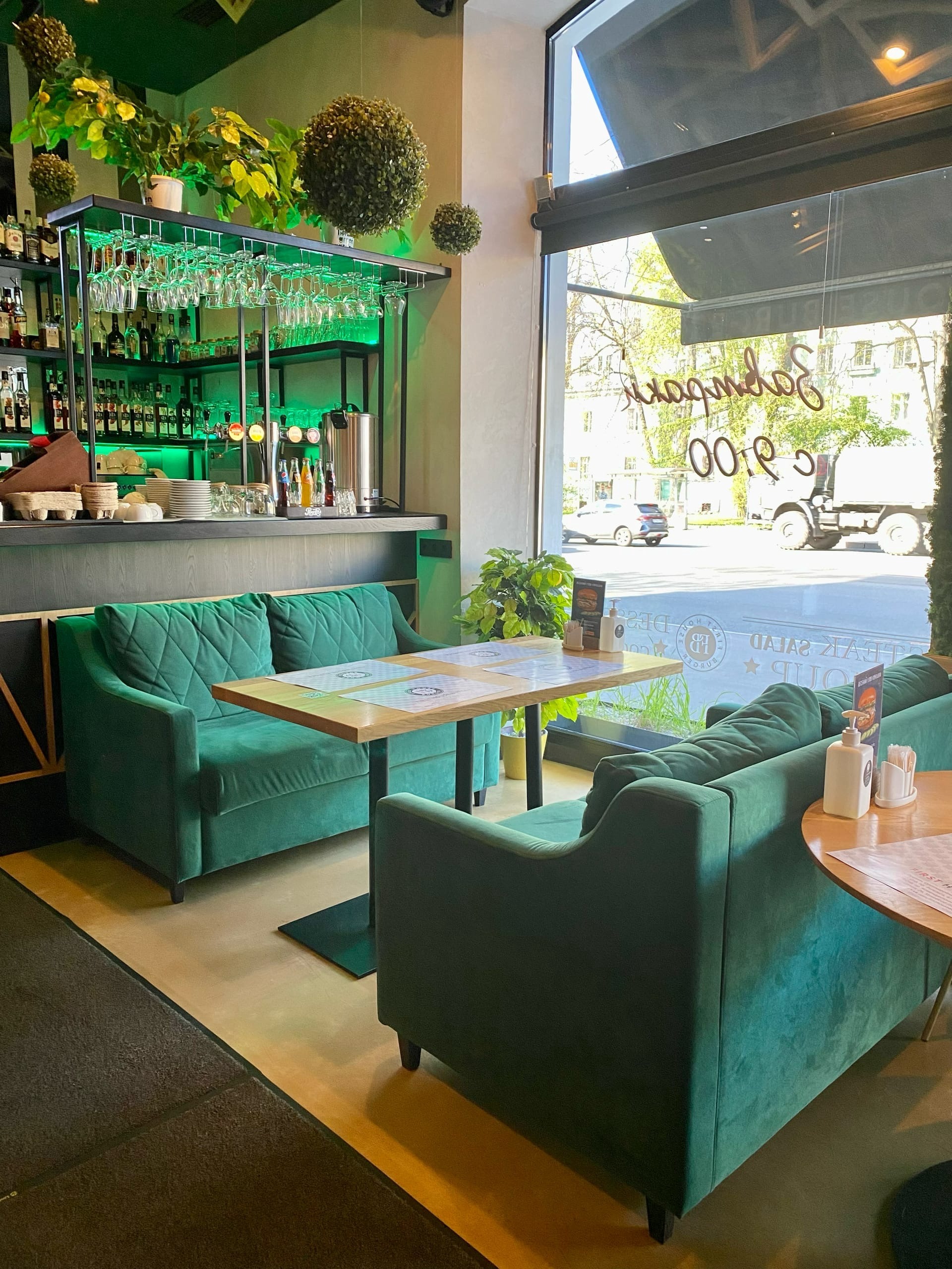 Атмосфера. Интерьер в стиле индустриального лофта сочетает грубоватую эстетику с продуманным комфортом: фактурные кирпичные стены контрастируют с бархатными диванами и деревянными столами. А стены с зелеными растениями придают пространству свежести.